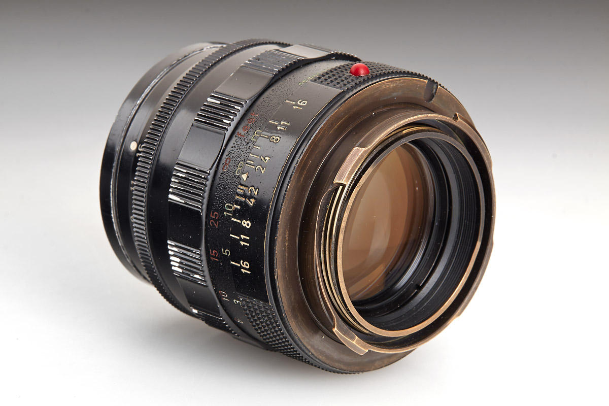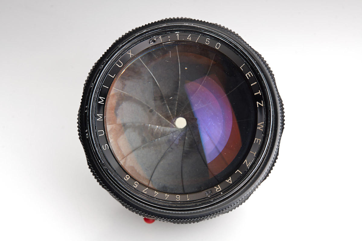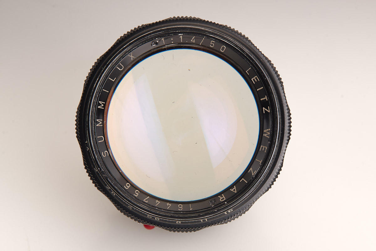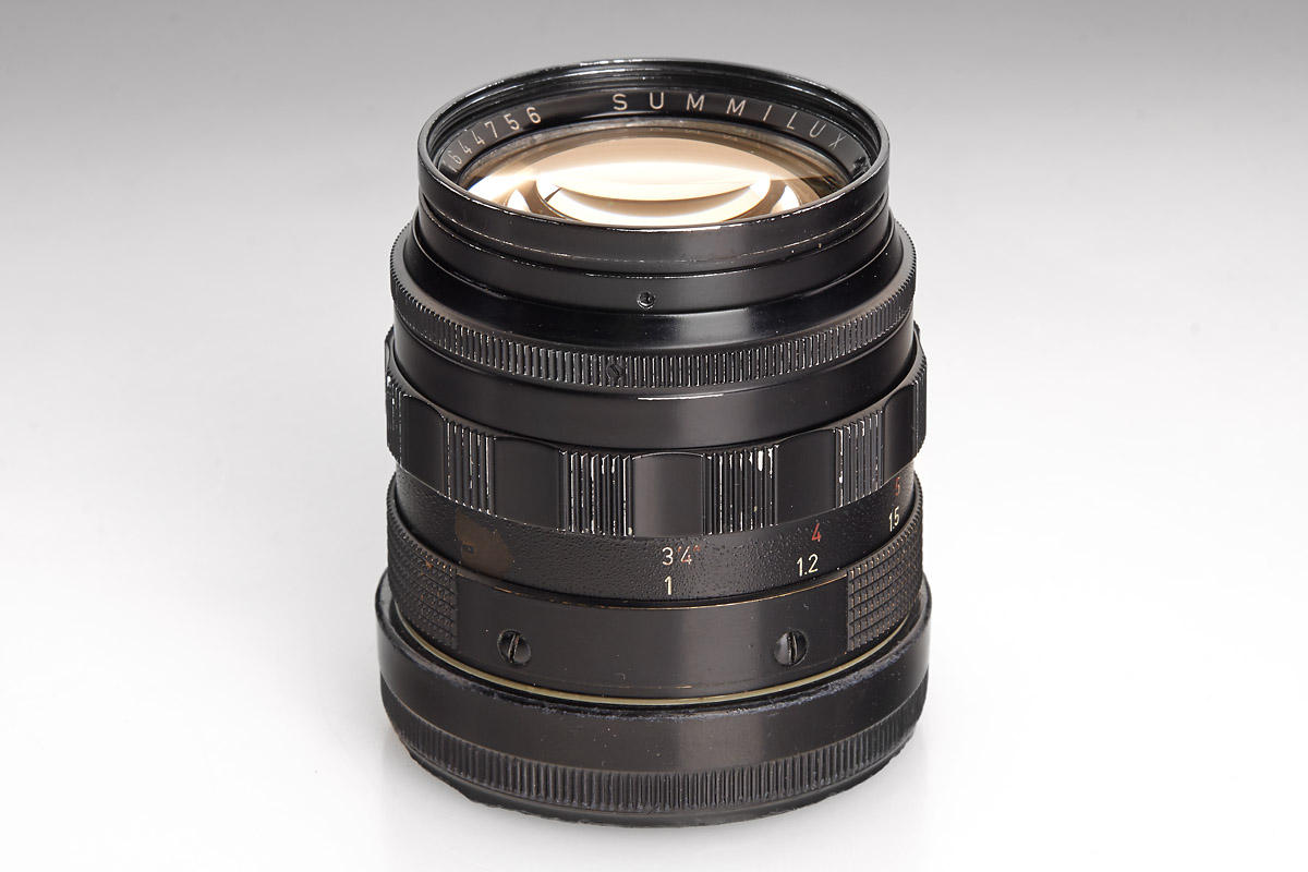 A very early and 100% original black paint 50 mm Summilux f/1.4 lens with brass bayonet, clean optics, caps. LITERATURE James L. Lager (ed.), Leica Illustrated History, Vol. II, 1994, p. 172. For the rare black paint finish versions of the early Leica M models M3, MP and M2, a small selection of lenses were also supplied in black, at a time when Leica lenses were generally finished in silver chrome. Those scarce early black-paint finished Leica M lenses were only produced in very small quantities and seem to be rarer than the camera bodies as such. Most probably, this is because some of the photographers with black-paint M cameras chose lens types which were not available in black paint finish at all, such as the Elmar 50 and 90 mm lenses. Even among the few rare lenses delivered in black, a number of variations has appeared. Of particular interest are the earliest of those, which contain a bayonet flange made of brass without chrome plating. Instead it shows a “blue stained” black surface, which turns brownish/black when the brass underneath shines through with increasing use and wear. The two following lots are such early black M lenses with black bayonets. Für die seltenen schwarz lackierten Versionen der frühen Leica M Modelle M3, MP und M2 wurden vereinzelt auch schwarze Objektive geliefert. Die Leica Objektive waren zu dieser Zeit ansonsten generell silbern verchromt. Diese seltenen frühen schwarz lackierten Objektive wurden nur in sehr kleinen Stückzahlen produziert und scheinen rarer als die Kameragehäuse an sich – vermutlich aufgrund der Tatsache, dass sich doch viele Fotografen mit den schwarzen M Kameras für Objektive entschieden, die in schwarz überhaupt nicht angeboten wurden, wie etwa die Elmar 50 und 90 mm Objektive. Selbst von den wenigen Objektiven, die in der seltenen schwarzen Ausführung geliefert wurden, sind eine Reihe von Varianten bekannt. Besonders interessant sind darunter die frühesten Versionen, bei denen das Objektivbajonett nicht verchromt wurde. Statt dessen wurde es „blau gebeizt“, was eine schwarze Oberfläche ergibt, die bräunlich schimmert, wenn das Messing aufgrund des Gebrauchs hindurchscheint. Bei den beiden folgenden Losen handelt es sich um solche frühen schwarzen M Objektive mit schwarzem Bajonett.