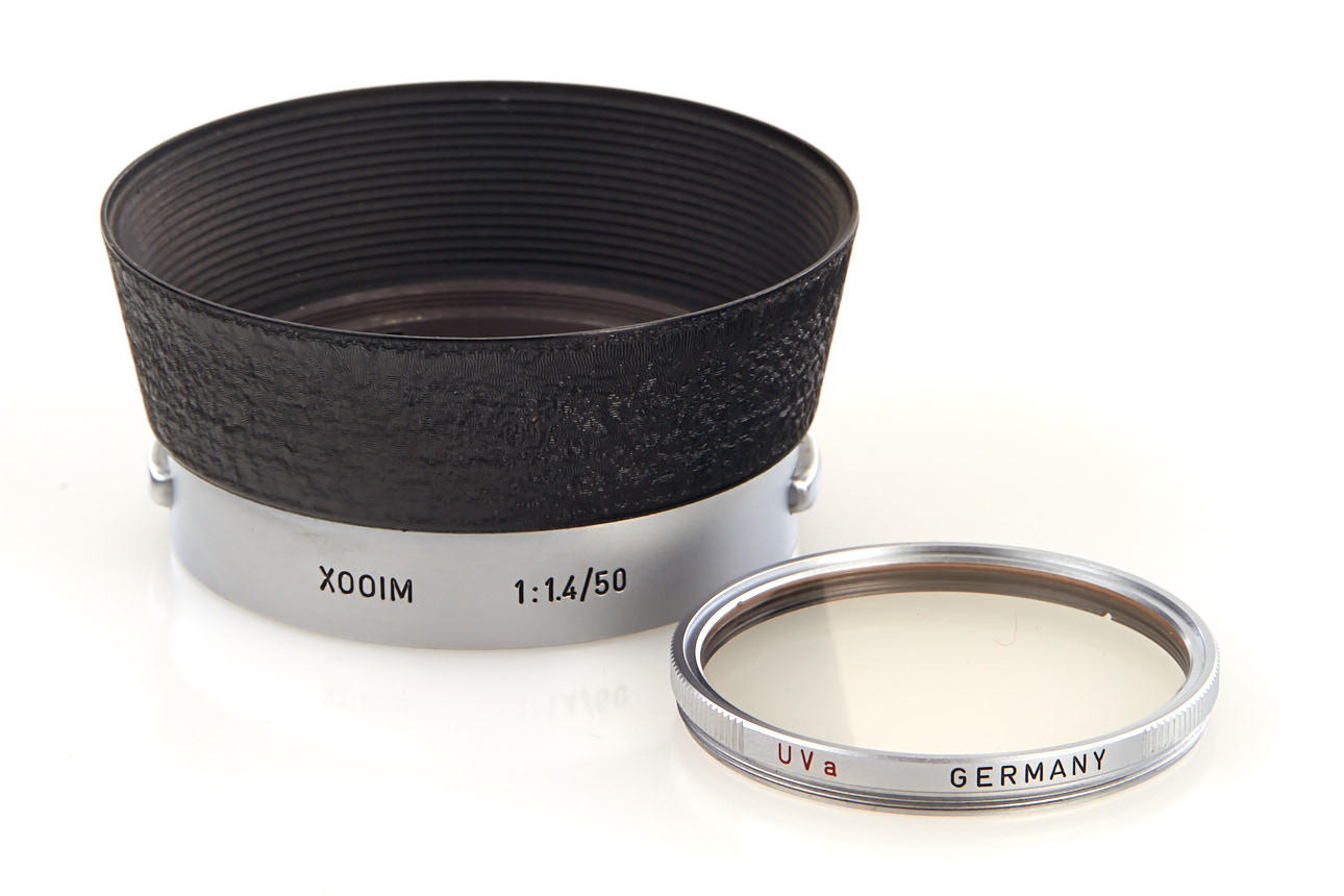 near mint Summilux for M with clear lenses, with original cap, Leitz UVa filter, XOOIM hood with cap, keeper