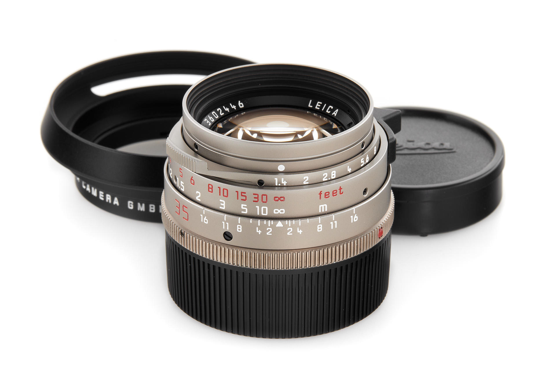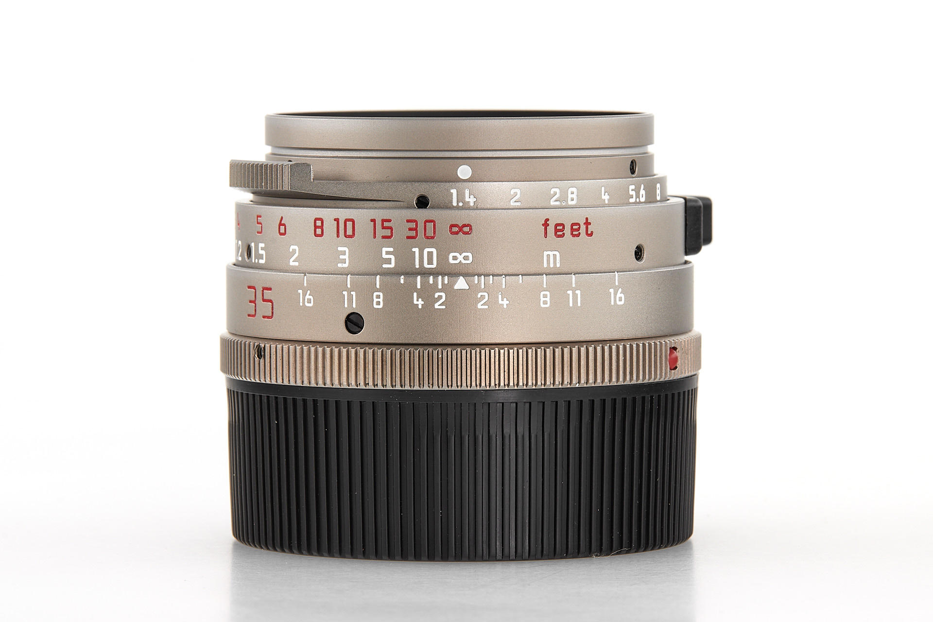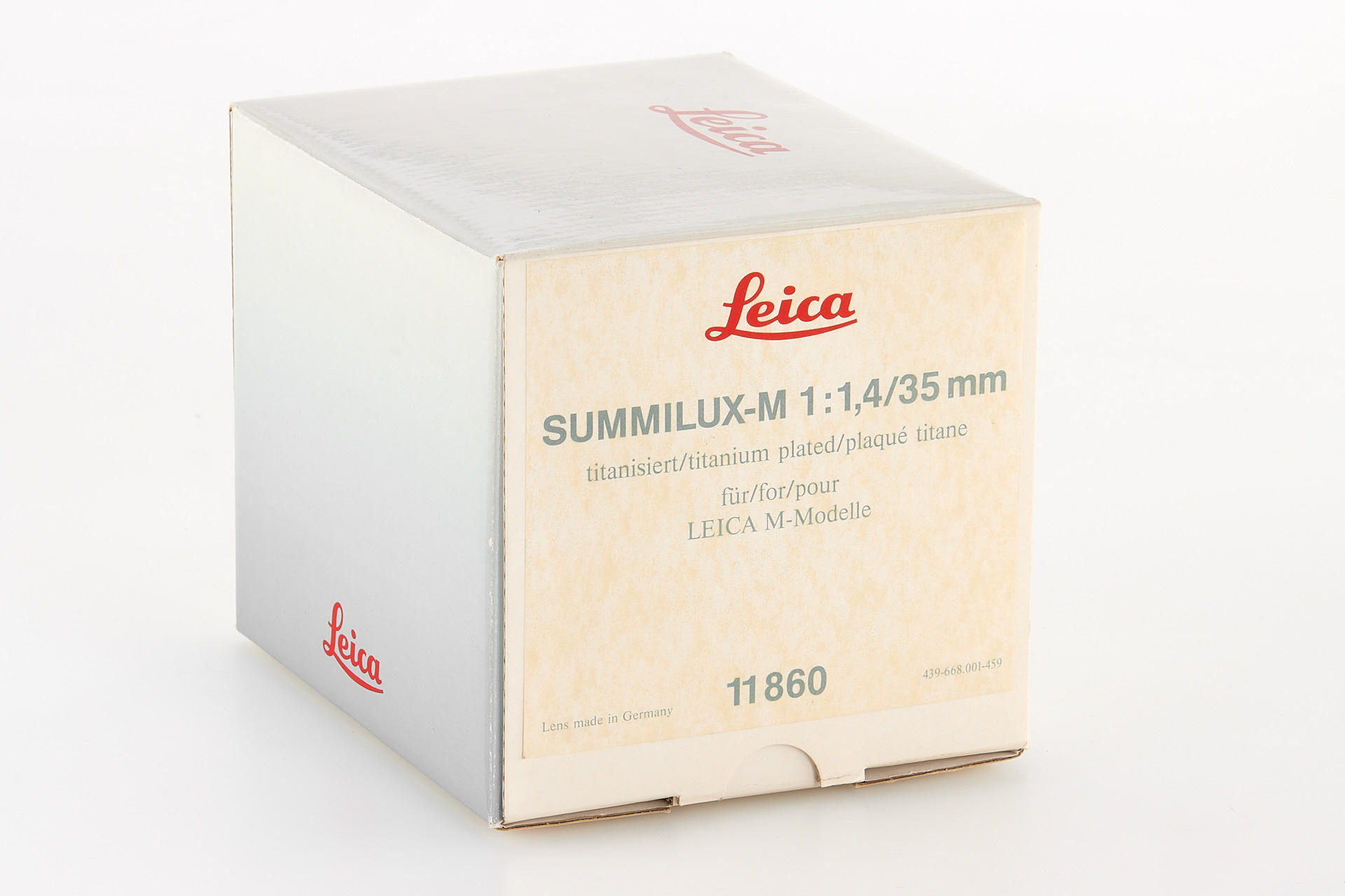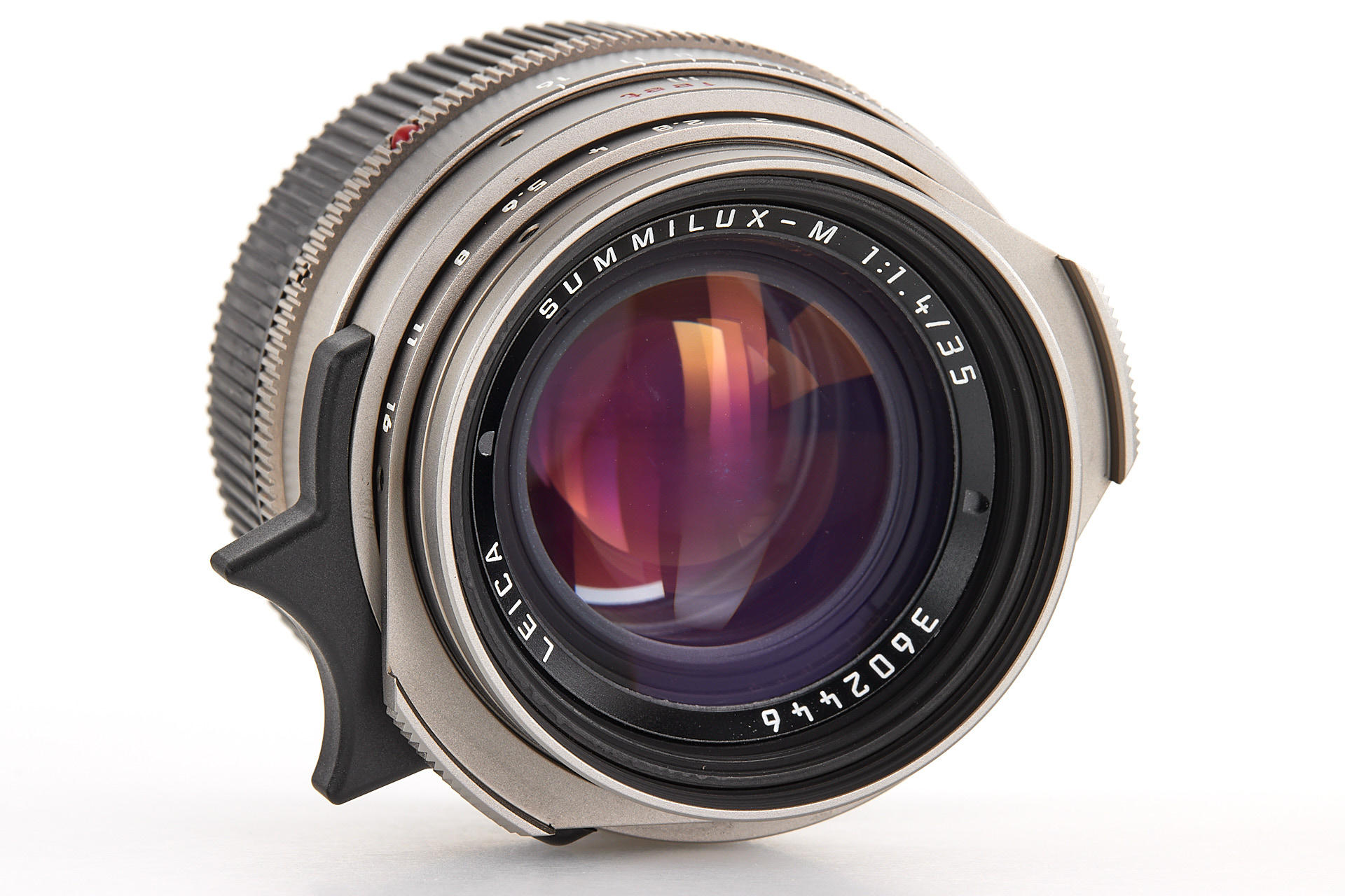 quite rare pre-Aspherical Titanium Summilux-M 1.4/35mm in mint condition, clean lenses, with 12504 hood, caps, leather keeper, warranty card and matching maker's box