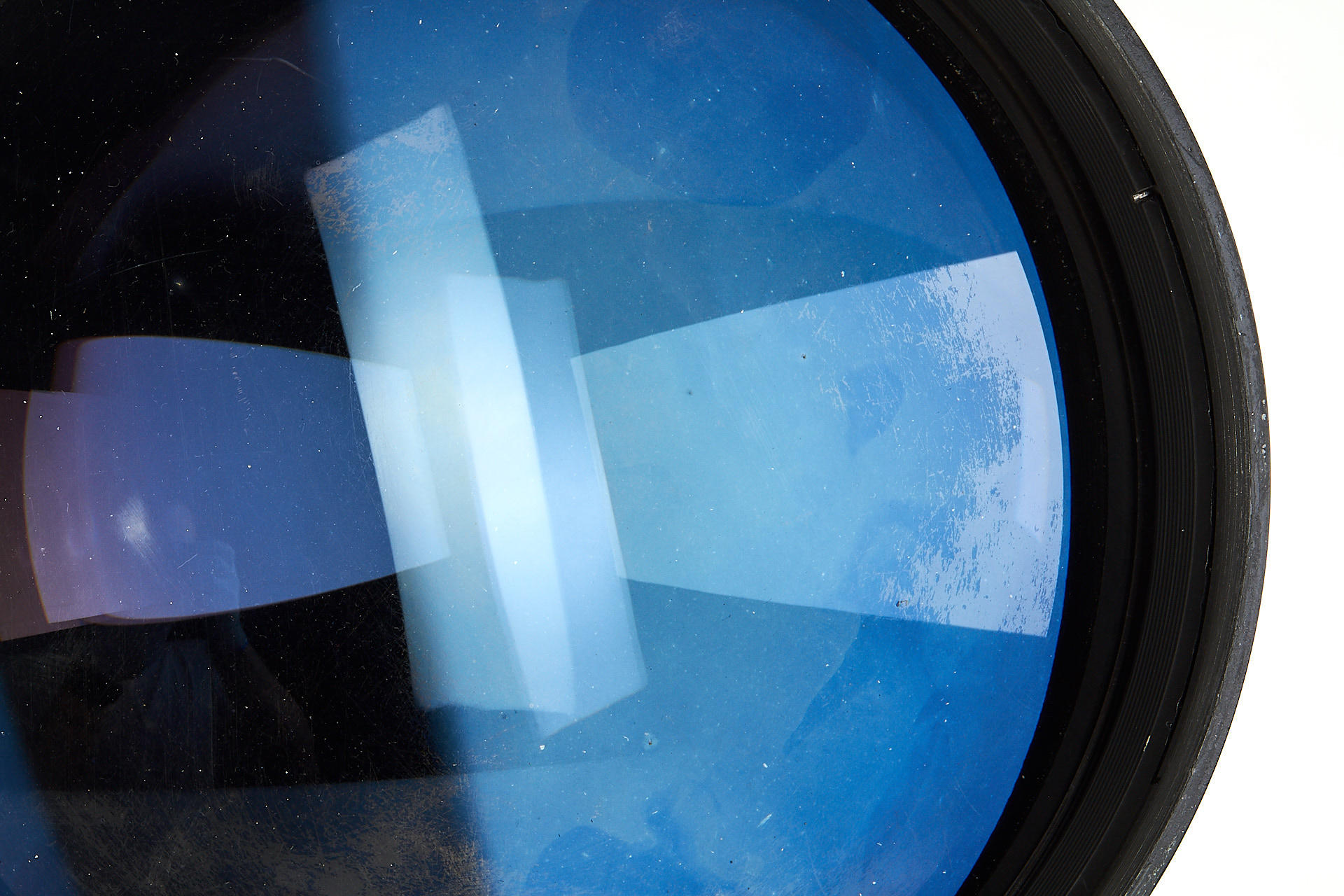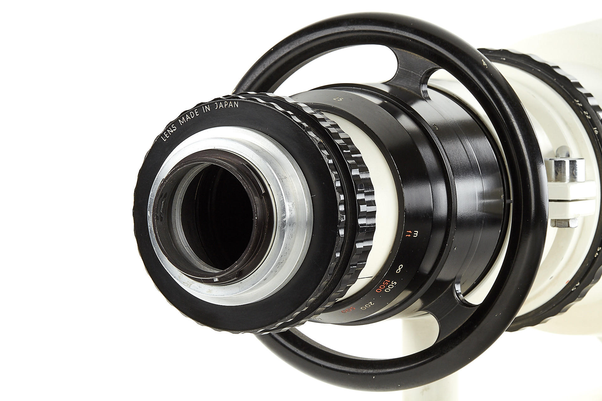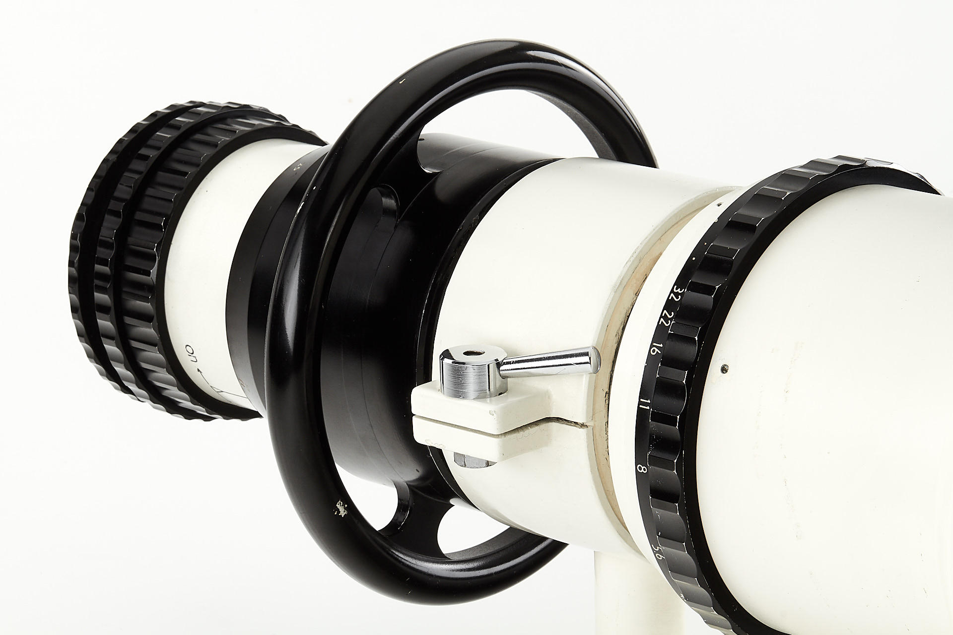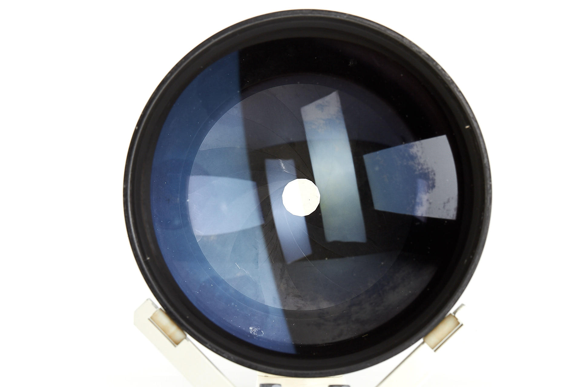 an extremely rare huge and fast telephoto lens, made to special order only, covering medium format 6x6cm(!), also sold under the dealer´s name Birns & Sawyer for the U.S. market, in excellent condition with good optics, total length 103cm, front element diameter 23cm, with front lens cap, Pentacon Six adapter and a special wooden case