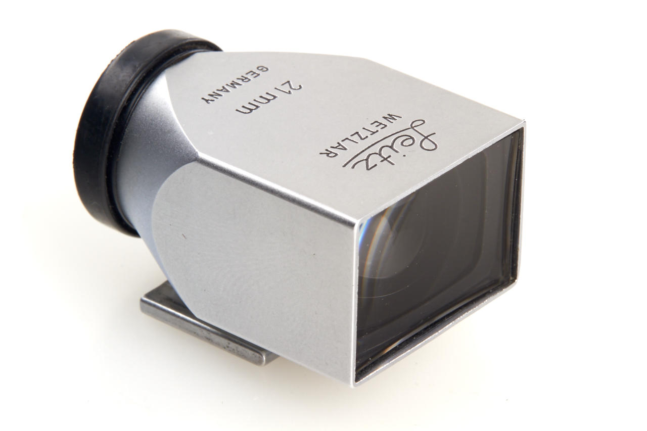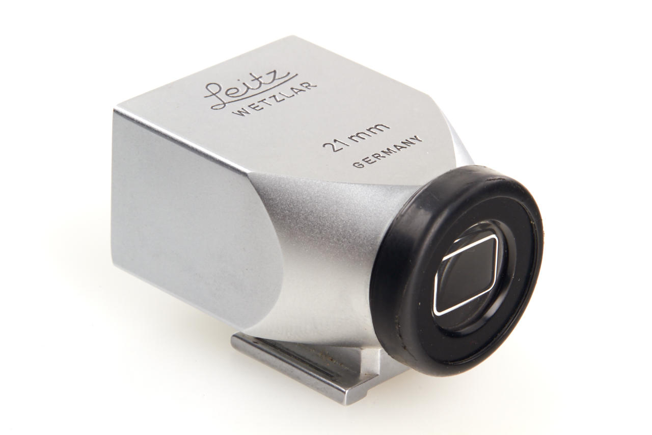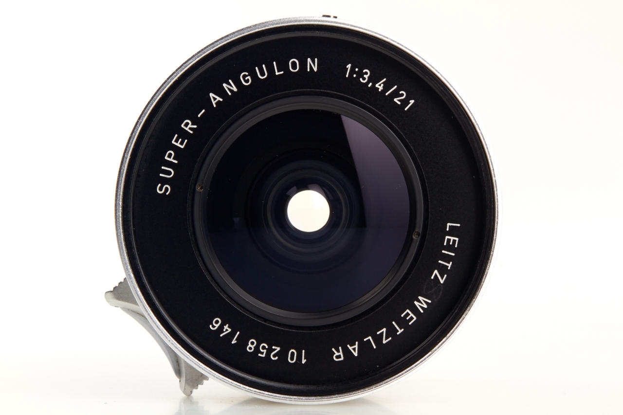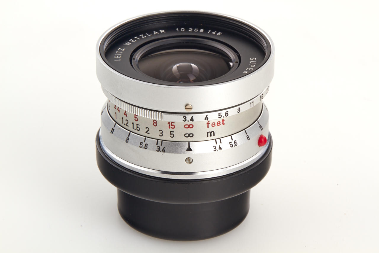Prototype lens by Schneider (different design to production model) in near mint condition, front ring engraved 'LEITZ WETZLAR SUPER-ANGULON 1:3,4/21 10 258 146', both caps, with chrome 21mm metal finder SBKOO in mint condition