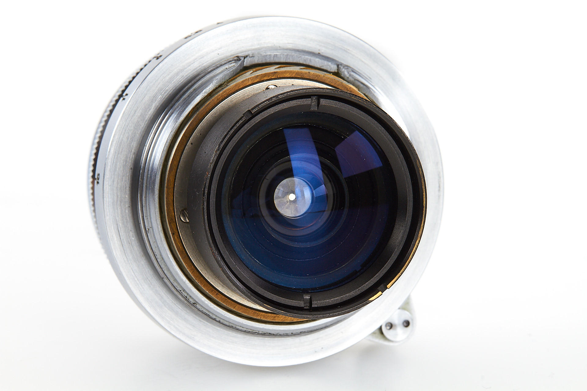 screw-mount lens in near-mint condition, with clean optics, both caps and matching IWKOO hood (with cap)