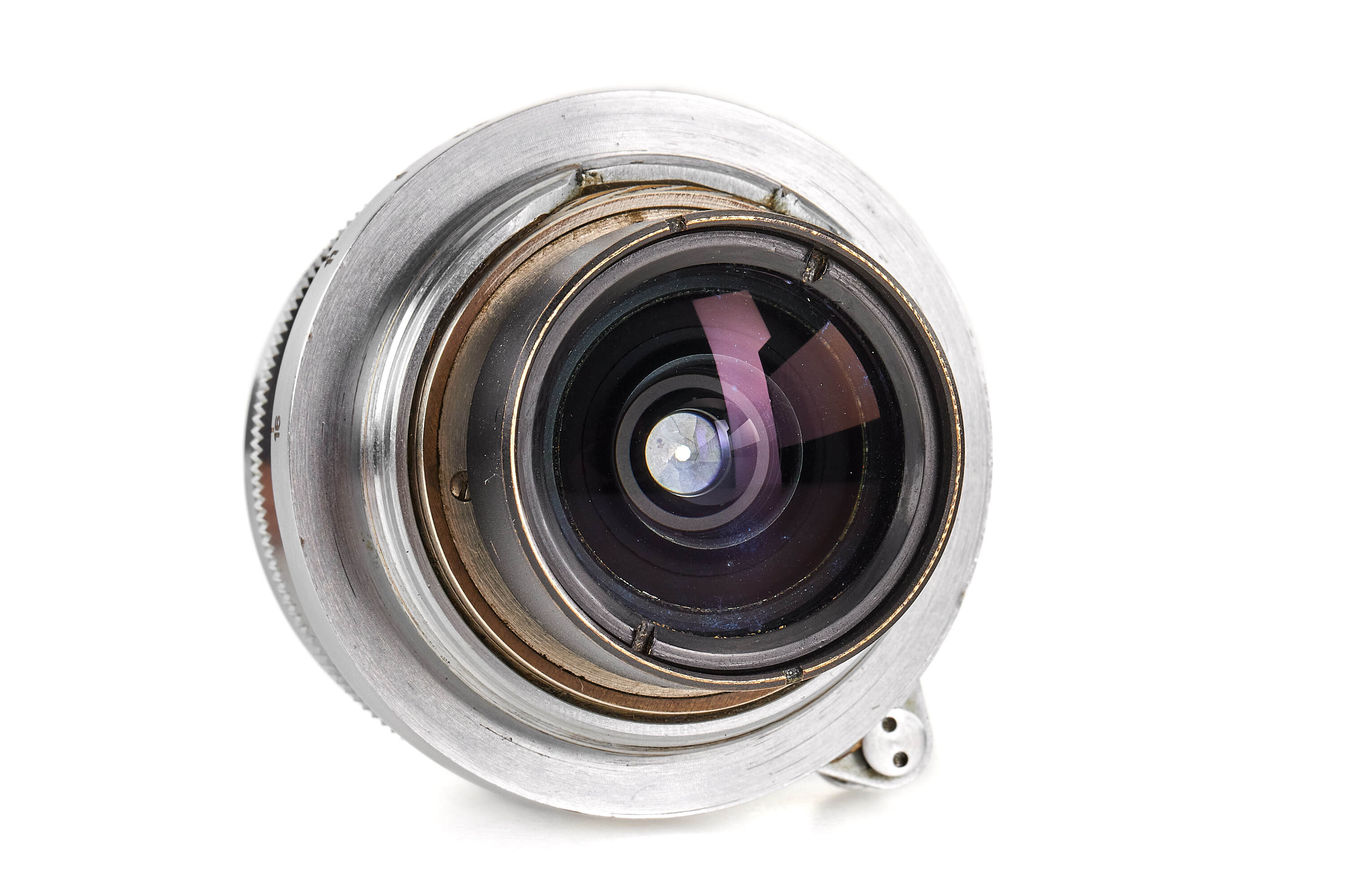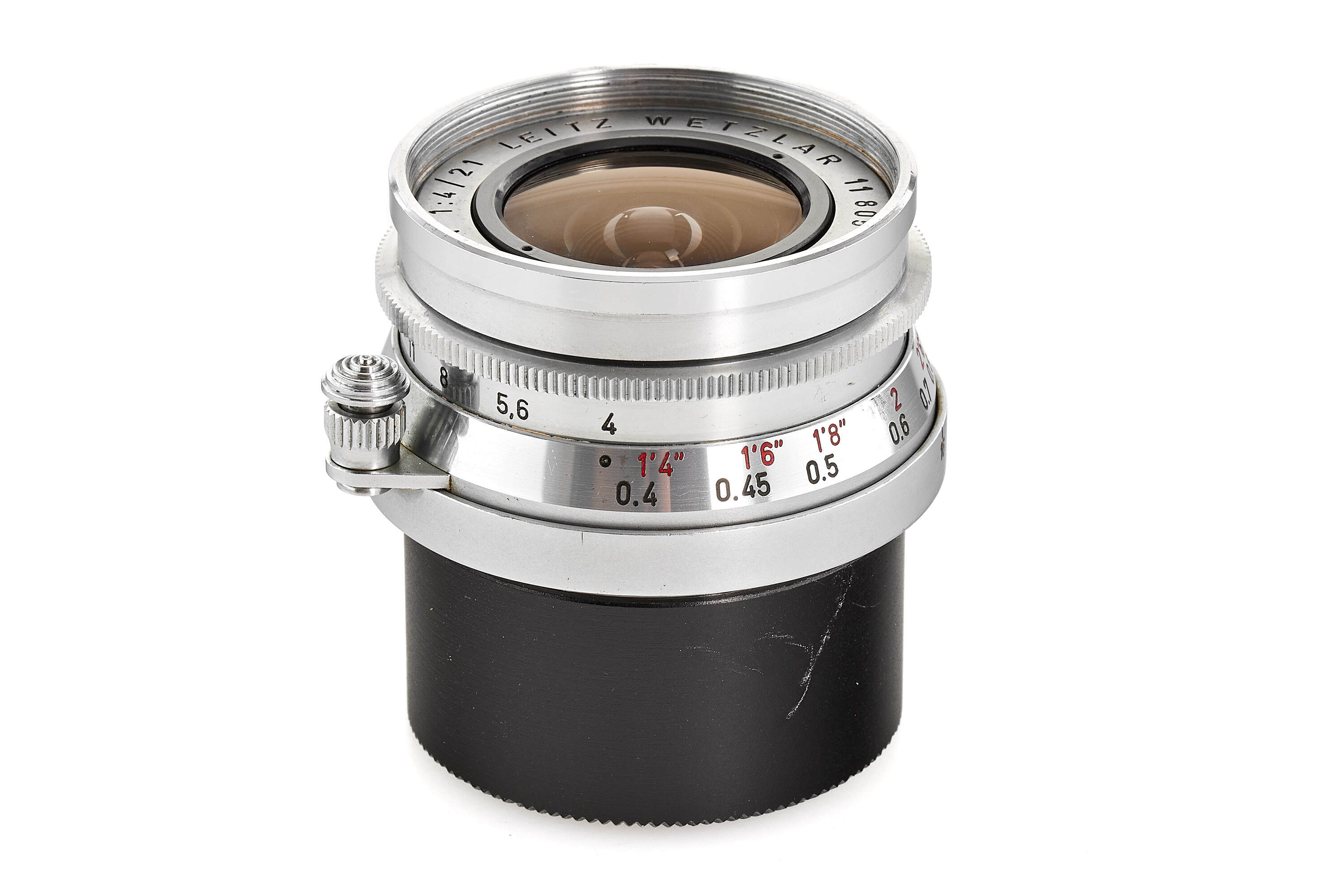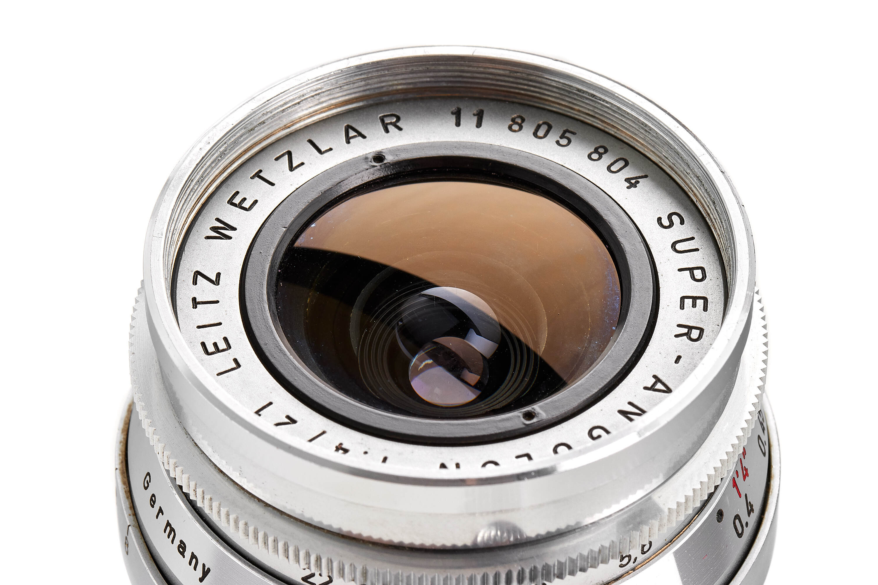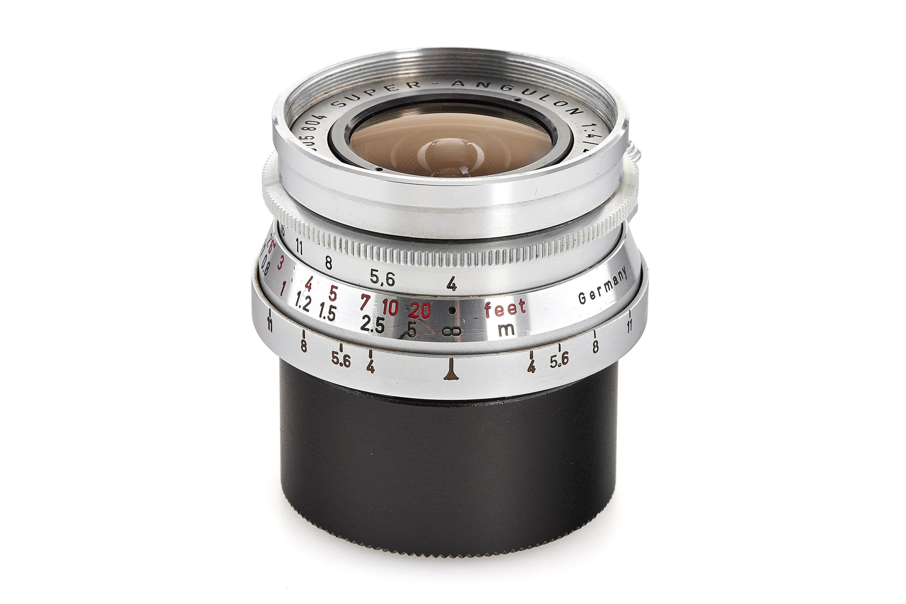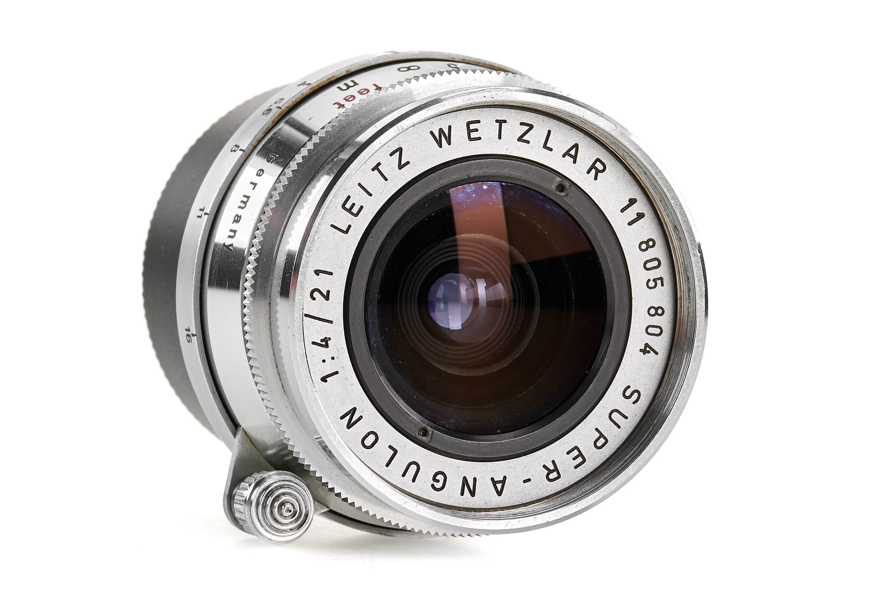 Leitz Super-Angulon in M39 mount, made in an experimental batch of only three lenses (serial numbers 11805803–11805805) and recorded in the Schneider production books as Leitz-Muster (Leitz sample). Remarkably, production of the 21mm f/4 Super-Angulon had officially ceased in 1963, yet this example was produced in 1971 – at a time when Leica no longer manufactured screw-mount cameras. In near-mint condition, complete with both caps.