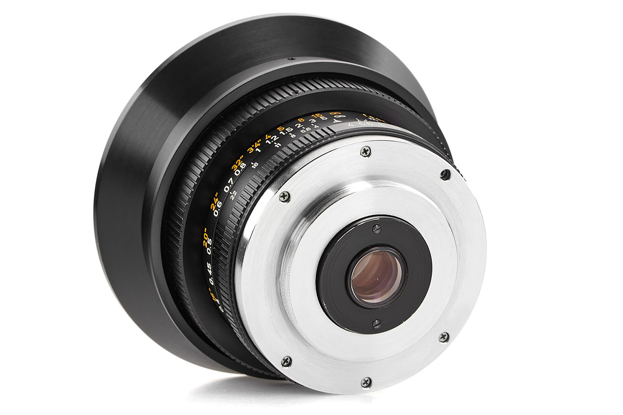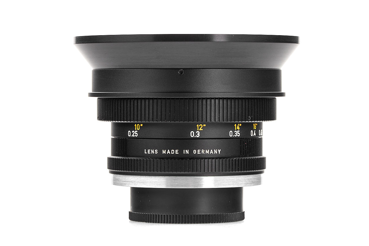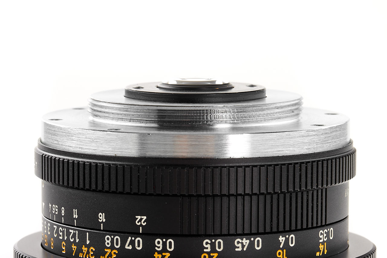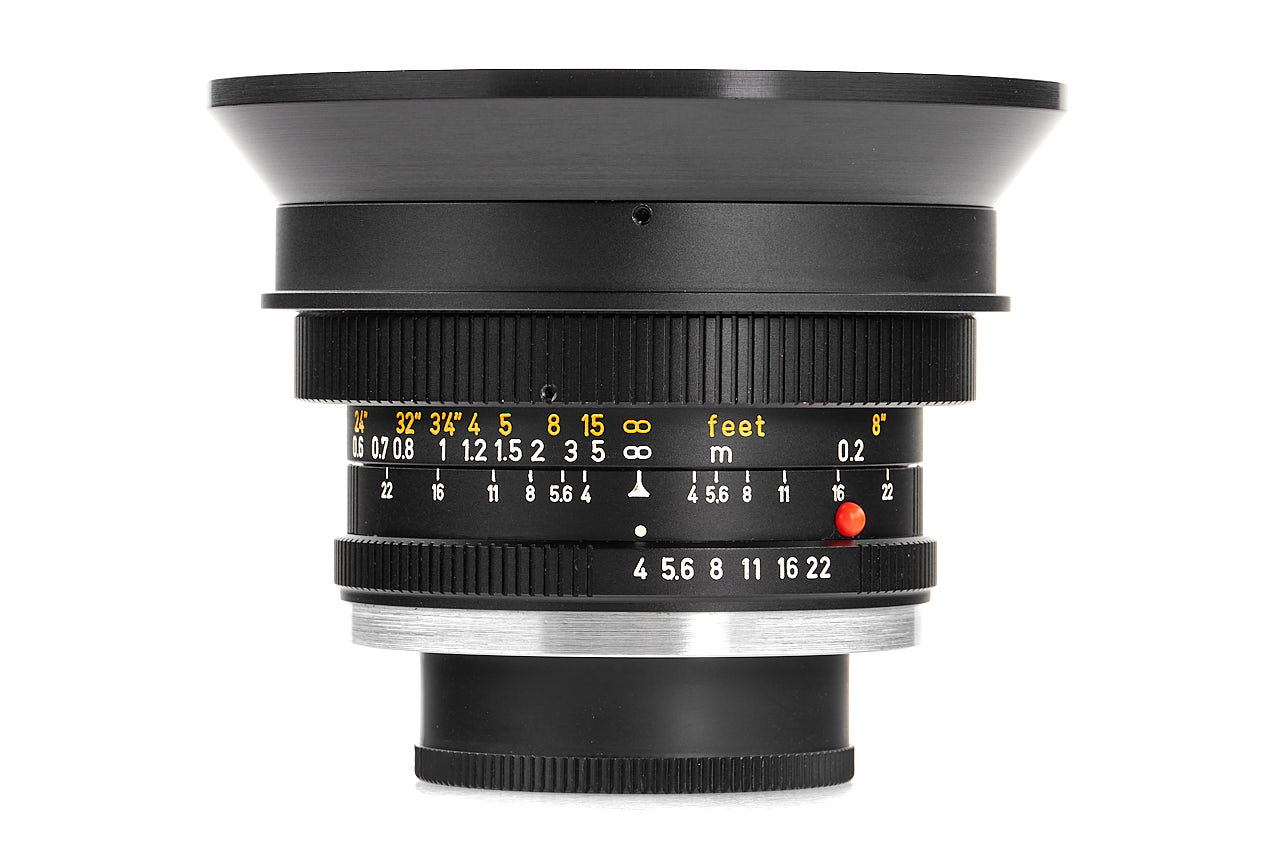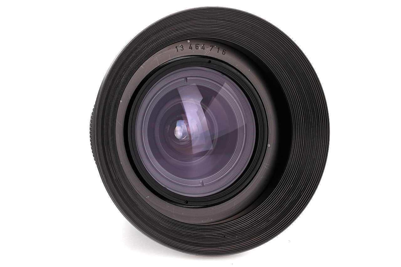 Extremely rare and interesting Schneider lens for Leica R, Super-Angulon-R 4/21mm, with built-in hood, in absolute mint condition, clean and clear optics, no denomination on the front ring, only the intriguing serial number that is out of available Schneider records, in factory M42 mount, with both original caps.