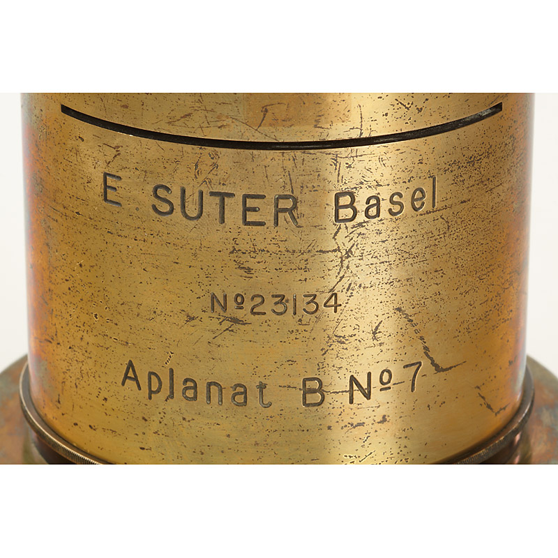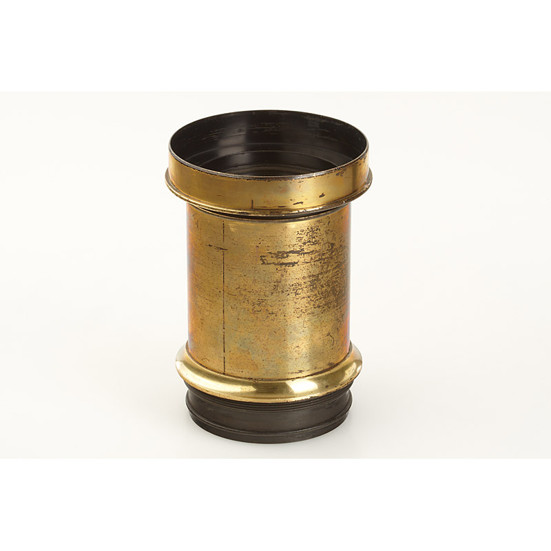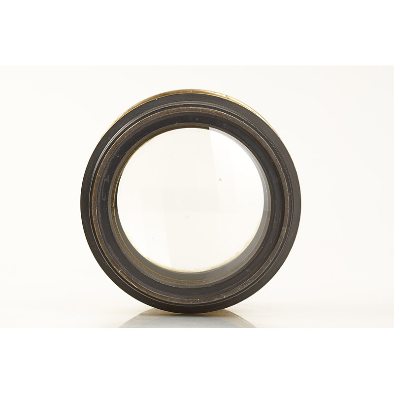 c.75cm focal length, lens diameter c.7.5cm (lenses with separation), total height including hood c.16cm, for waterhouse stops, shutter cap
