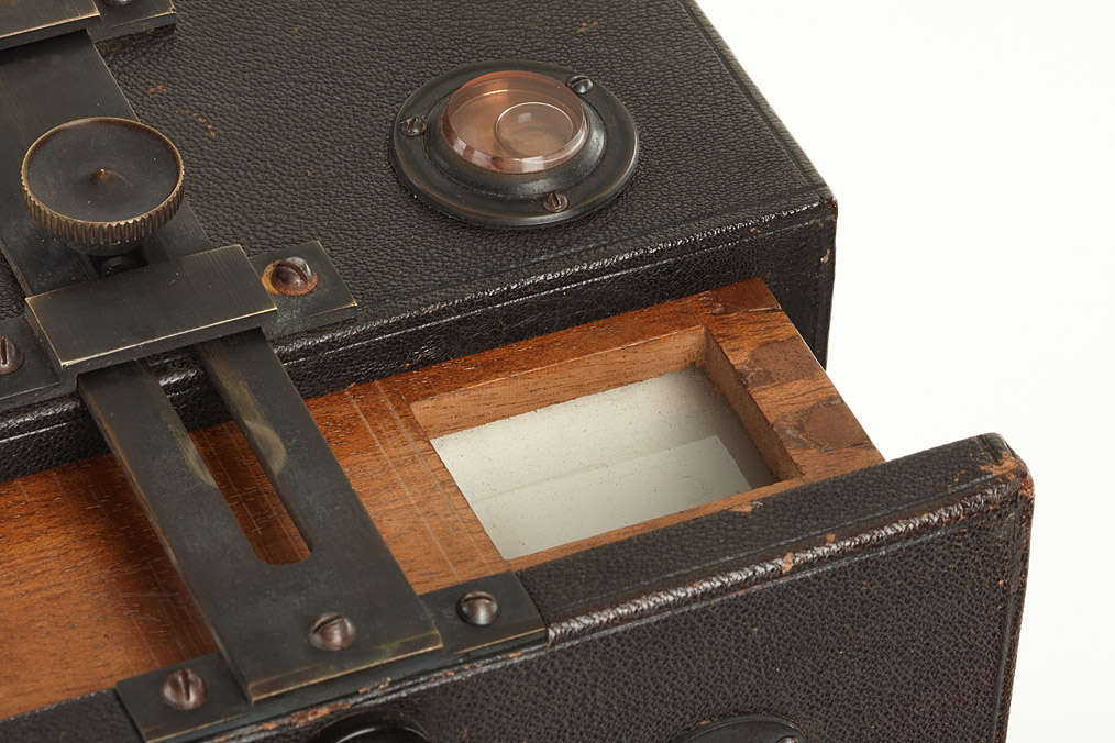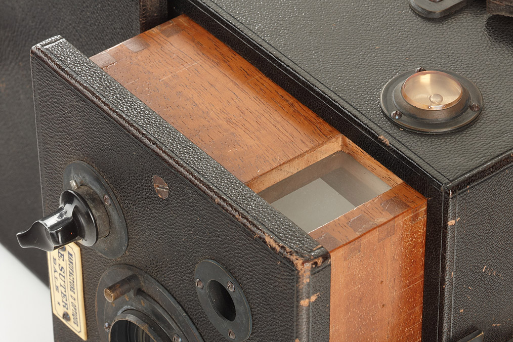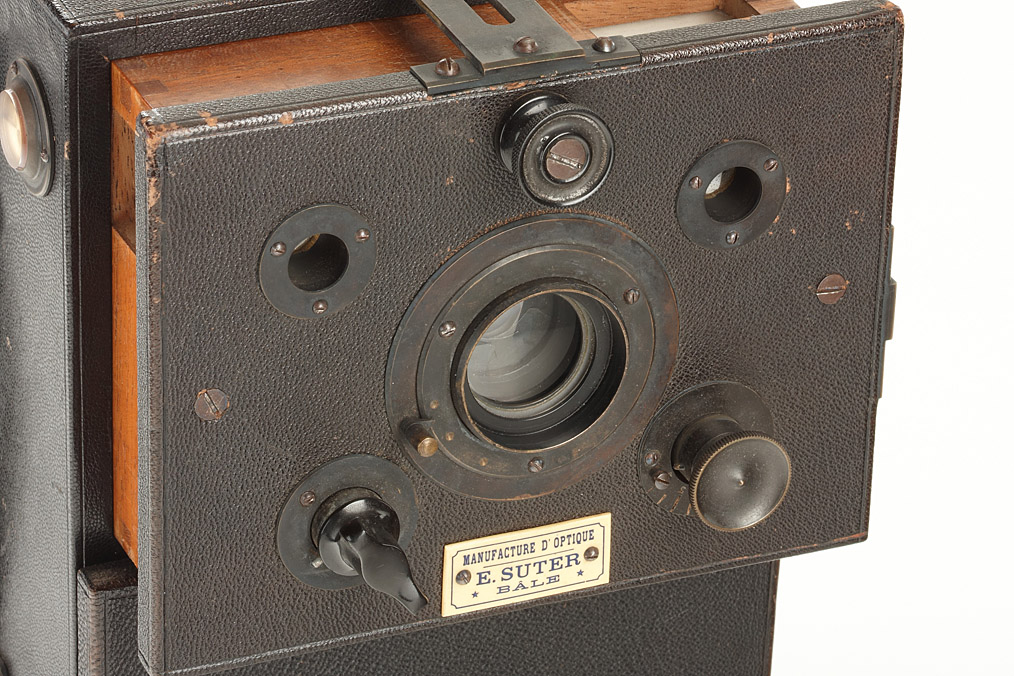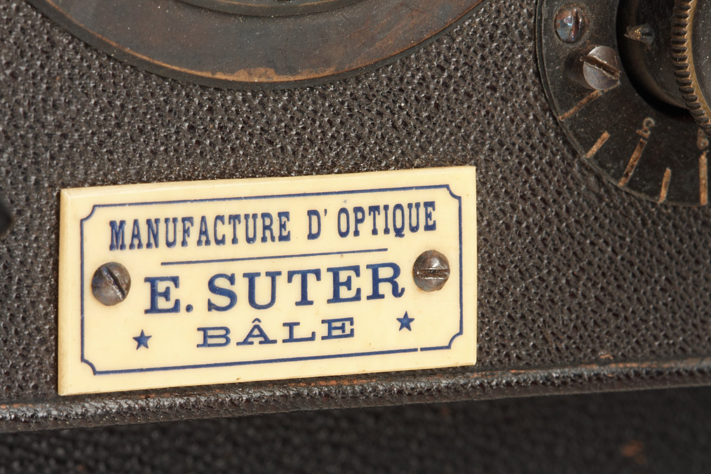 9x12cm, leather-covered wooden body, magazine for 20 exposures, Suter lens 1:12 in rotating-disk shutter, cap, maker's sign: 'Manufacture d'Optique E.SUTER Bâle'