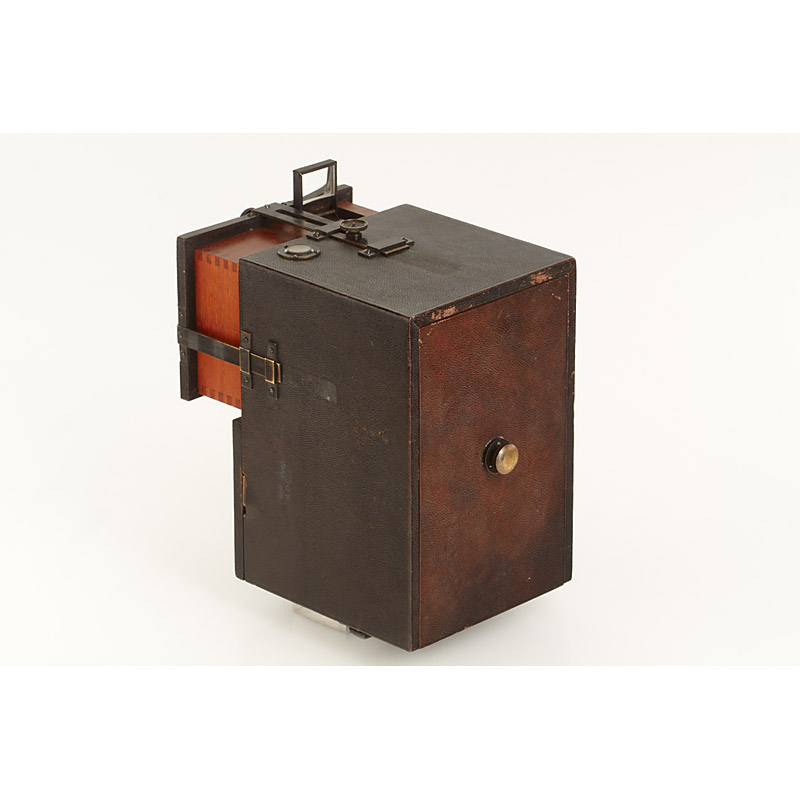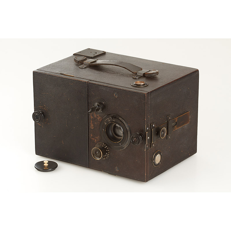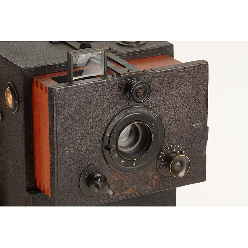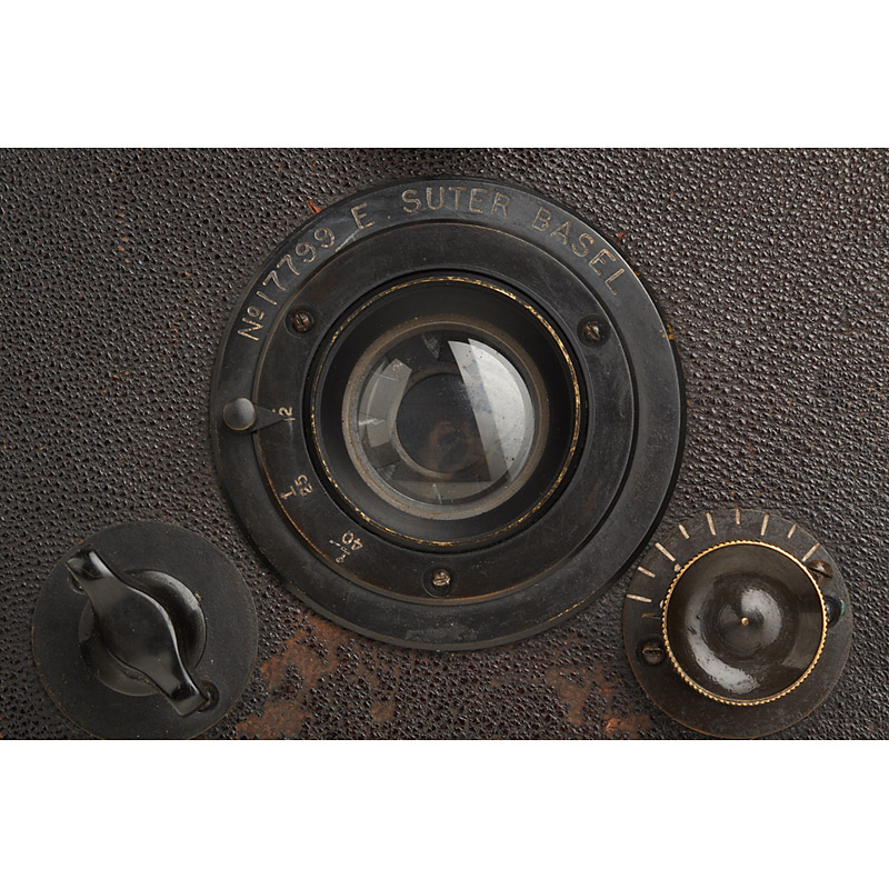 9x12cm, leather covered wooden body, magazine for 20 exposures (3 plates included), E.Suter Basel lens 1:12 in rotating-disk shutter no.17799, original cap and case