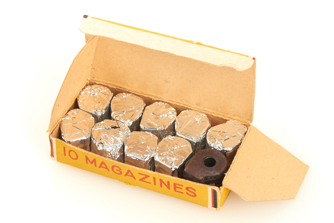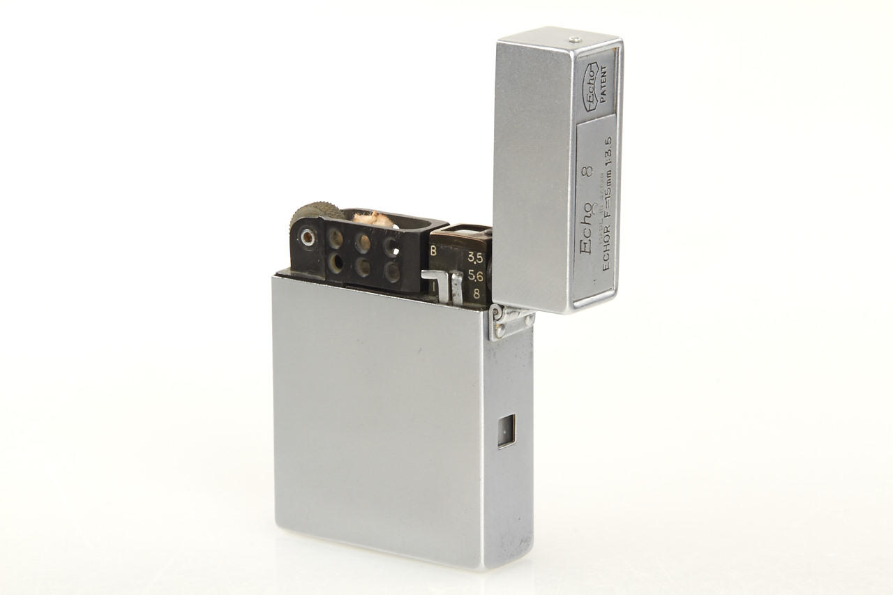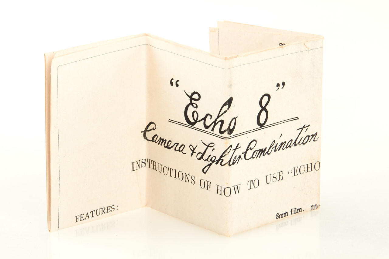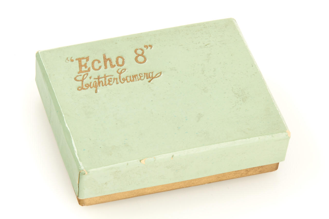 near mint cigarette lighter camera with original green/golden maker's box (price tag Yen 3600 on reverse) including film cutter, film-spool and instructions in English (with tear), camera engraved 'Echo 8 MADE IN JAPAN ECHOR F=15mm 1:3.5 Echo PATENT' on top of camera, the set comes with a yellow Echo 8 box with 10 new film magazines
