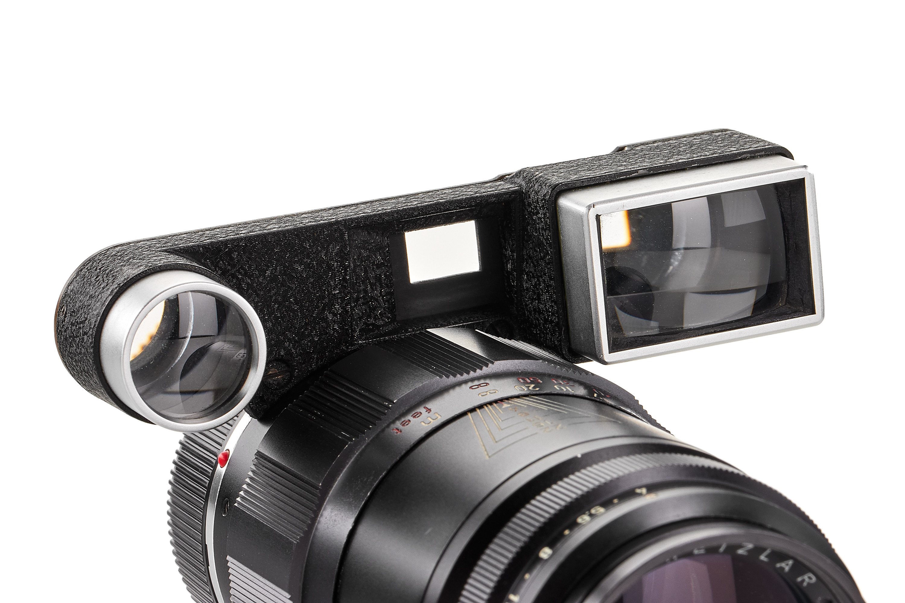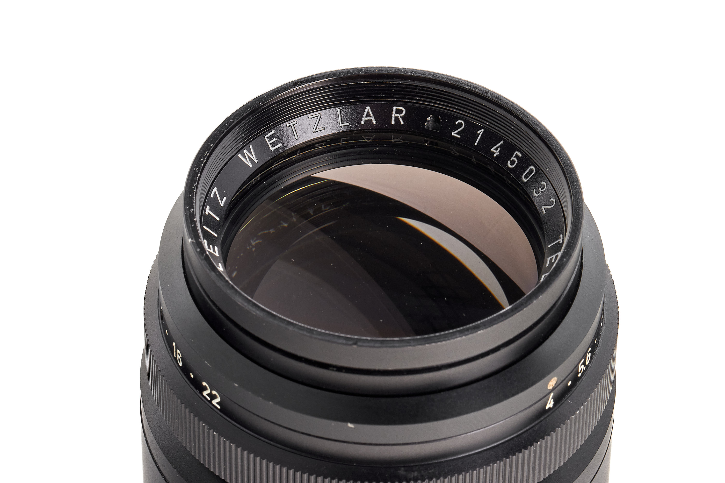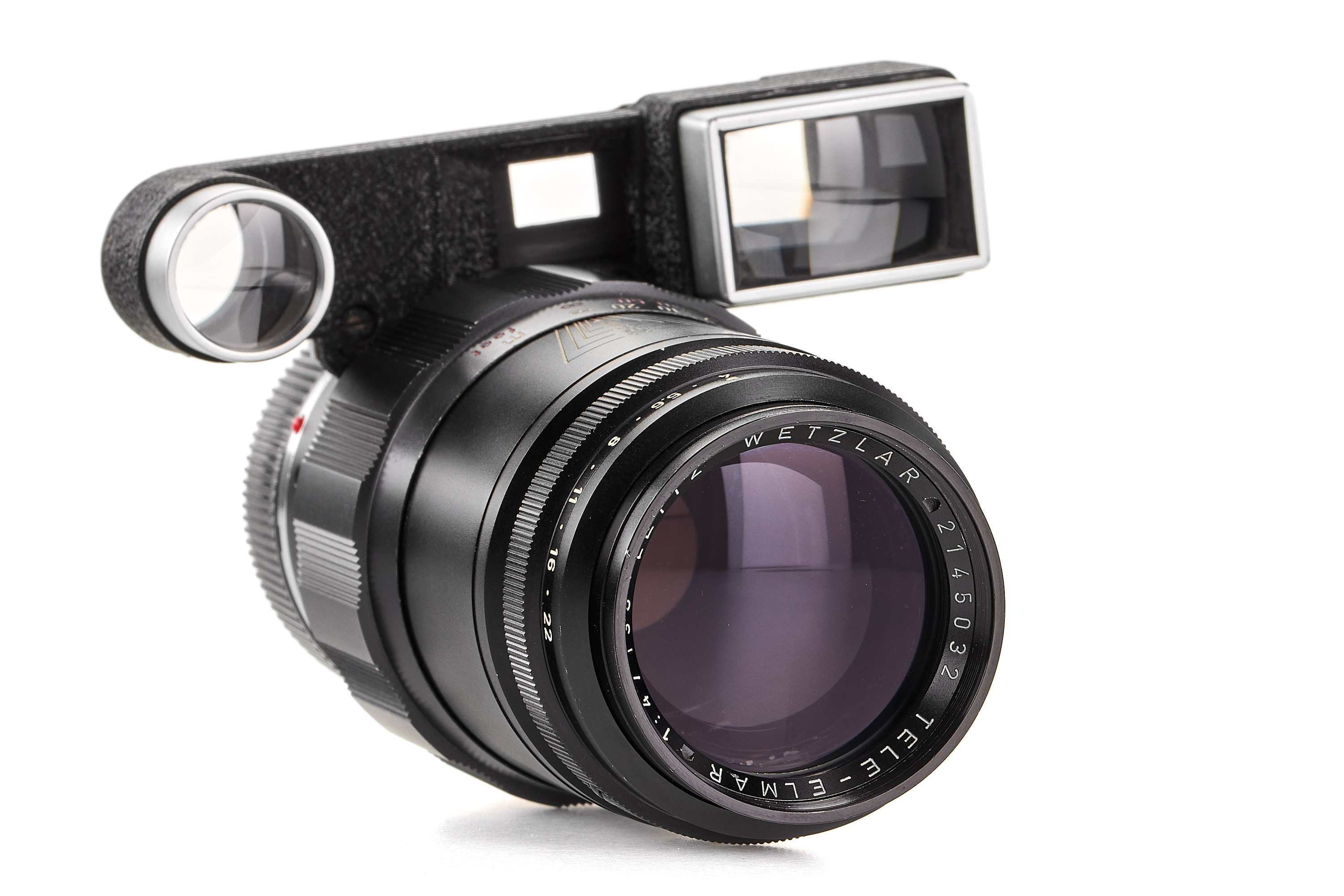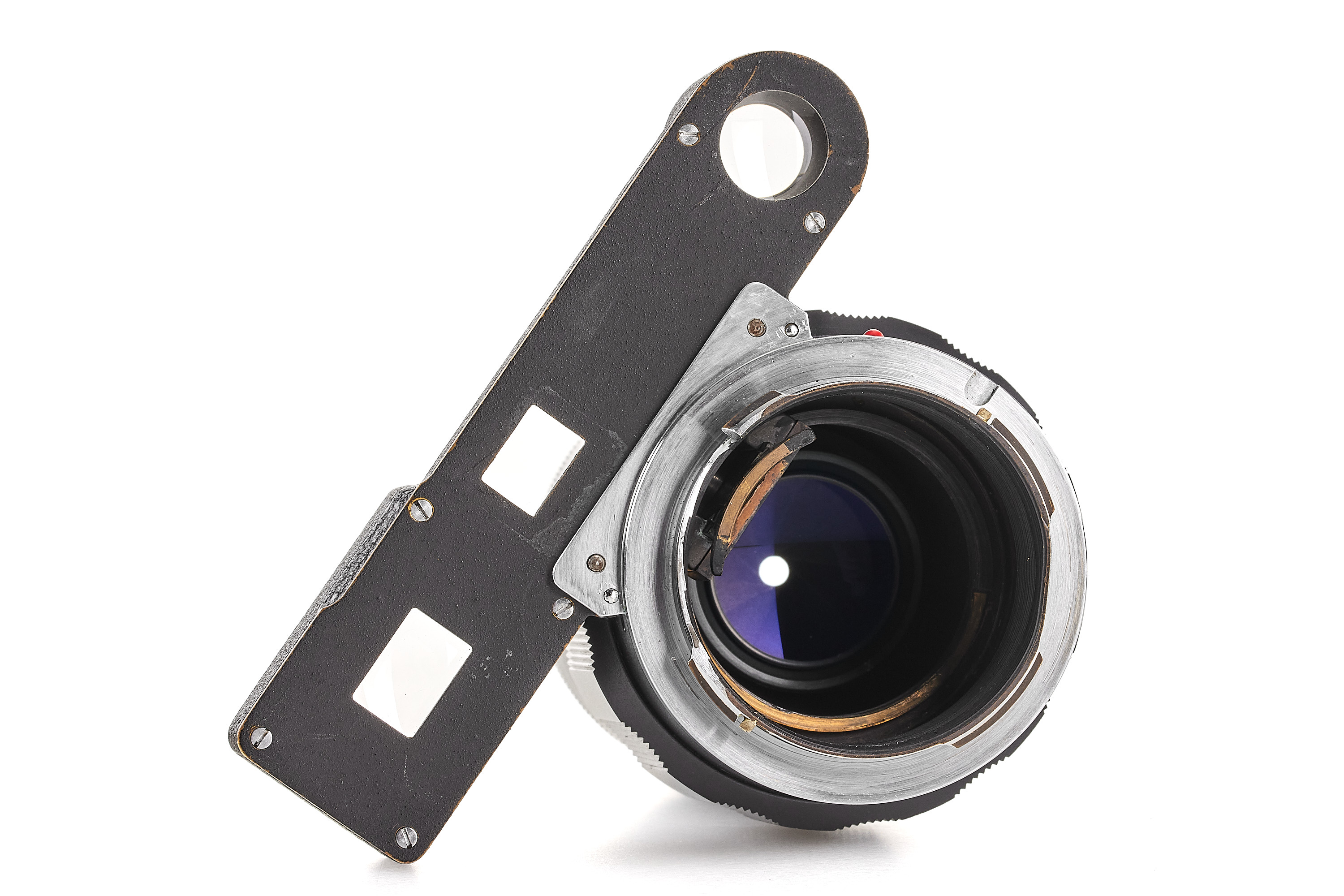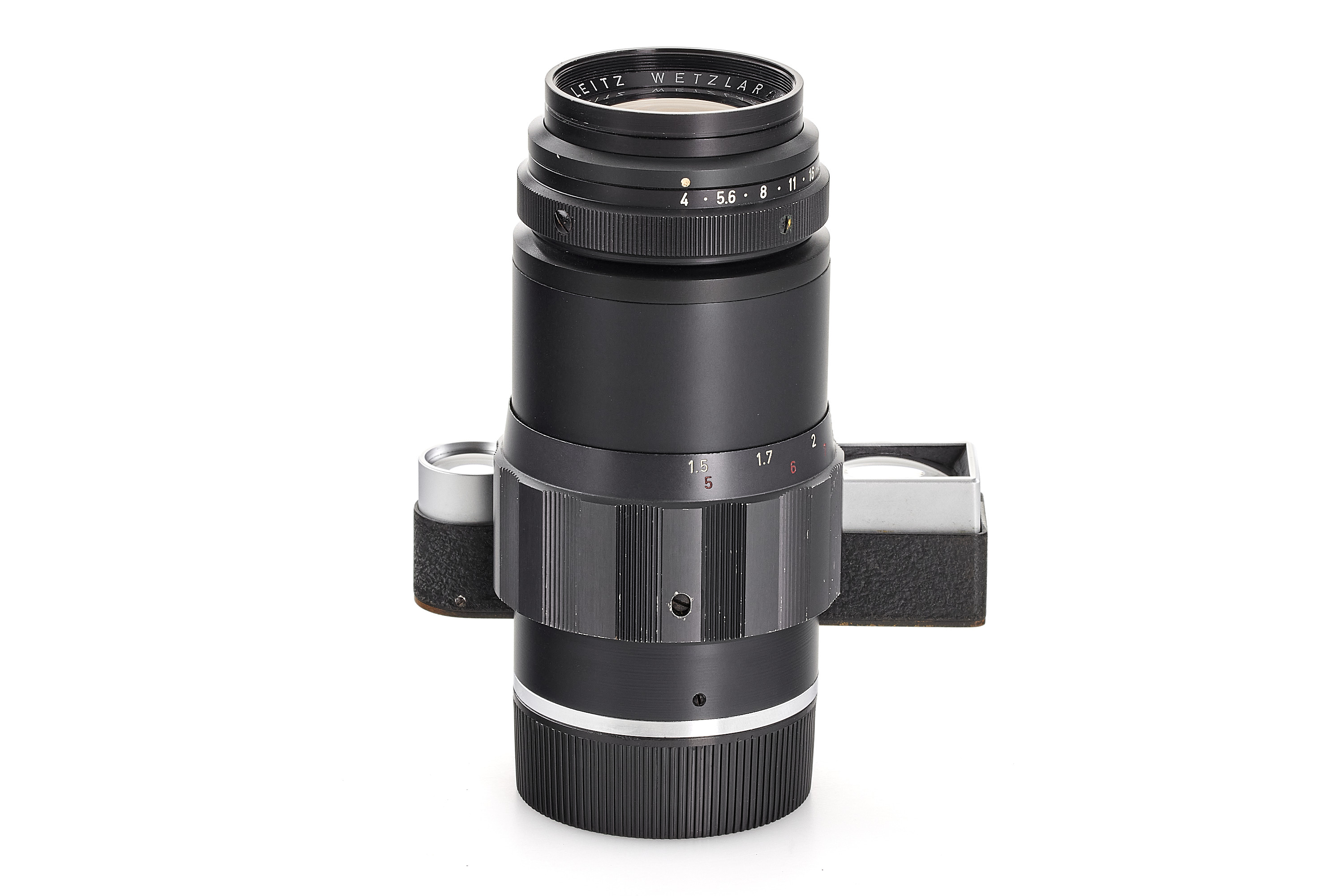 An interesting Tele-Elmar with an early serial number, equipped with special goggles for easier focusing on an M-camera. The goggles are enlarging the view and masking the area outside of 135mm frame lines for much easier focusing. They also have a completely different design from the Elmarit-M 2.9/135 goggles. The lens is in excellent condition. An empty line in the Leitz delivery records suggests that the lens was left at the factory for internal purposes