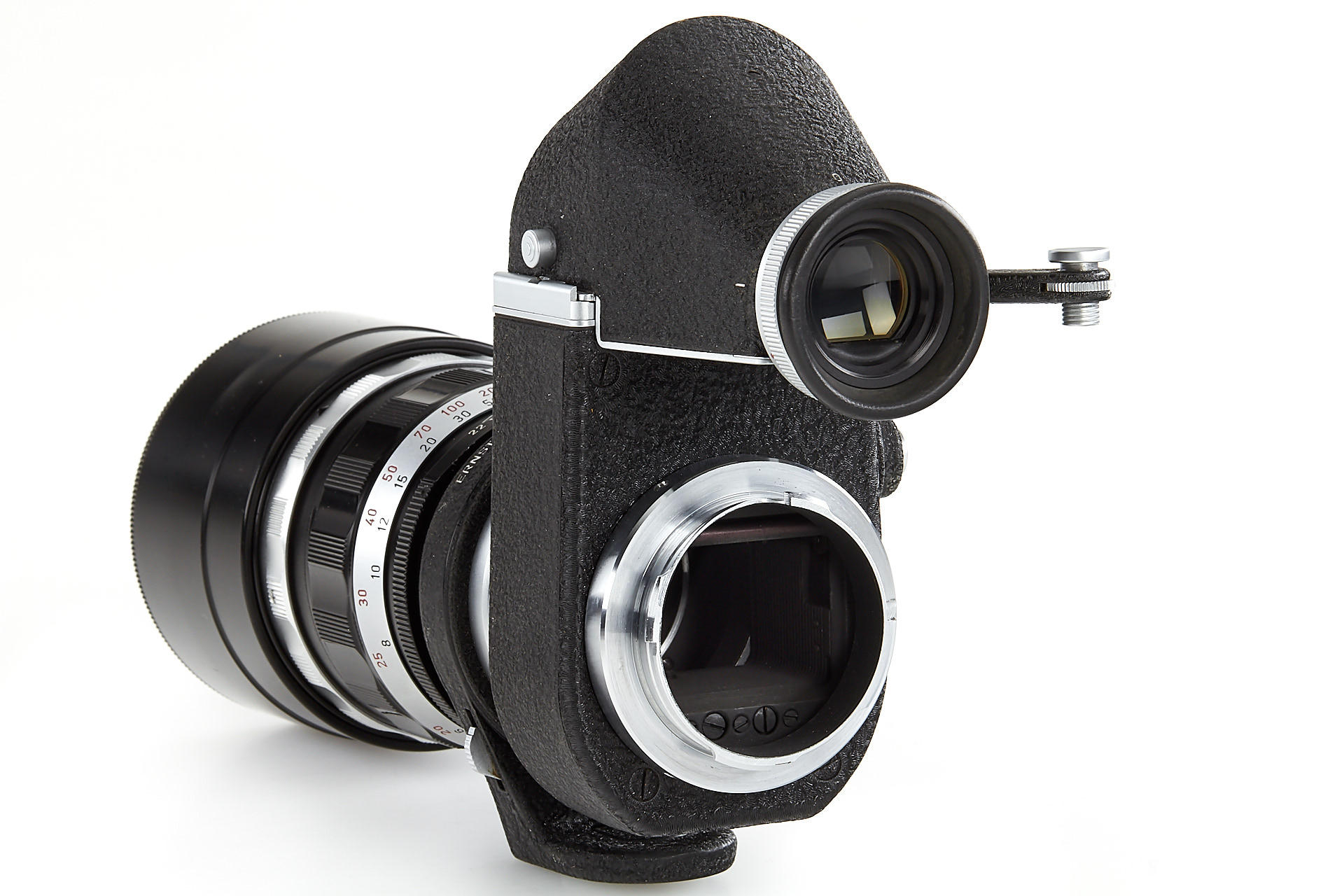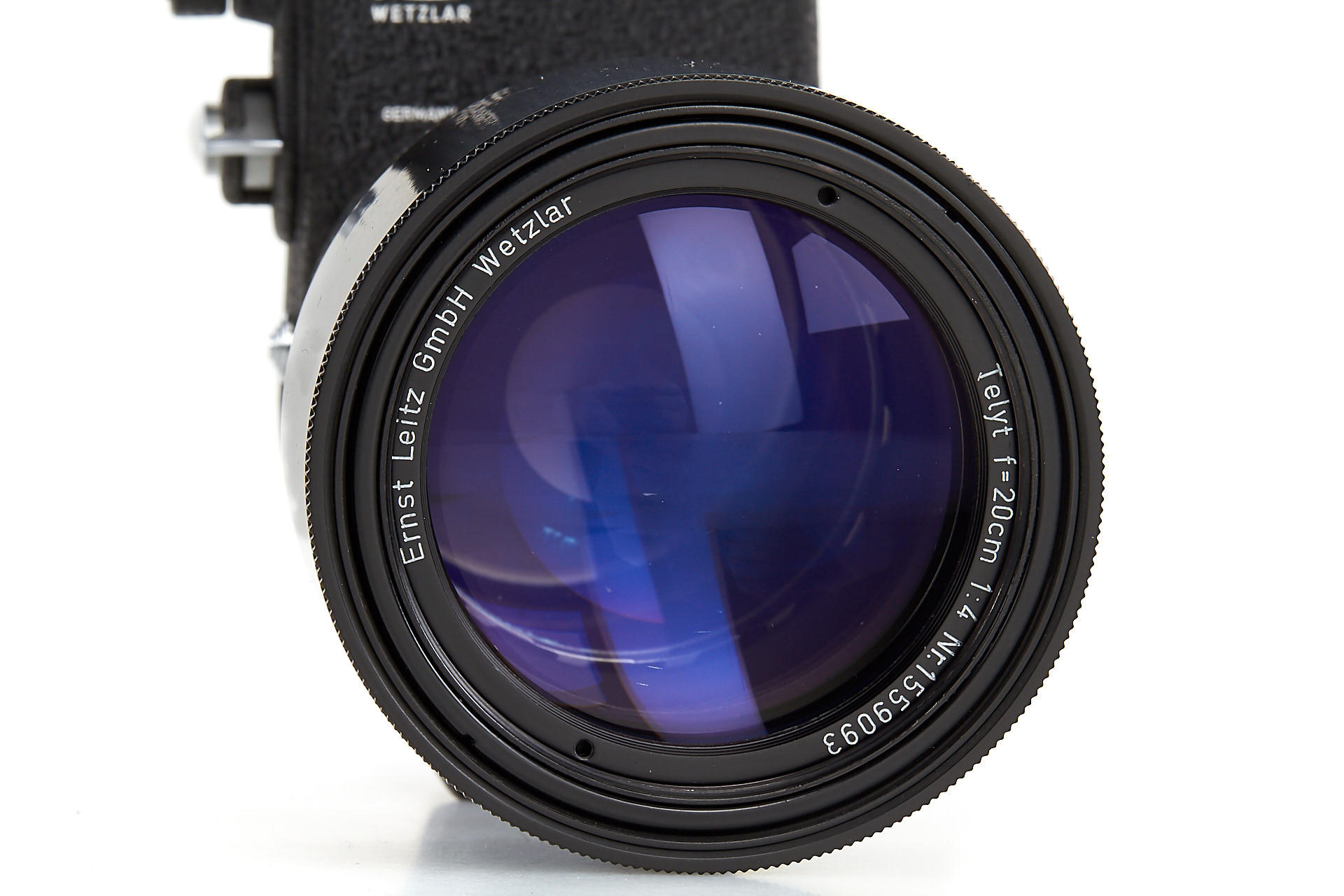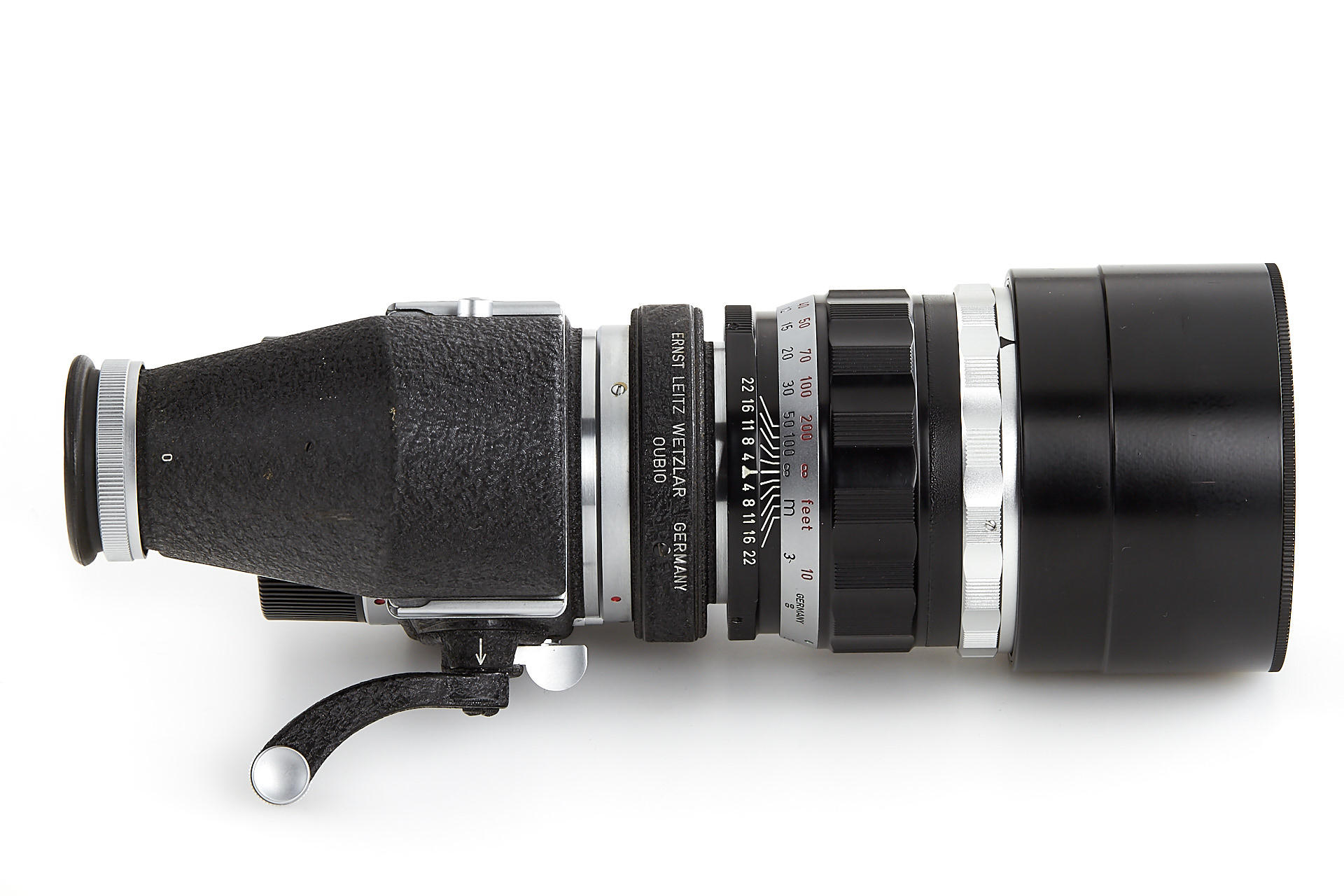 rare black paint Telyt for Visoflex screw mount, one of only 750 lenses produced in this form, in beautiful, near mint condition, clean optics, with both caps, Visoflex reflex housing, and OUBIO adapter