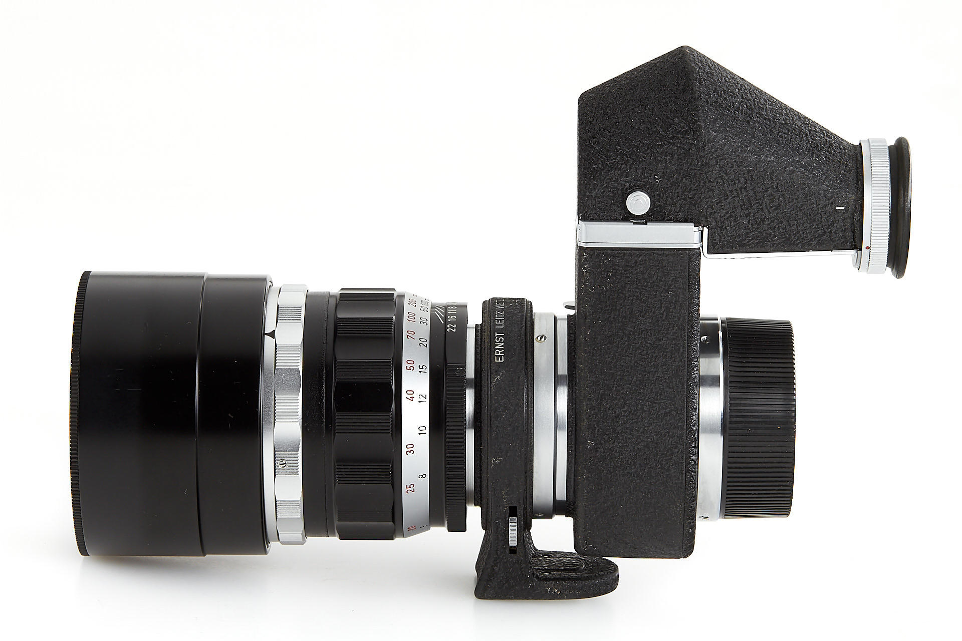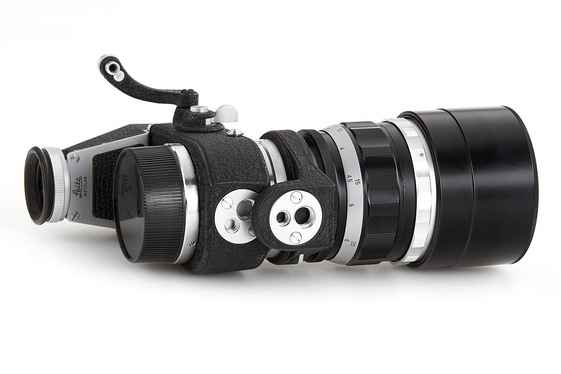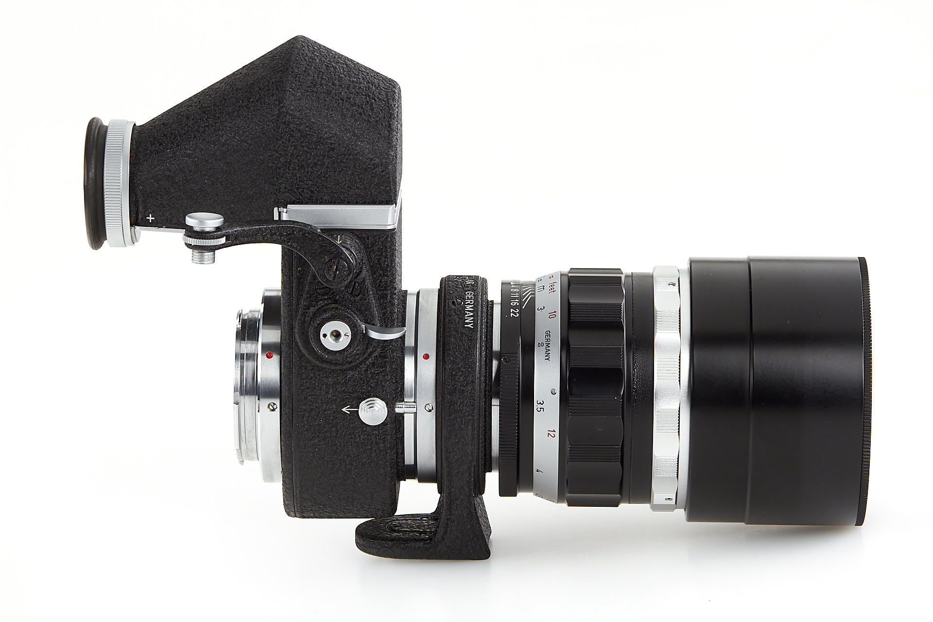 rare black paint Telyt for Visoflex screw mount, one of only 750 lenses produced in this form, in beautiful, near mint condition, clean optics, with both caps, Visoflex reflex housing, and OUBIO adapter