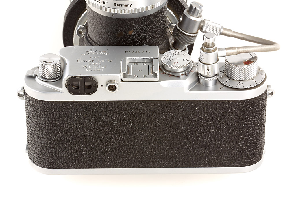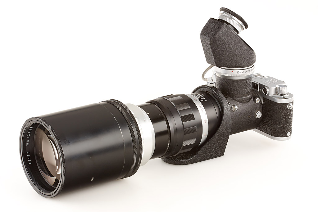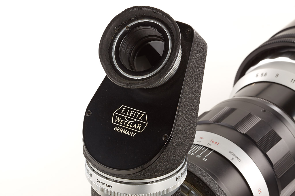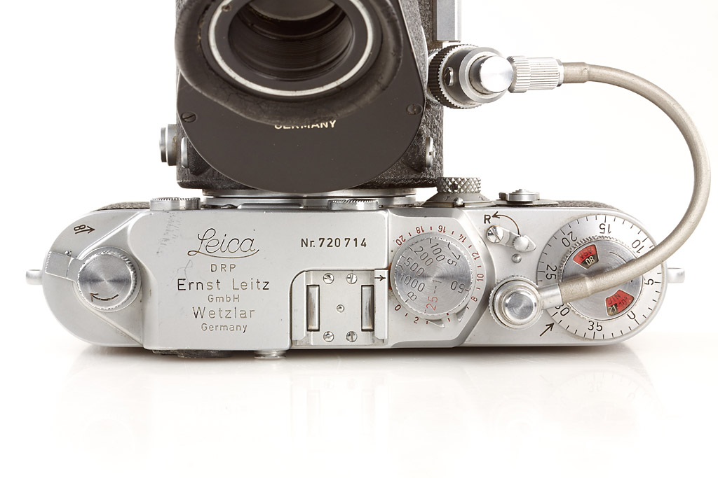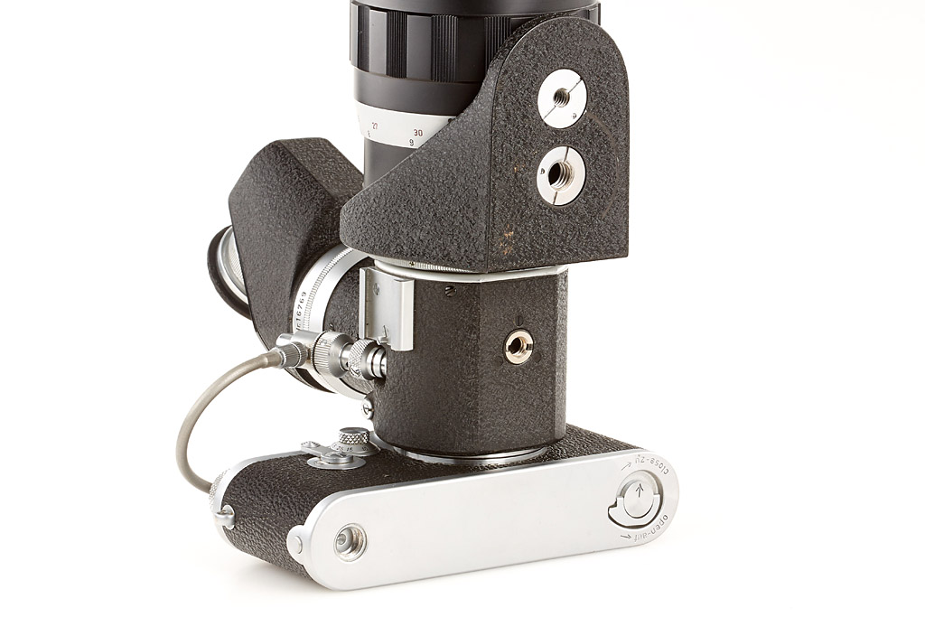 2nd type in almost mint condition with clean lenses (cap), Visoflex I housing no.16769 with PEGOO prism finder, OZXVO cable release and Leica IIIf red dial body no.720714 (cond. B)