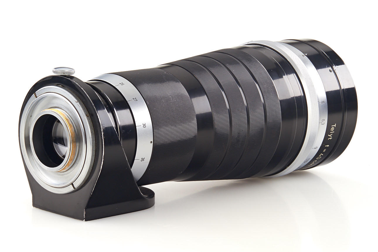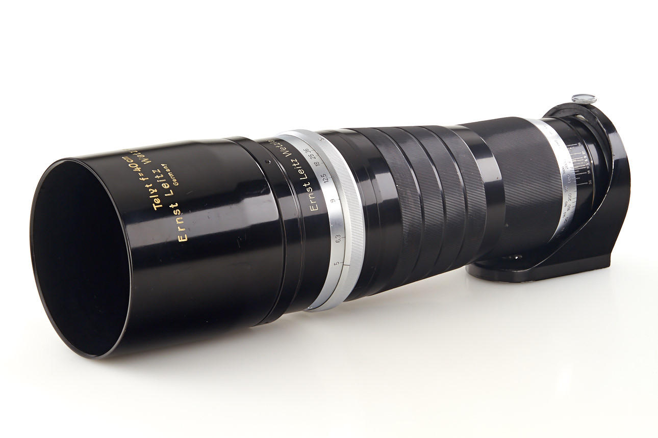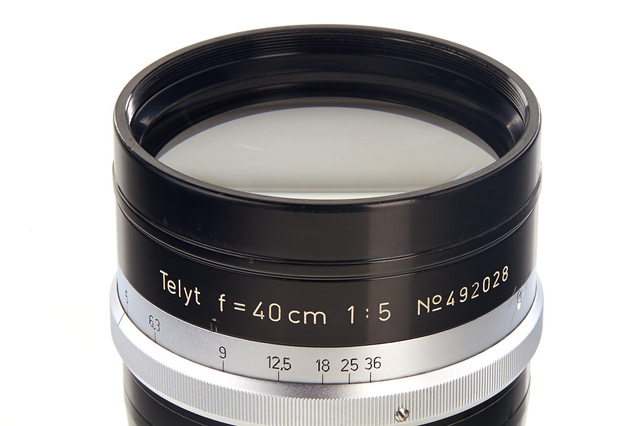 very rare uncoated wartime first type Telyt 40cm in very fine condition with both caps, matching hood engraved 'Telyt f=40cm Ernst Leitz Wetzlar Germany'
