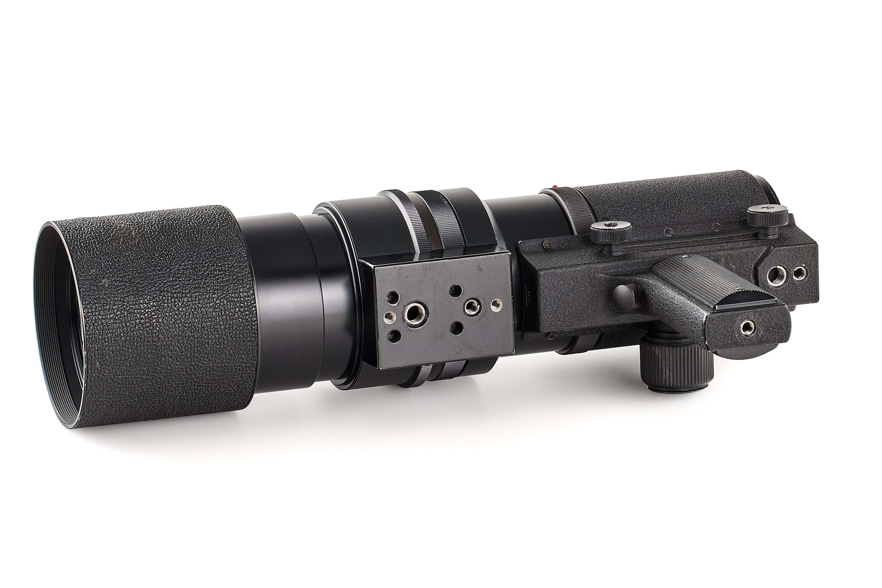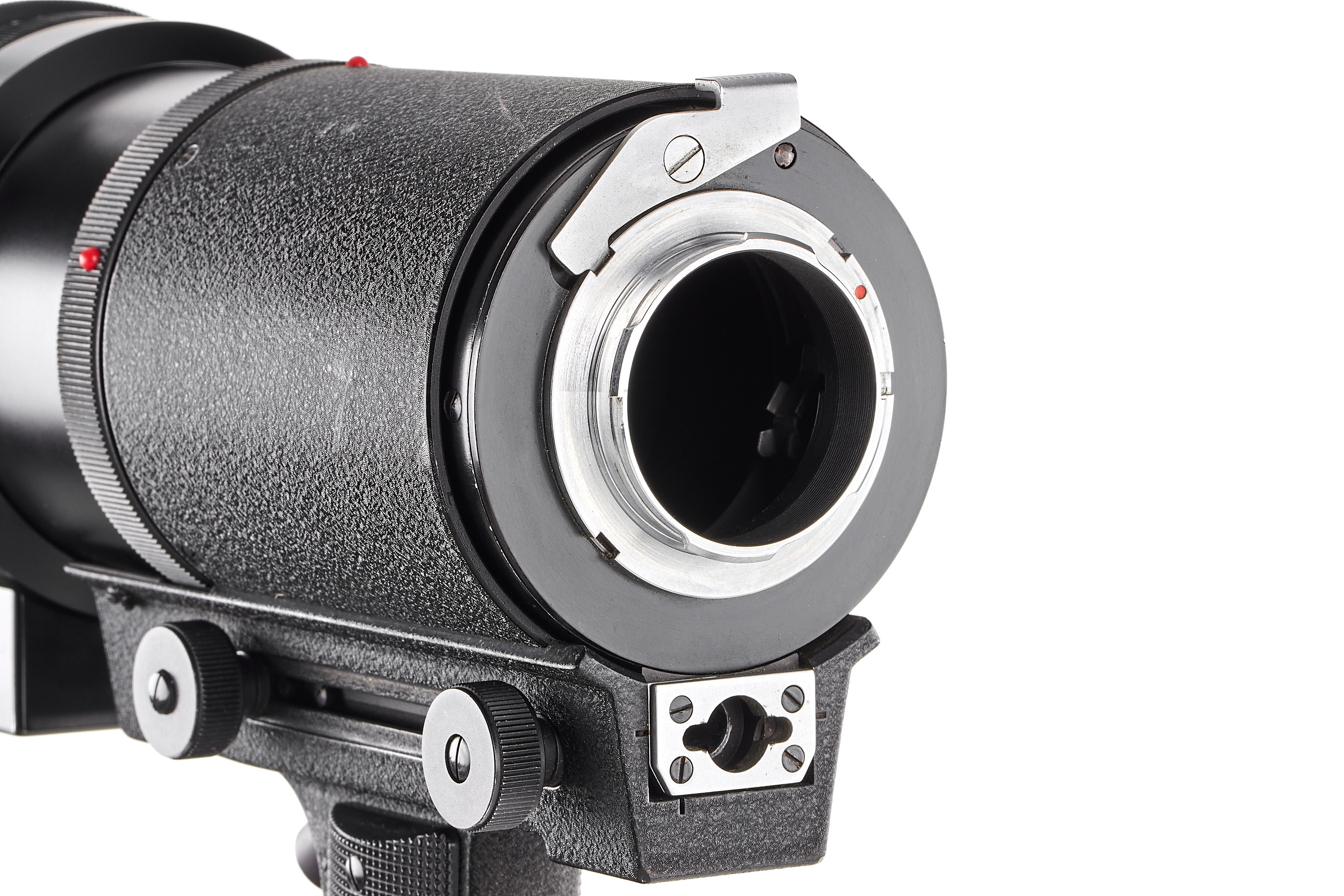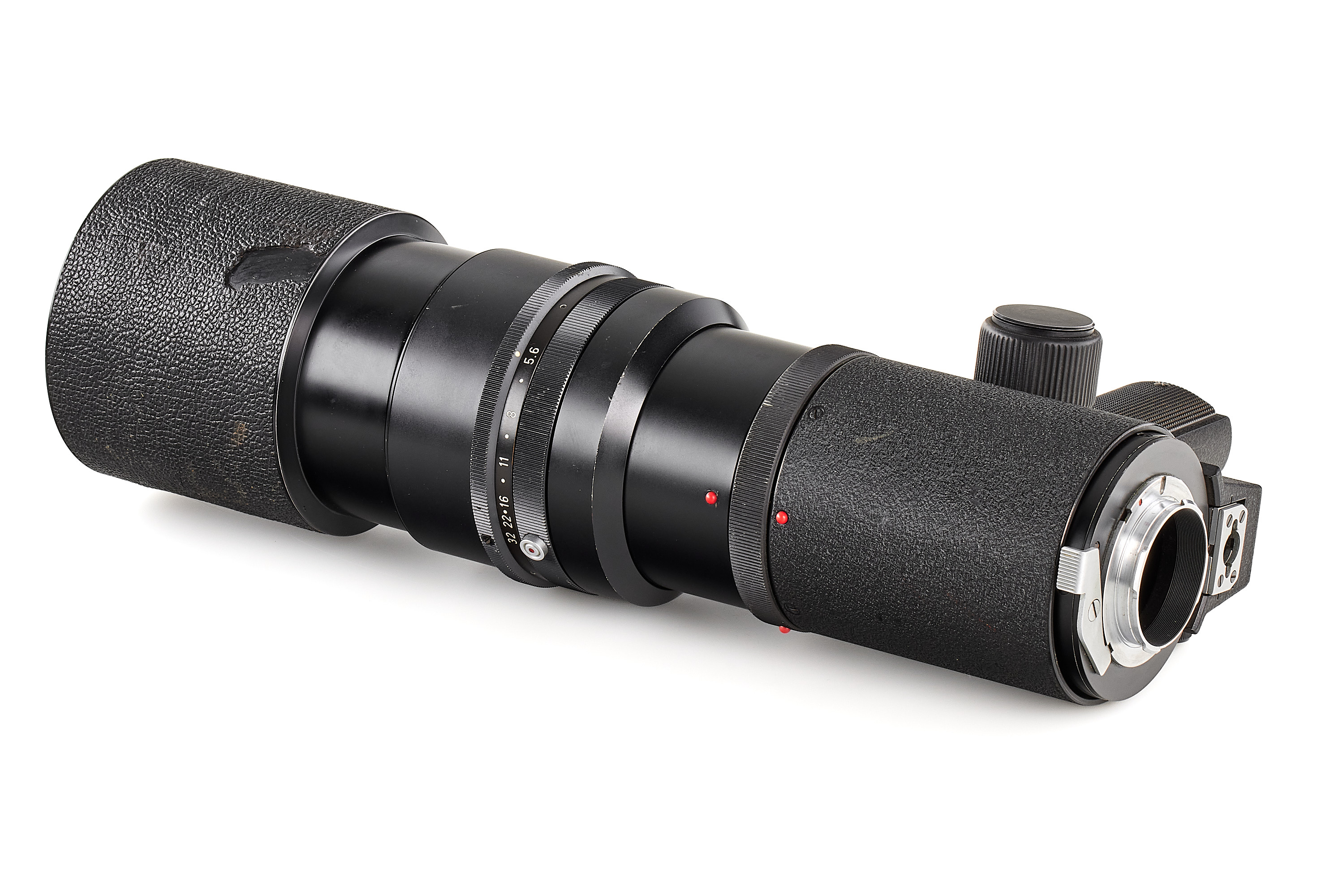 An interesting prototype lens in Visoflex mount, rapid focusing system. Note the uncommon, vulcanite-covered hood (small piece of vulcanite missing). In very good original condition.