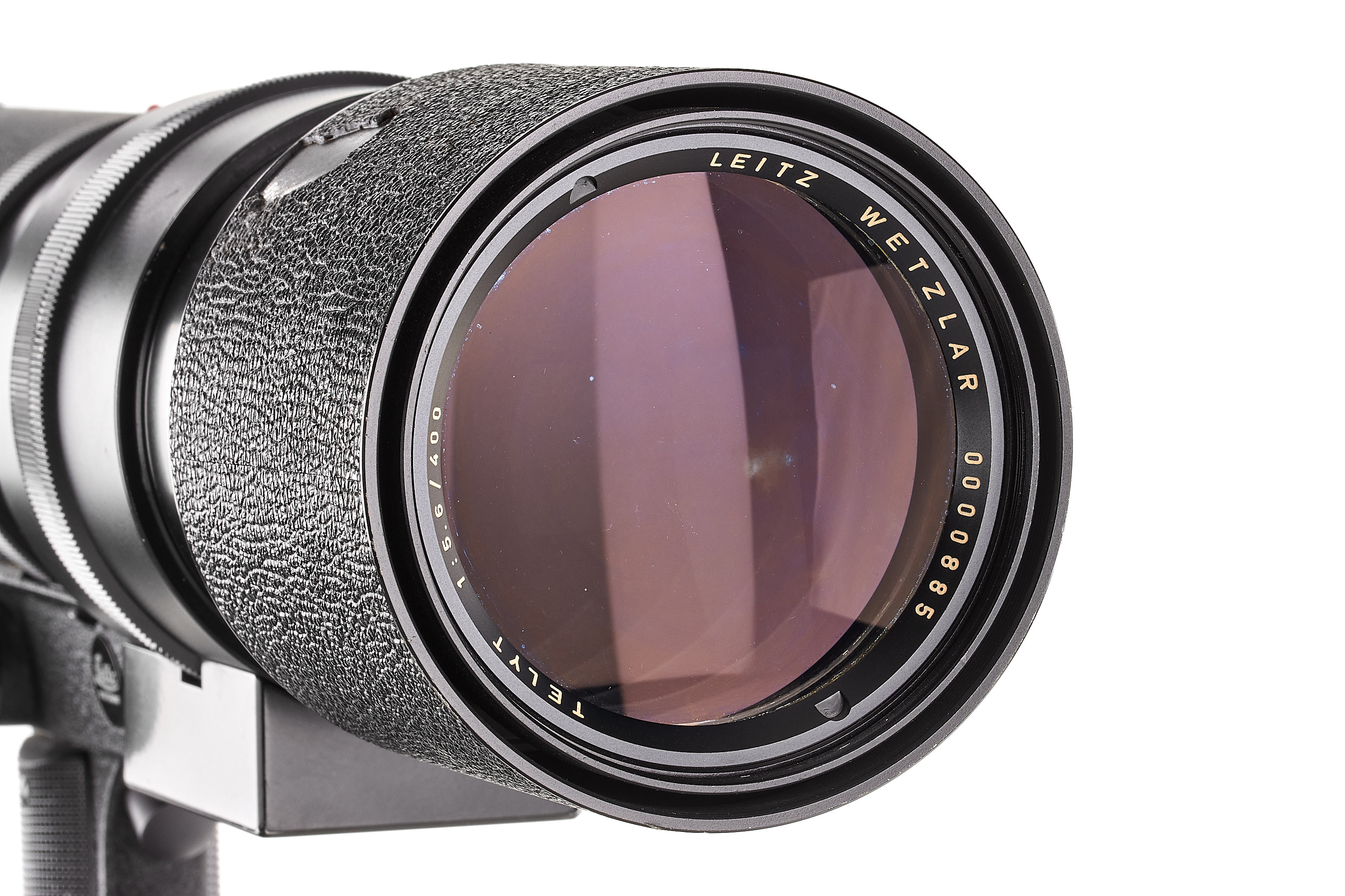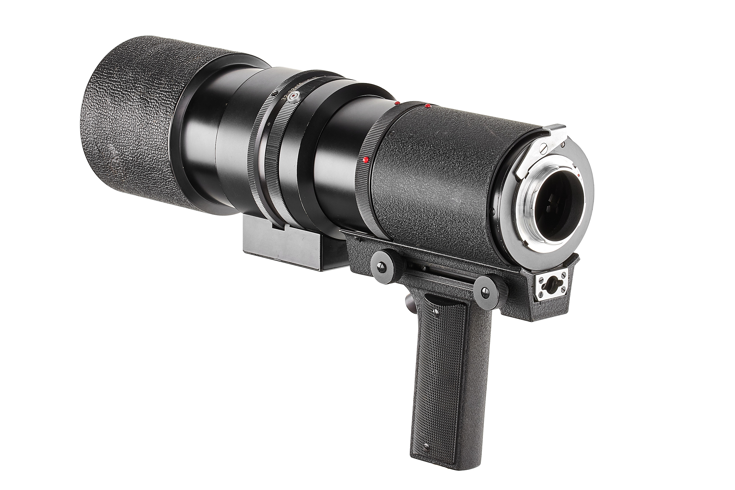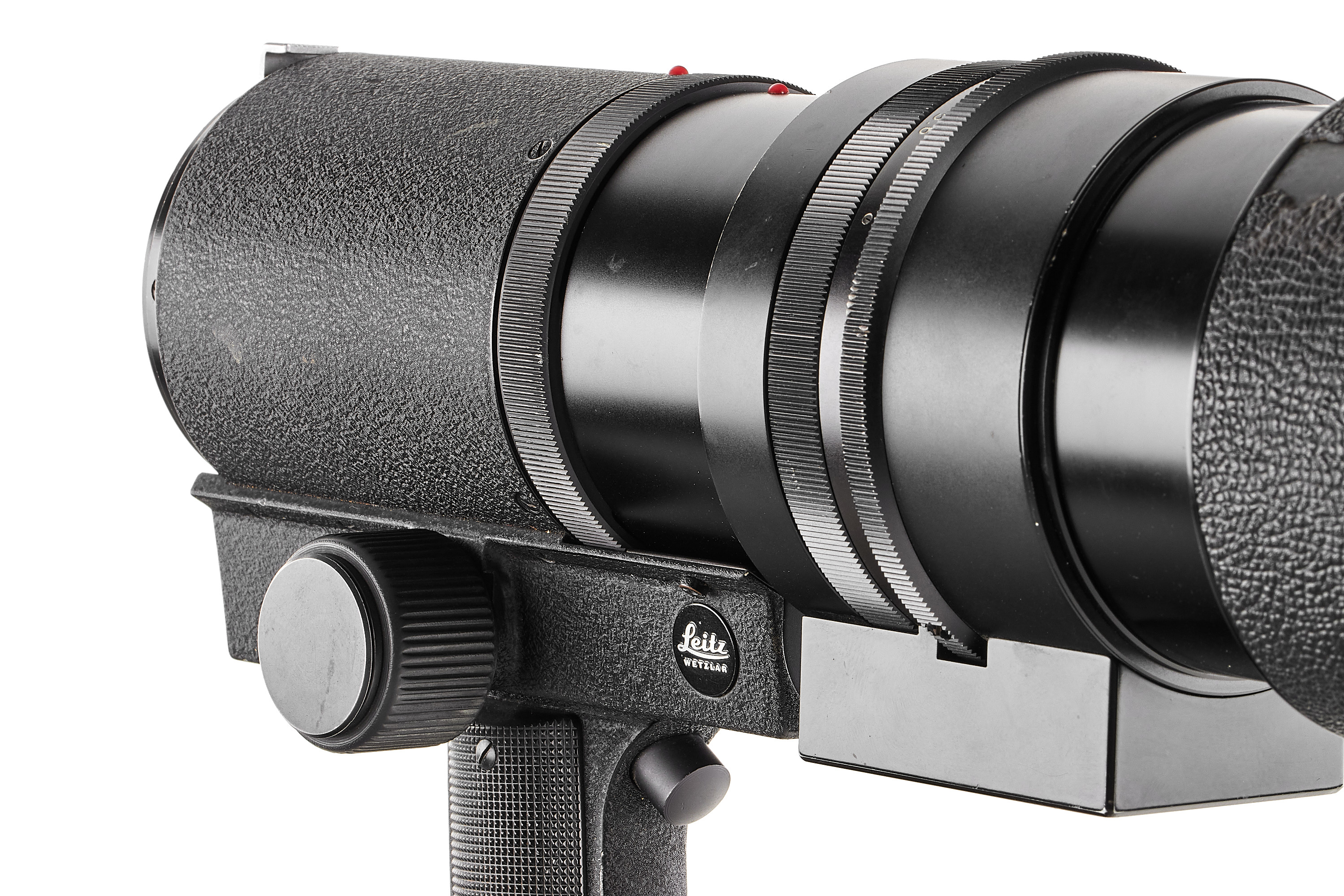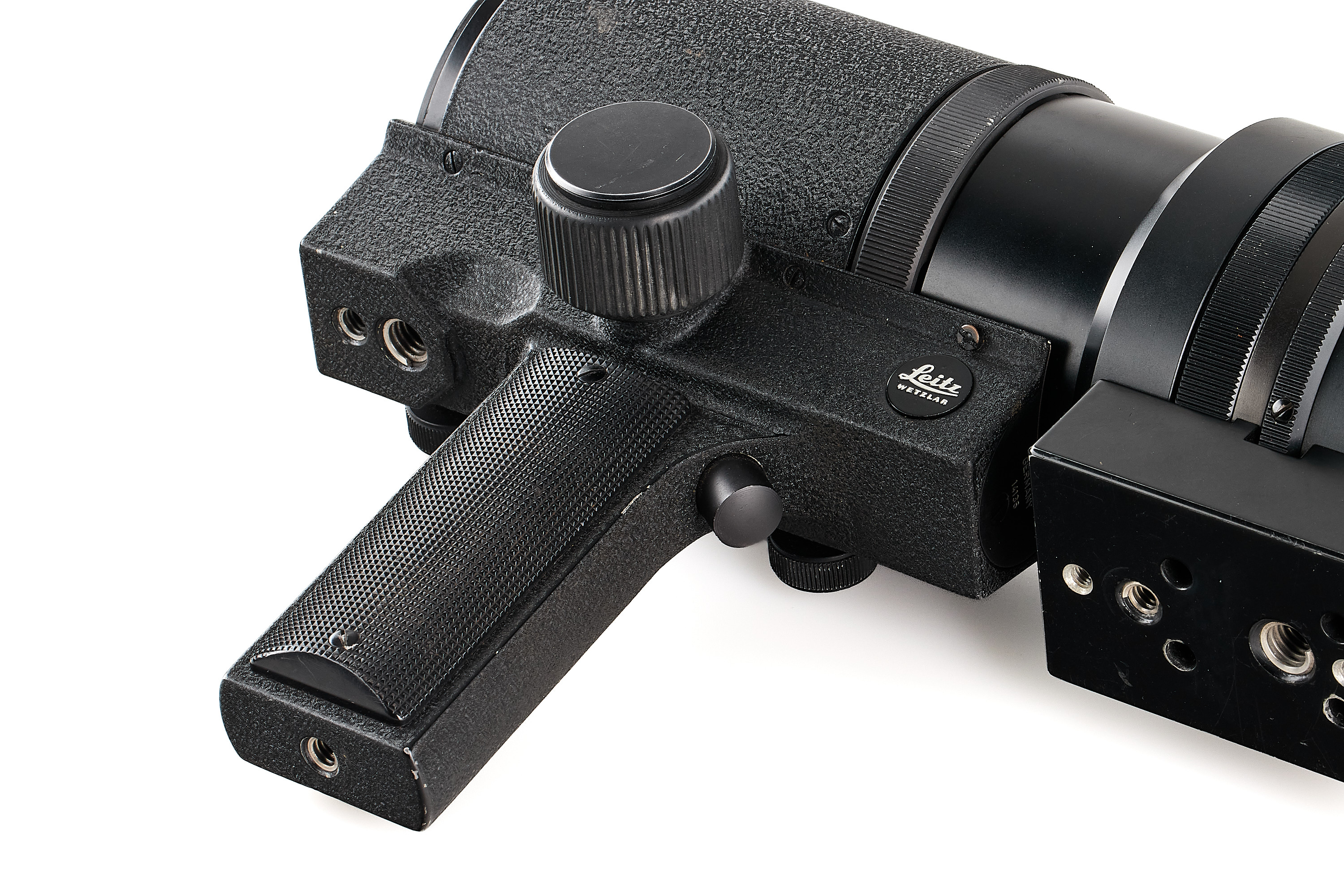 An interesting prototype lens in Visoflex mount, rapid focusing system. Note the uncommon, vulcanite-covered hood (small piece of vulcanite missing). In very good original condition.