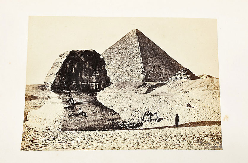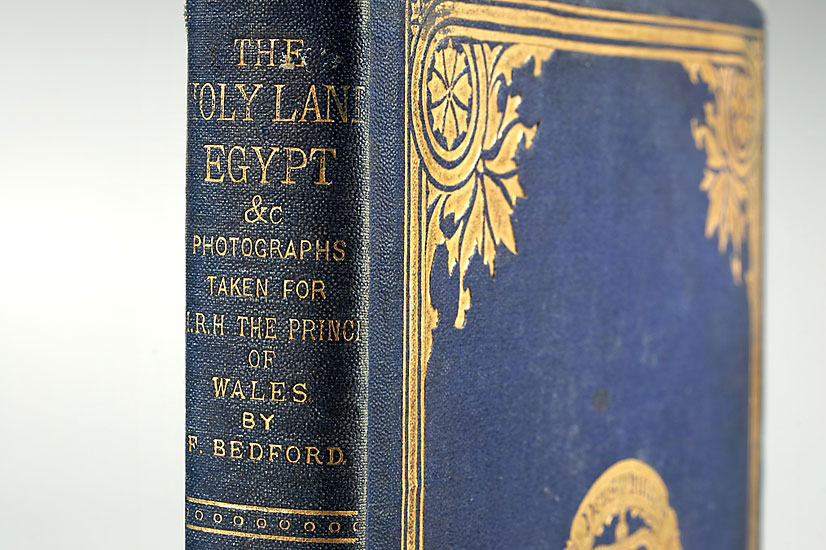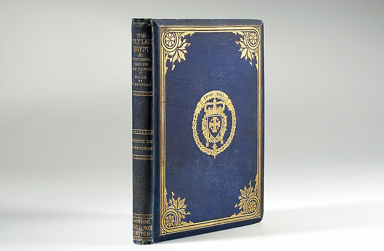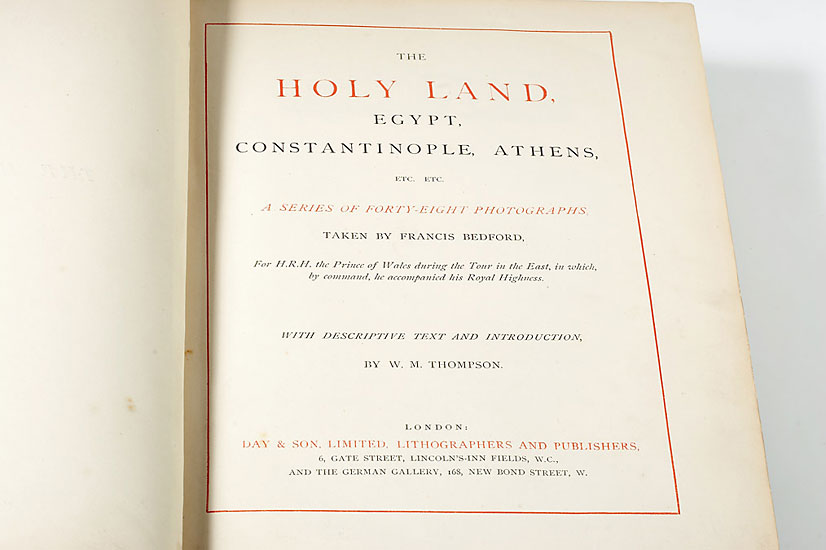 “The Holy Land, Egypt, Constantinople, Athens, etc. etc.” published 1865 by Day & Son Ltd, London, bound in dark blue leather an stamped in gilt on covers and spines, 100 pages with 48 albumen print illustrations by Francis Bedford. The photographs were taken whilst Bedford accompanied the Prince of Wales on his tour of the Middle East in 1862. The accompanying text by W.M. Thomson is described as 'designedly of a popular character'. Francis Bedford (1816-1894) was originally an artist and lithographer, particularly of architectural subjects. He took up photography in the 1850s. In 1853 he co-founded the Royal Photographic Society of Great Britain. From 1853 until 1870 he exhibited at the Photographic Society and at various exhibitions. The book and the photographs are in good conditions, some pages mould stained. A highly collectible and hard to find Photographica!