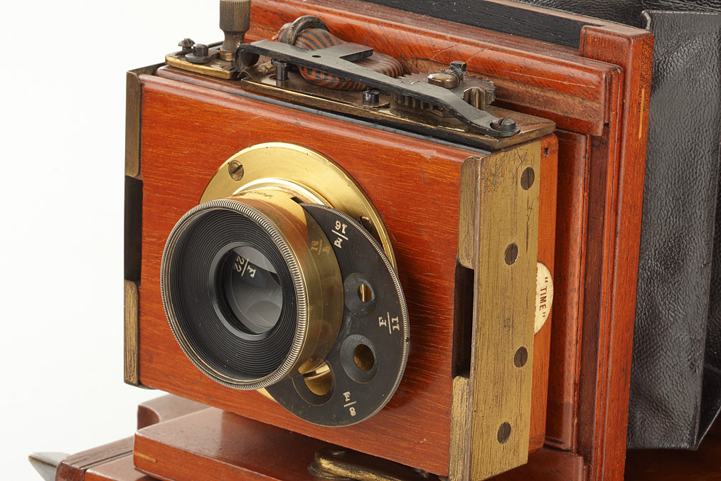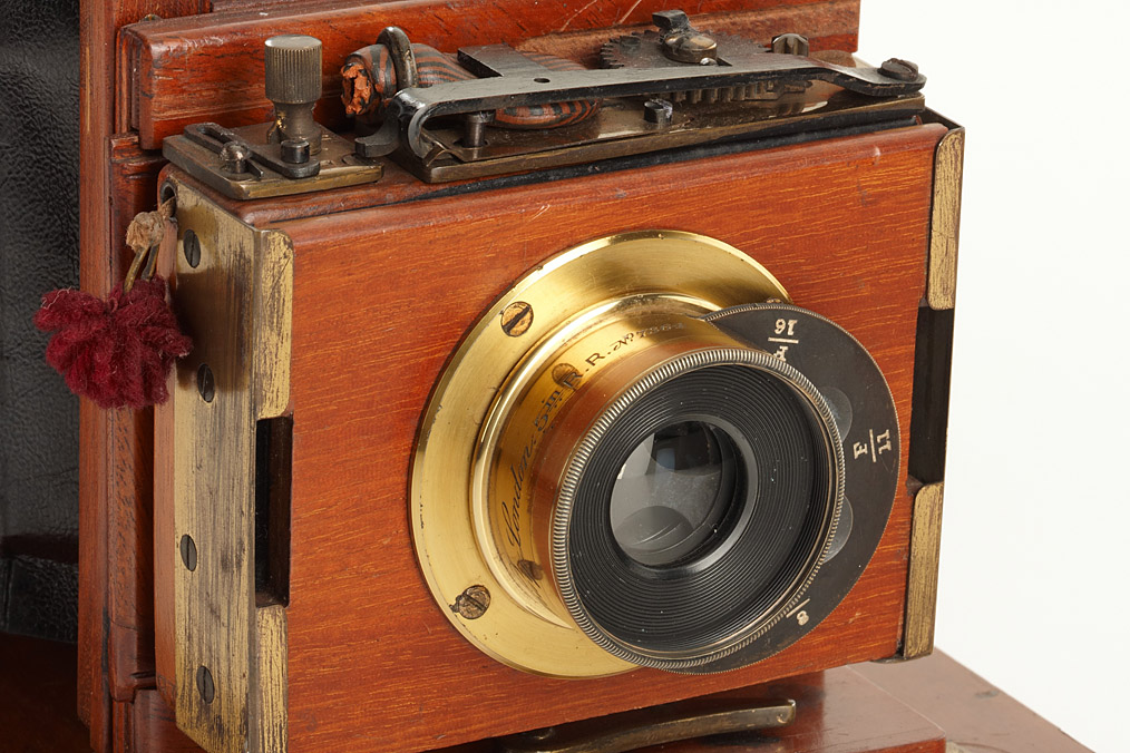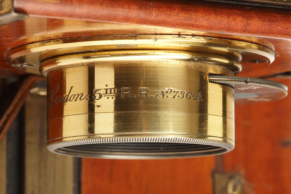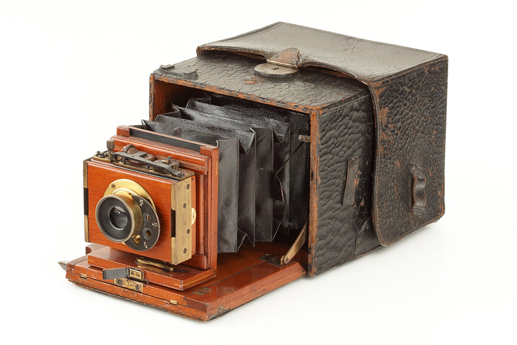 British folding camera disguised in a camera bag, for 8x10.5cm exposures, Wray 5" R.R. no.7364 with rotating disc diaphragm in Thornton Pickard Time shutter, two cassettes, a very rare camera