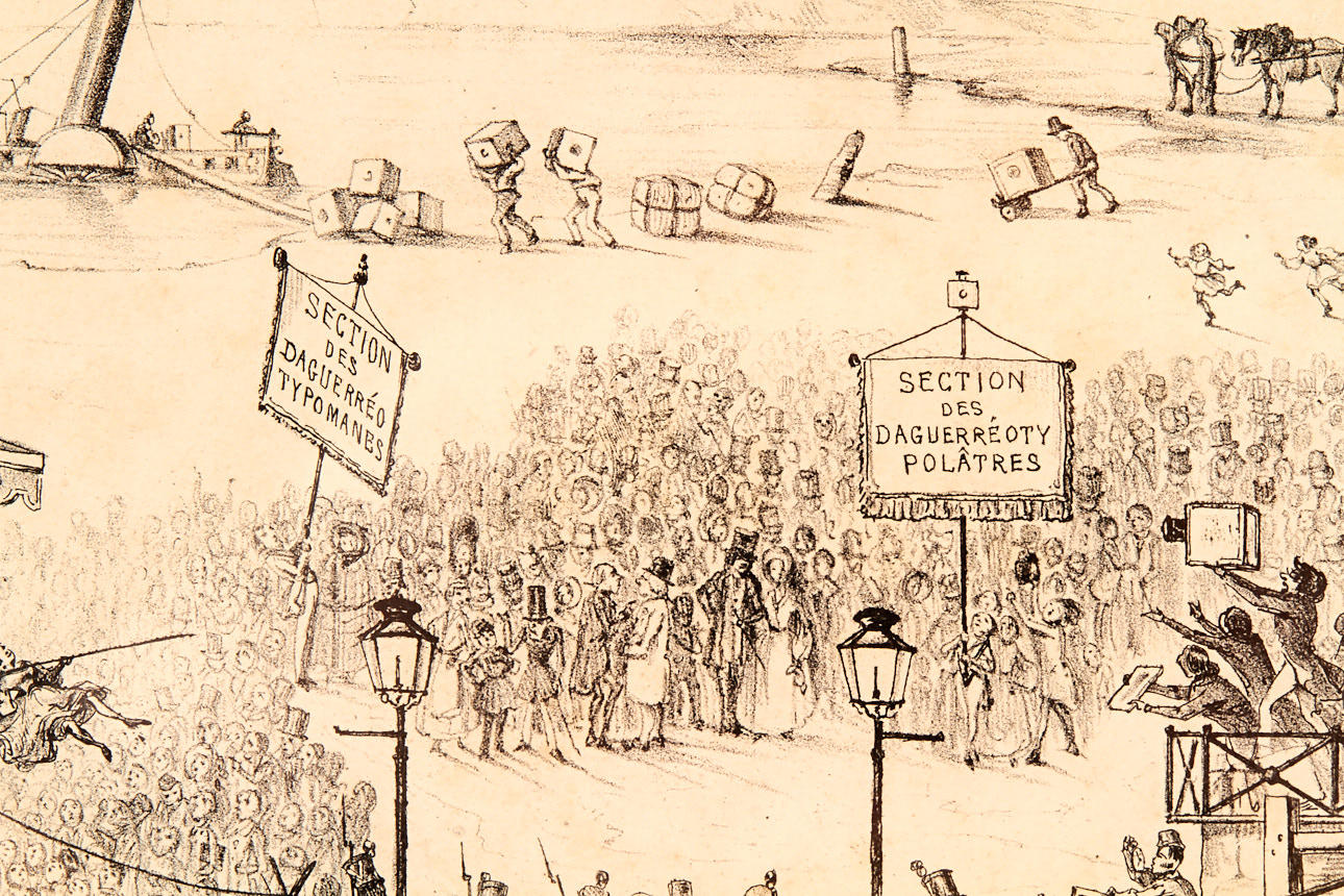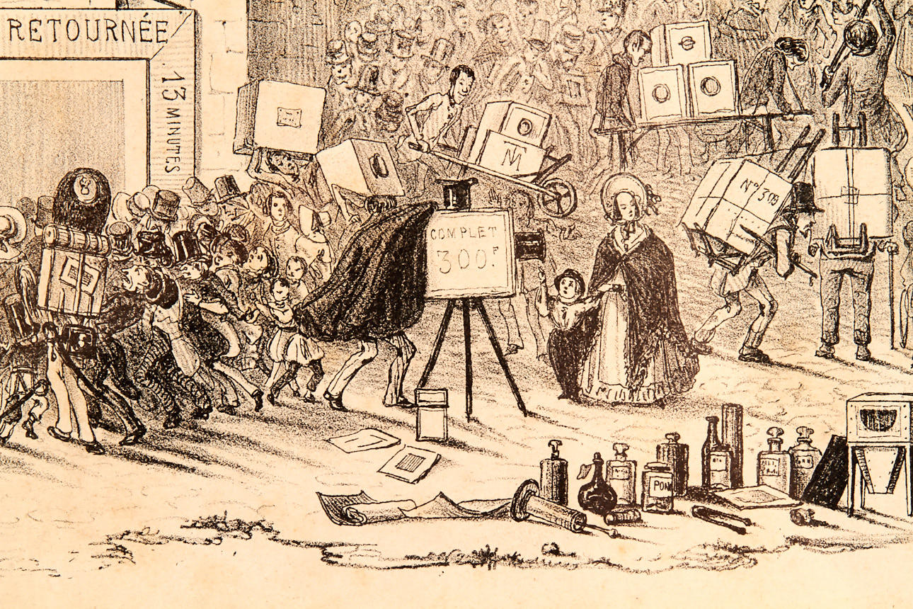 Once the secret of making daguerreotypes was announced to the French public on August 19, 1839, fever for photography ran high in Paris. Jacques Louis Mandé Daguerre had relinquished his patent on the process, which caused a great rush among opportunity seekers eager to earn a living by it. Théodore Maurisset's lithograph playfully imagined a time when vast crowds would wait in line to have their portrait taken. It pokes fun at the pandemonium caused by the daguerreotype's invention and chronicles the many ways entrepreneurs hoped to cash in on the craze, from selling supplies and equipment to giving lessons in how to perform photographic procedures. It shows also the Maison Susse Freres, the maker of the first commercial camera after the plans of Daguerre - the only existing camera is displayed in WestLicht - Vienna - Museum of Photography. The original lithograph is in fine condition, c.36x25cm, in wooden frame