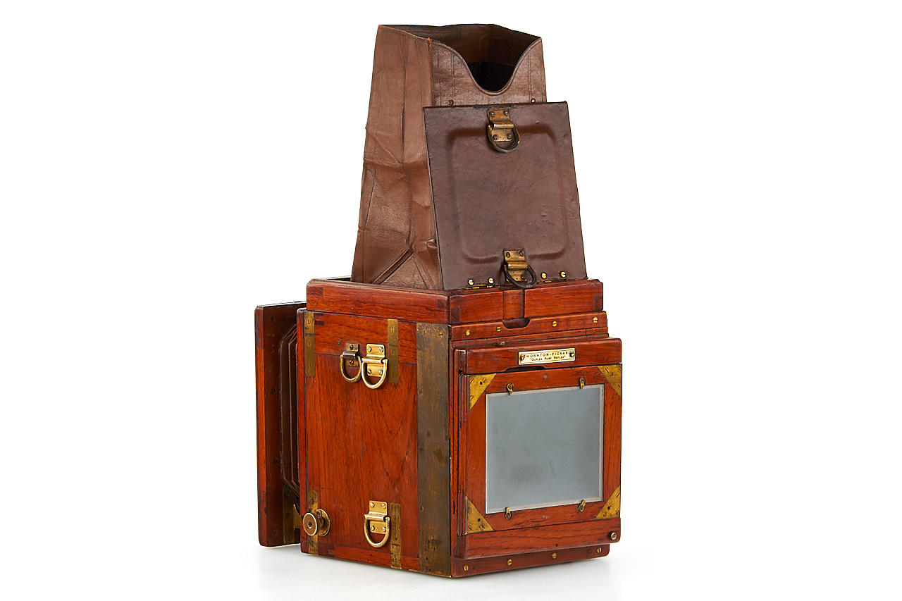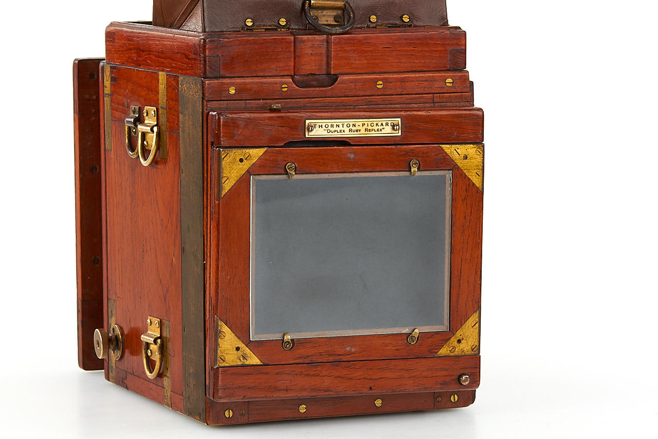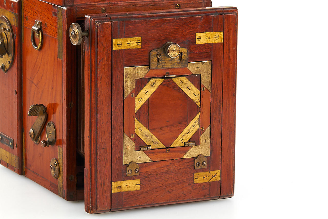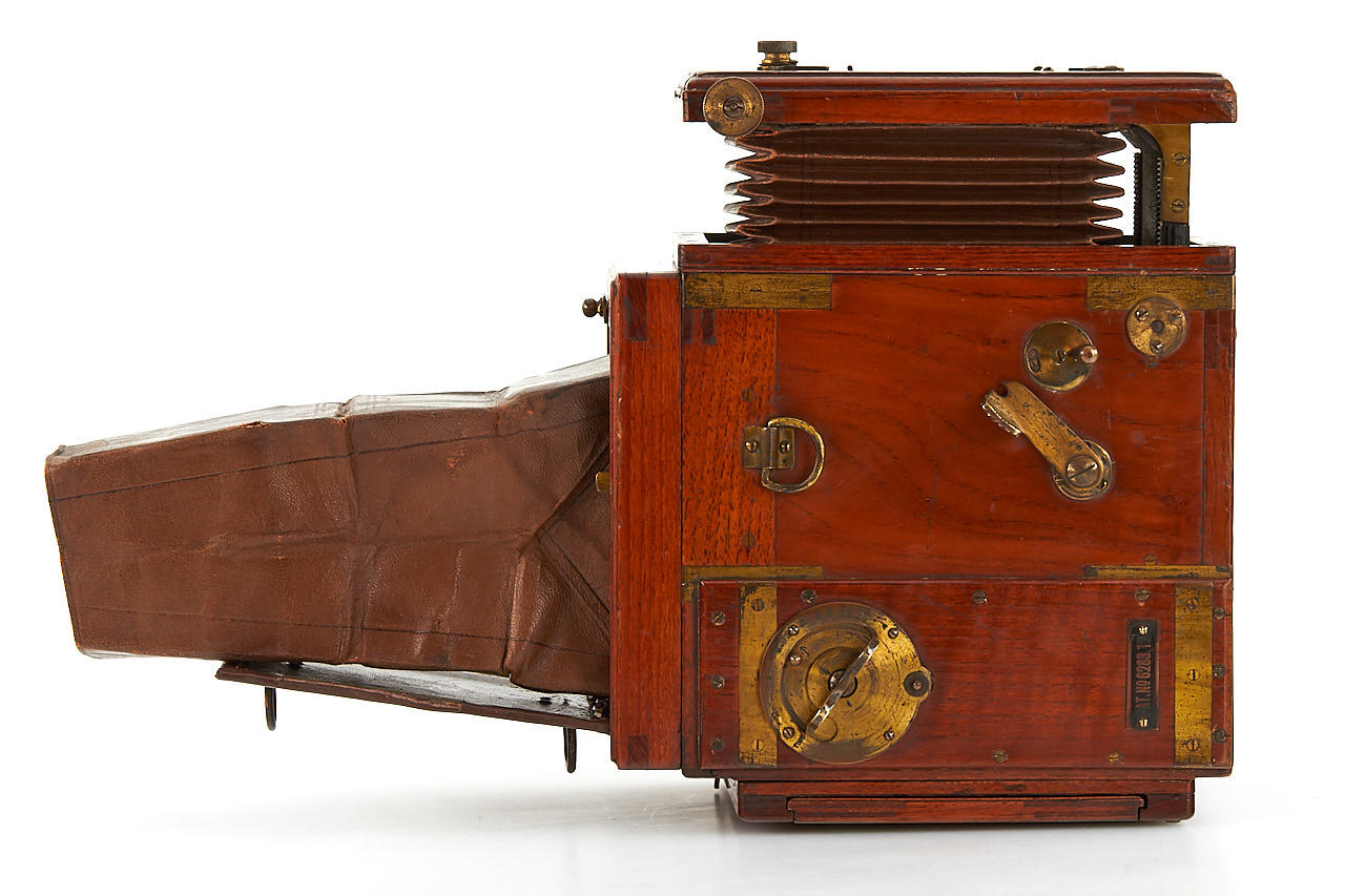 tropical SLR camera for 3 1/4 x 4 1/4" exposures, polished teak with brass fittings, brown leather bellows and viewing hood, uncommon Ross London Tessar Patent 4.5/6" no.82933, focal plane shutter (accuracy not tested), in very fine condition