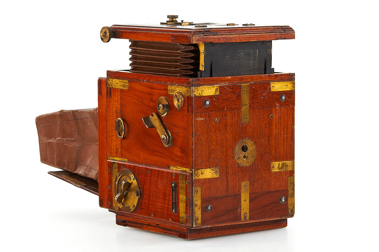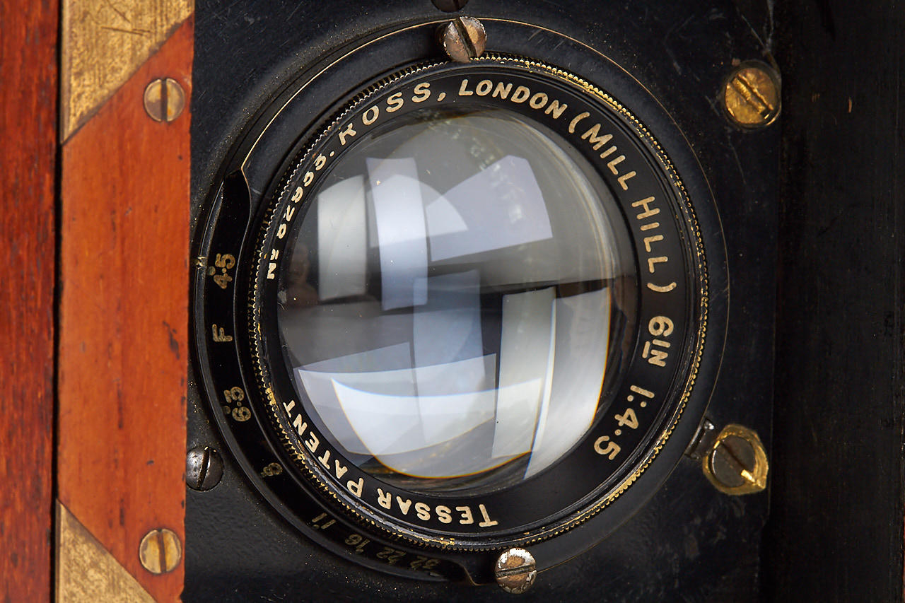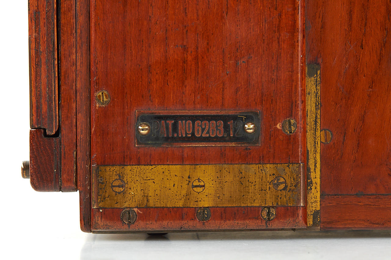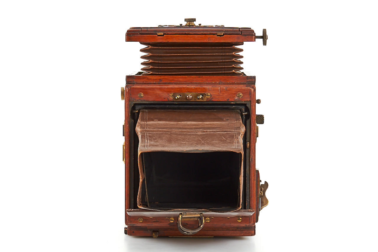 tropical SLR camera for 3 1/4 x 4 1/4" exposures, polished teak with brass fittings, brown leather bellows and viewing hood, uncommon Ross London Tessar Patent 4.5/6" no.82933, focal plane shutter (accuracy not tested), in very fine condition