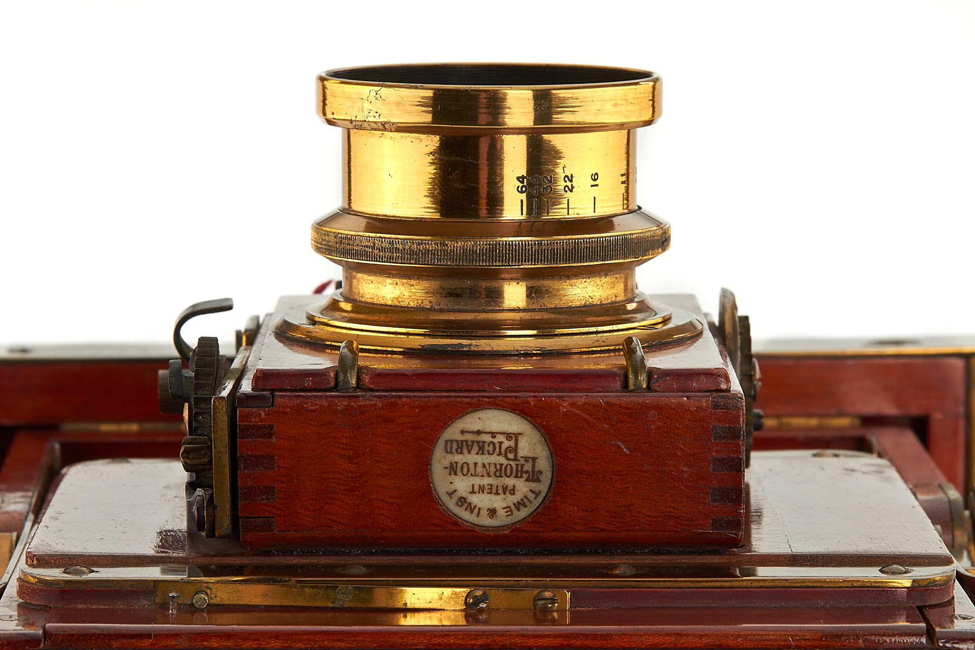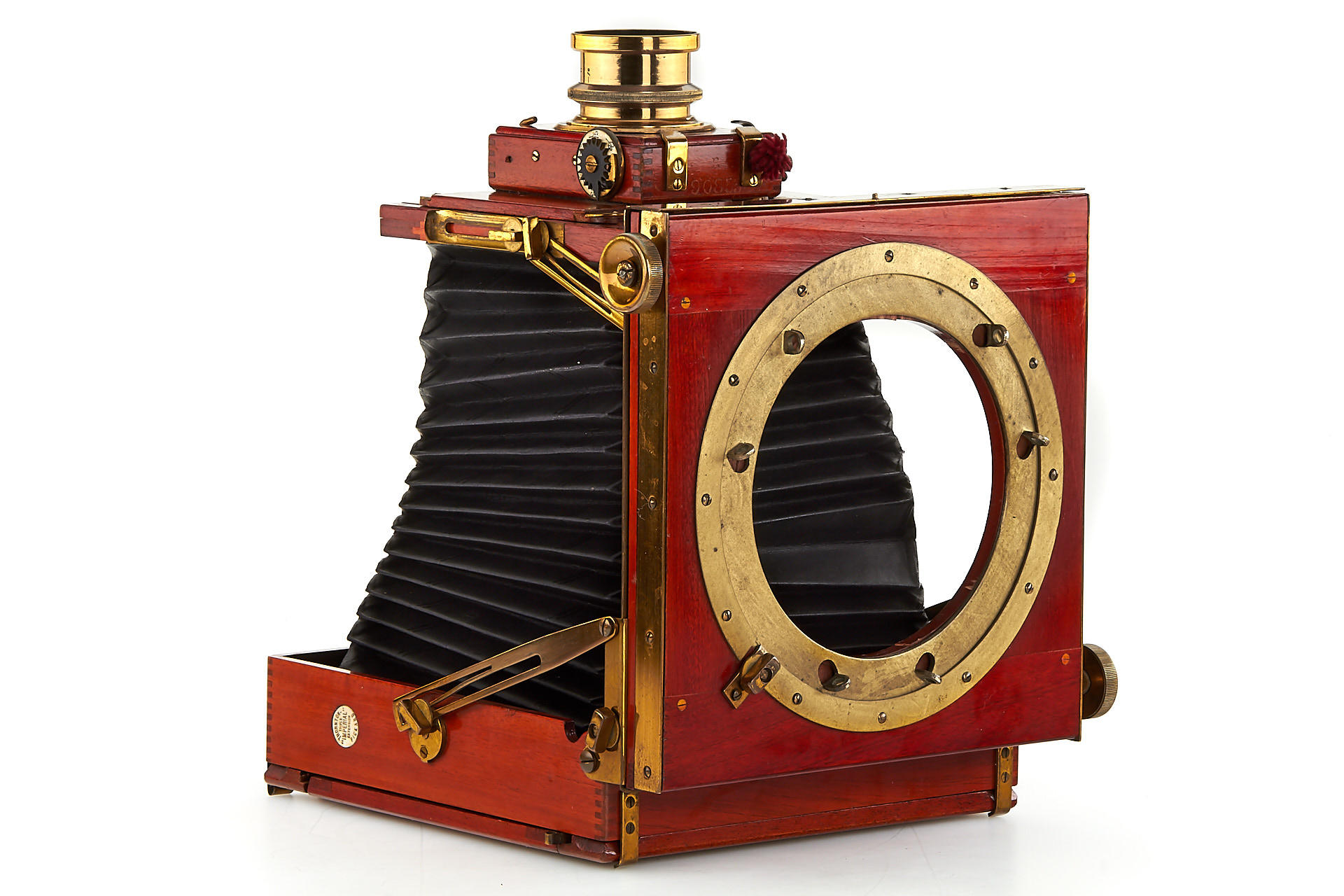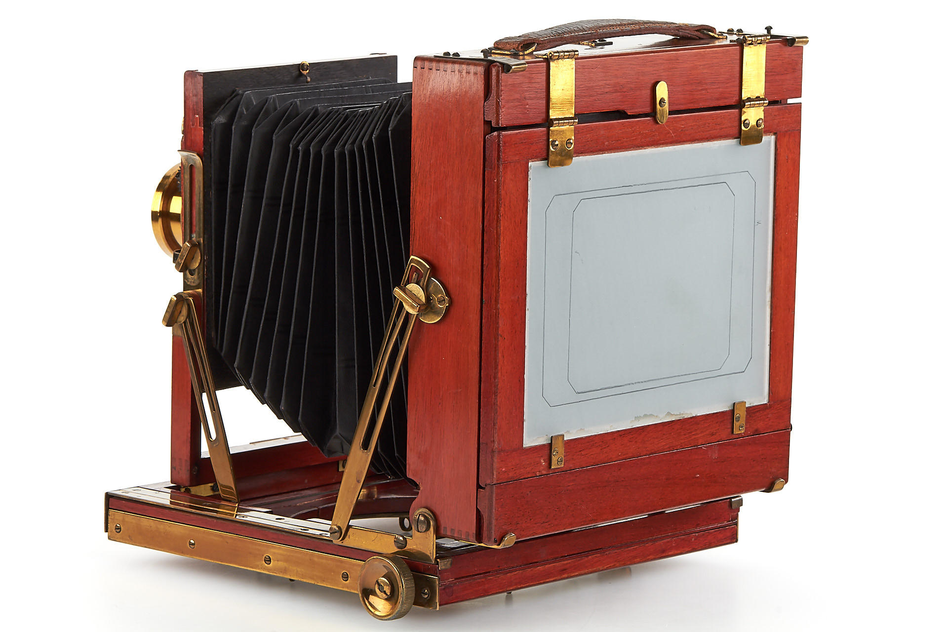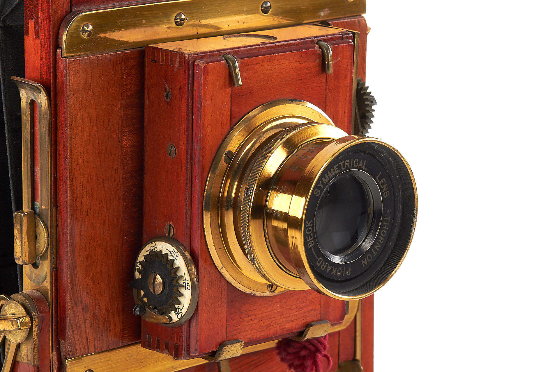 5x7" mahogany field camera in excellent condition, lightproof bellows, complete fittings, with Beck Symmetrical brass lens in Thornton-Pickard focal plane shutter (not tested)