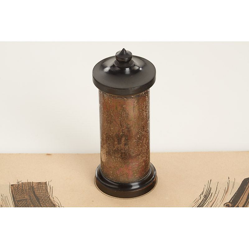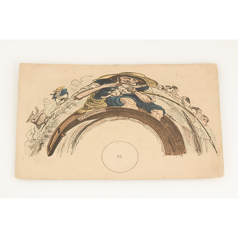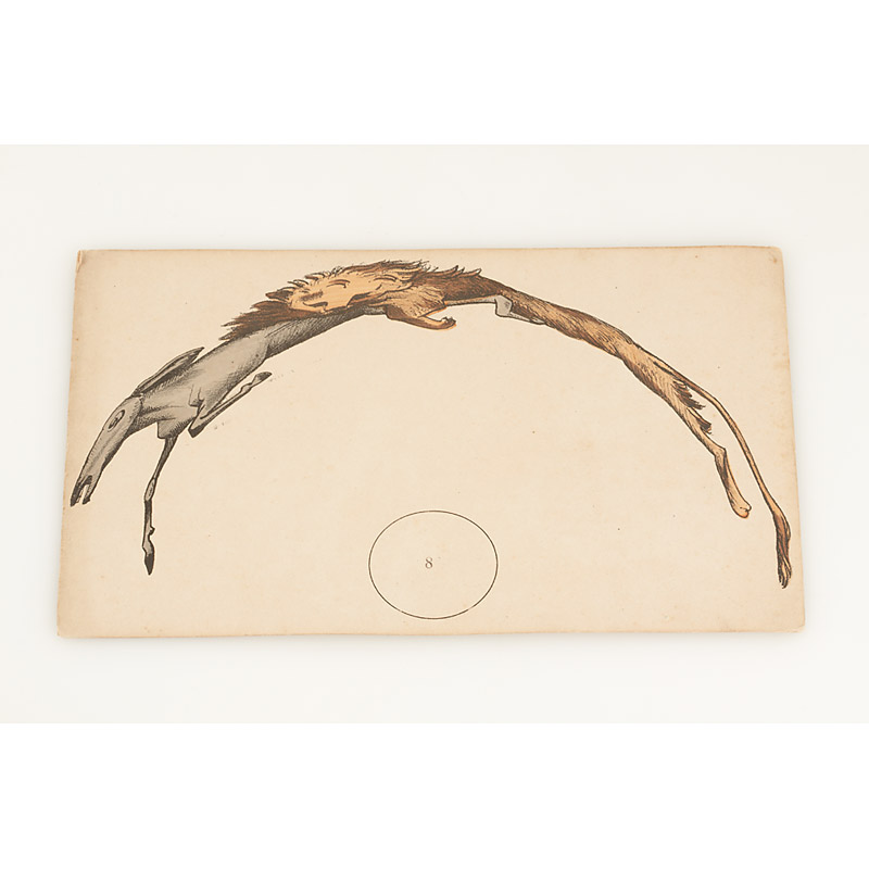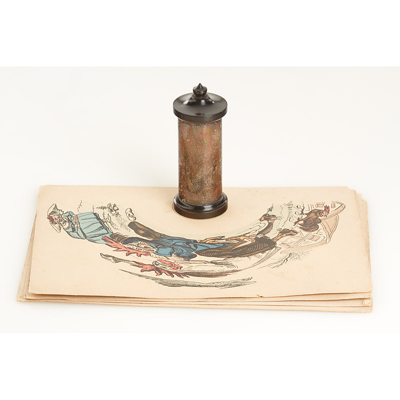 French Anamorphoscope comprising 4 22.3x14.8cm images: (1) a fisher (2) a goat (3) chickens (4) a donkey. Together with a small cylindrical Anamorphoscope in original condition