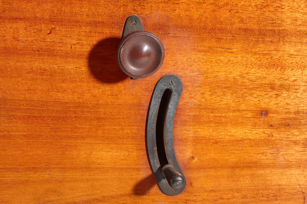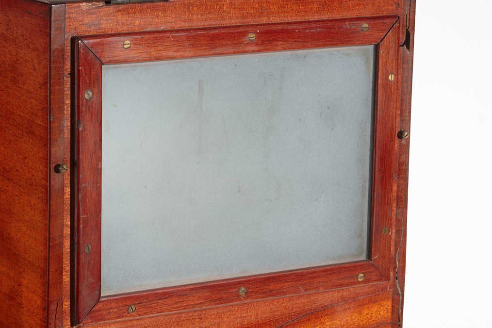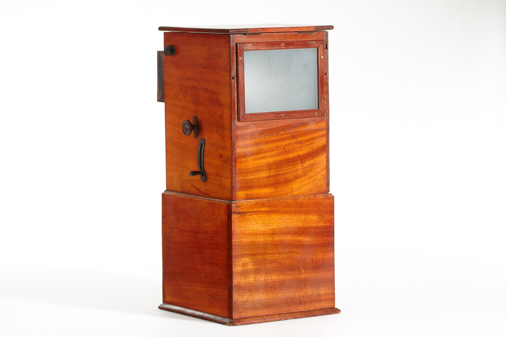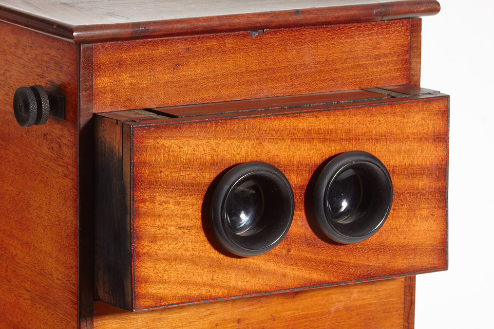 French stereo viewer with adjustable eye-pieces, total height: 54cm, lever-operated desktop viewer with trays holding 25 4.5x10.7cm glass slides, 6 trays included, concealed in the lower part of the viewer