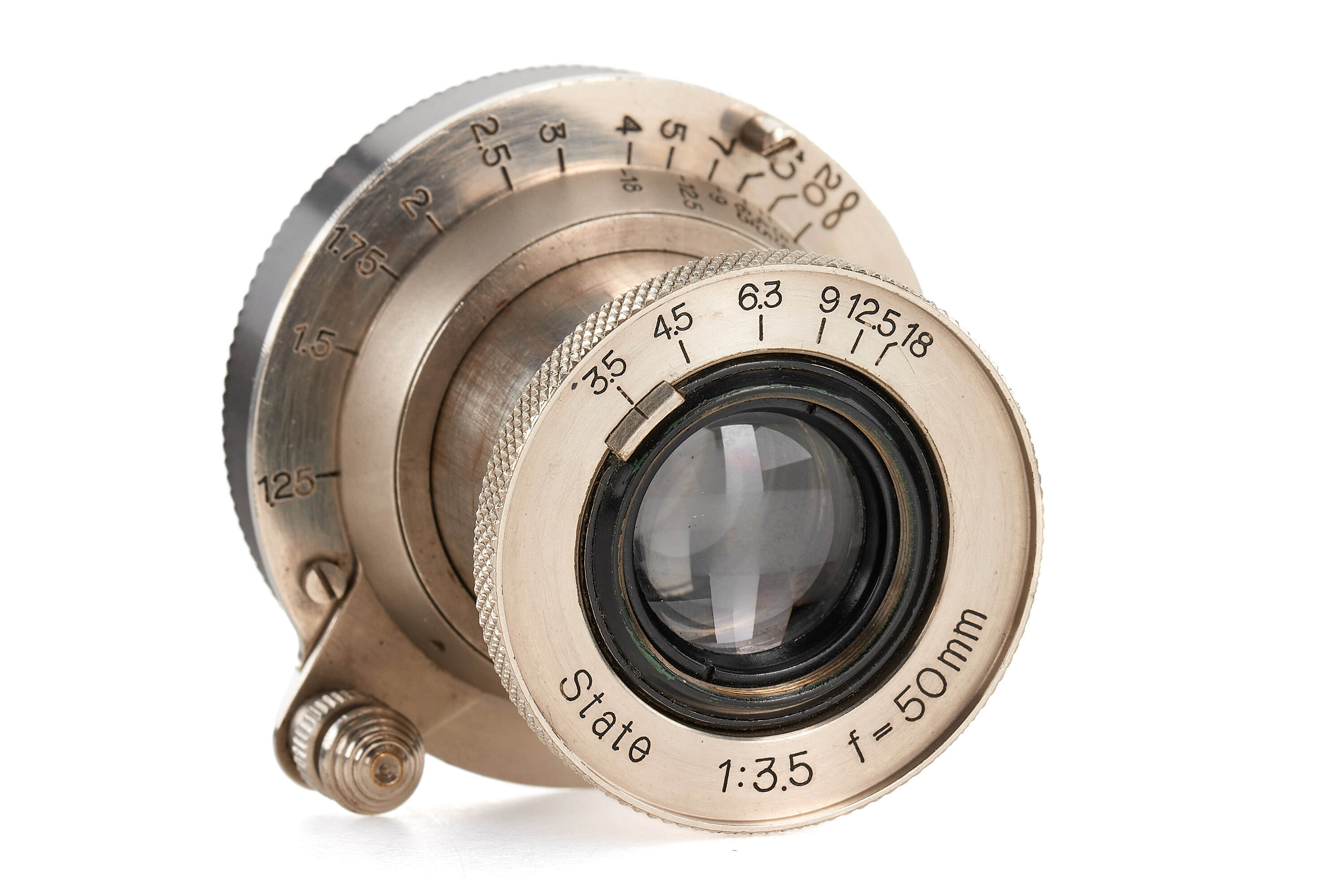 Tokyo Optical Co. (Japanese Tōkyō Kōgaku), later better known under the Topcon name, produced the Simlar 50mm f/3.5, a lens frequently supplied with Leotax cameras. The example offered here is one of the earliest nickel-finished versions, still engraved 'Tokyo Optical Co., State 3.5/50mm,' and built in a style closely resembling the Leitz Elmar. The lens is in beautiful condition, with very good optics, and ranks among the rarest Elmar copies ever produced in the Japanese camera industry.