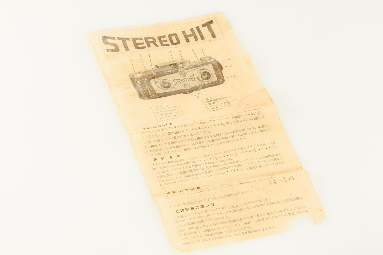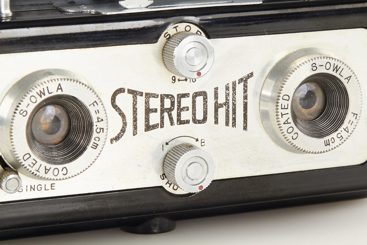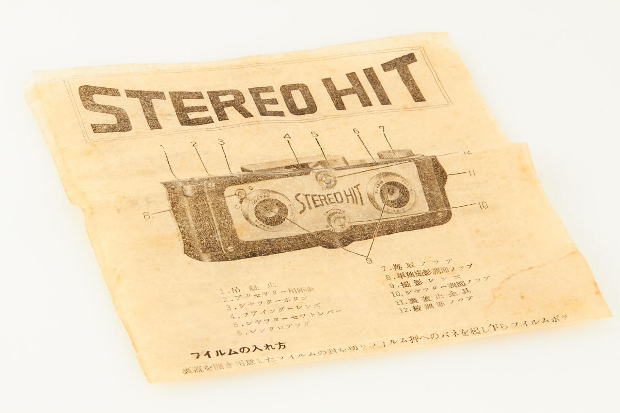rare Japanese stereo camera for 3x4cm exposures on 127 film, dual S-Owla 9/4.5cm lenses, with strap, maker's box and original Japanese instructions