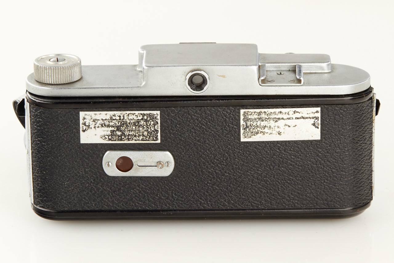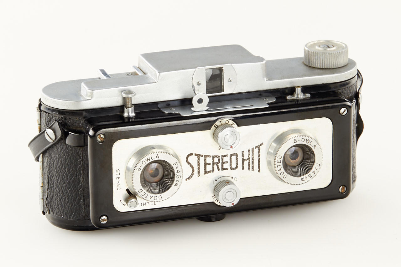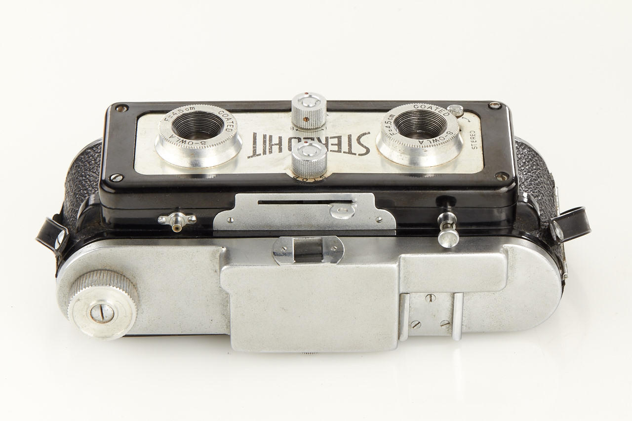 rare Japanese stereo camera for 3x4cm exposures on 127 film, dual S-Owla 9/4.5cm lenses, with strap, maker's box and original Japanese instructions