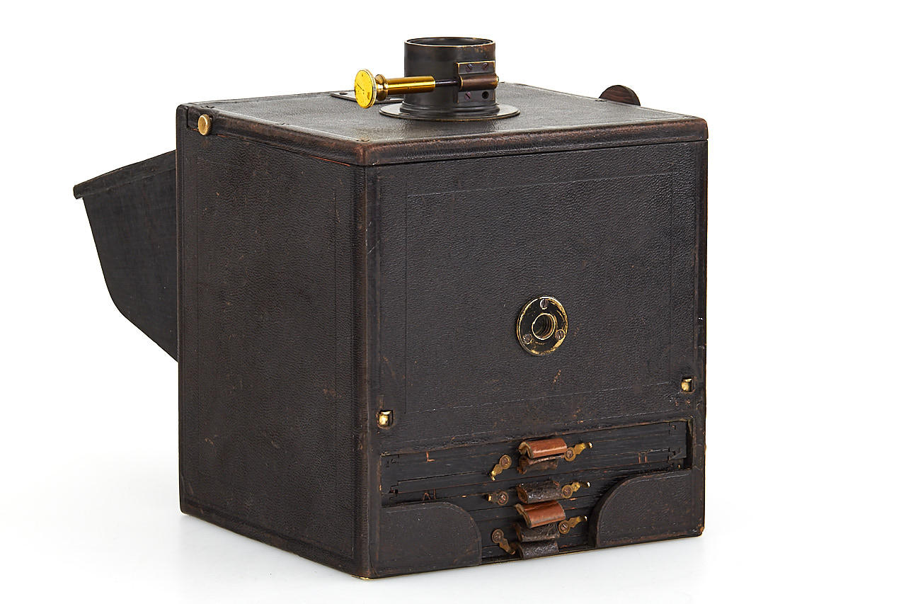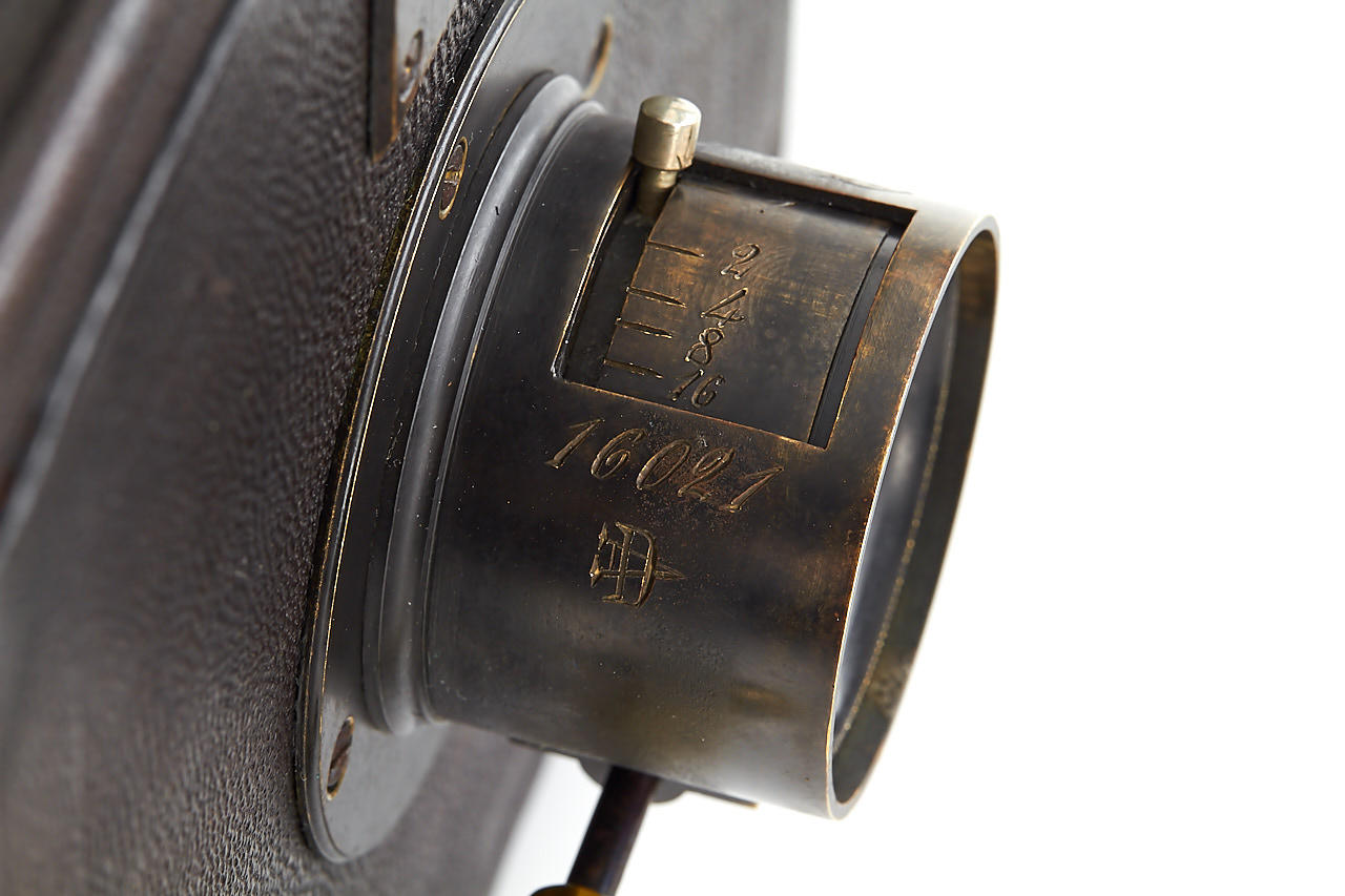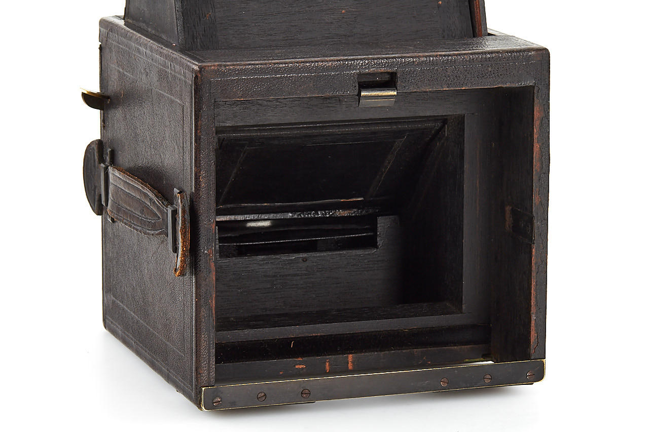 very rare, early French SLR camera for 9x12cm exposures, leather-covered wooden body in beautiful, original condition, top flap hiding magnifying spectacles, with matching Darlot Paris lens no.16021, three original double plate holders, very hard to find in this excellent, unrestored condition