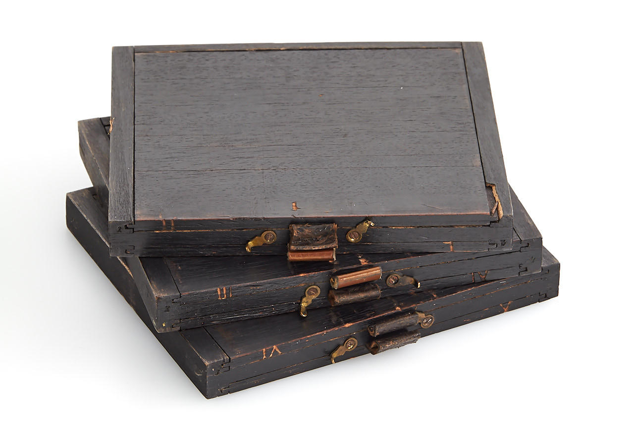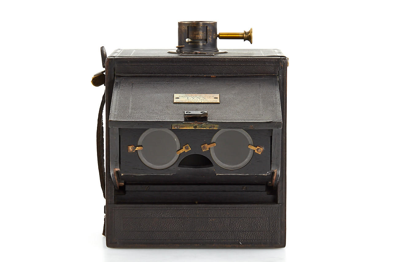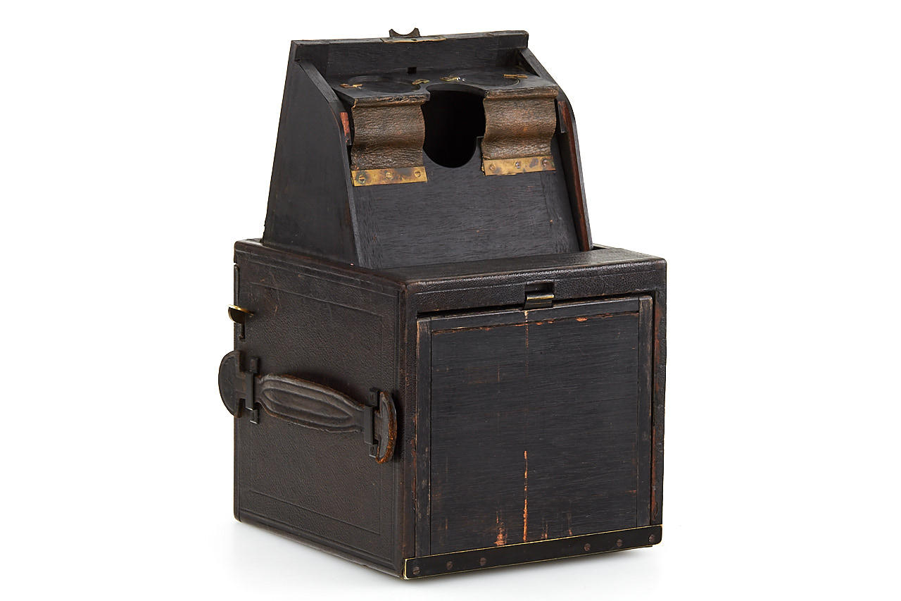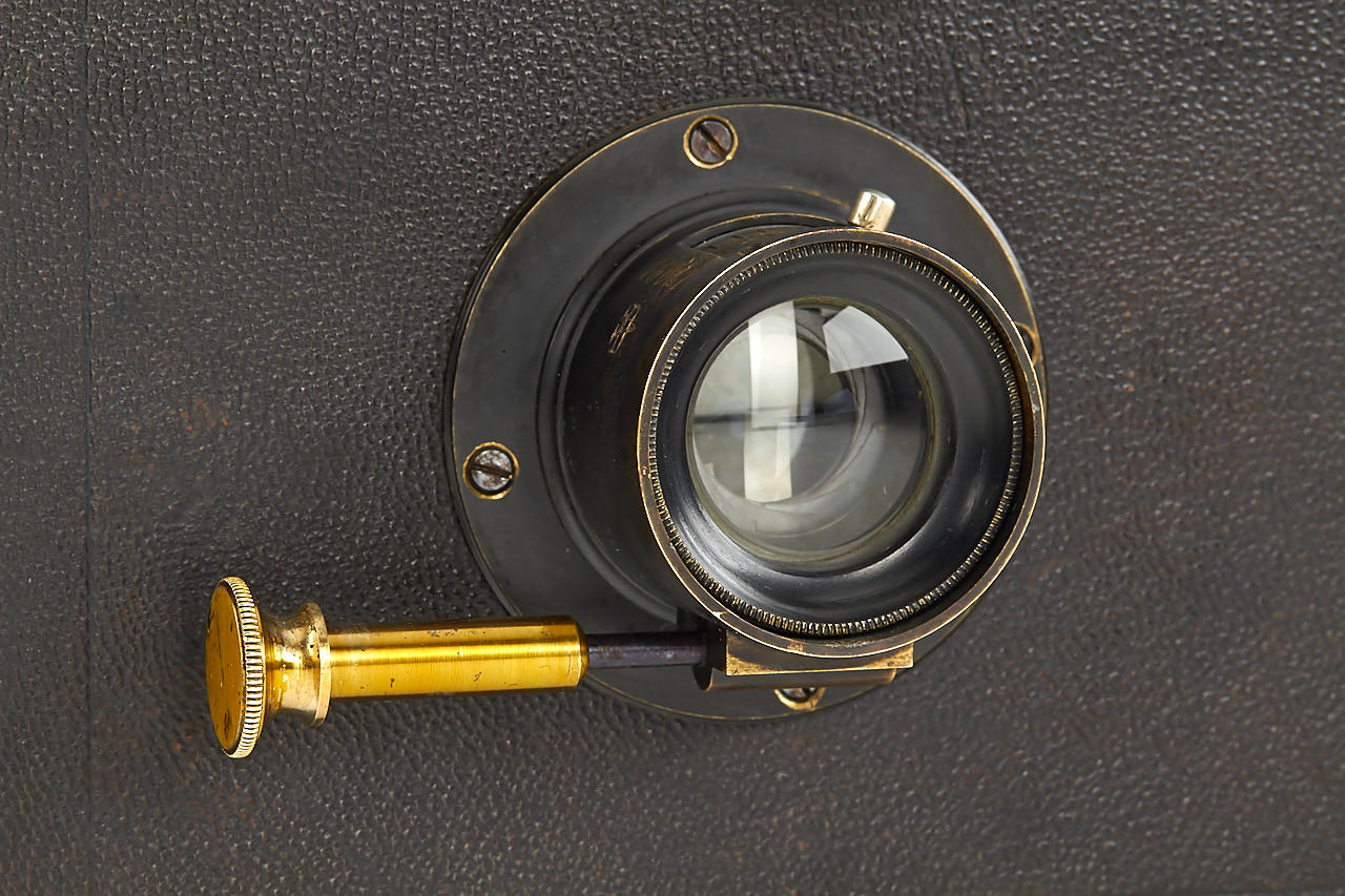 very rare, early French SLR camera for 9x12cm exposures, leather-covered wooden body in beautiful, original condition, top flap hiding magnifying spectacles, with matching Darlot Paris lens no.16021, three original double plate holders, very hard to find in this excellent, unrestored condition