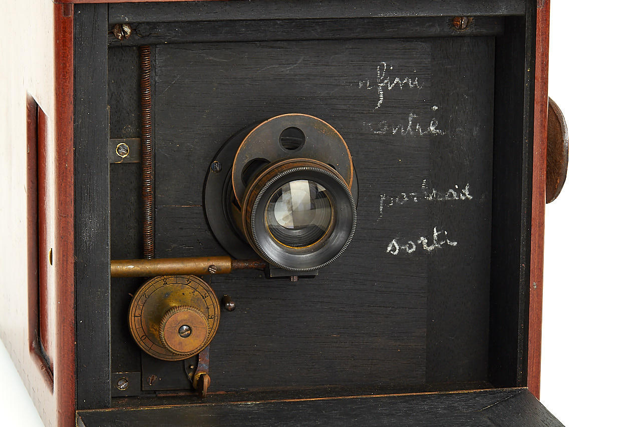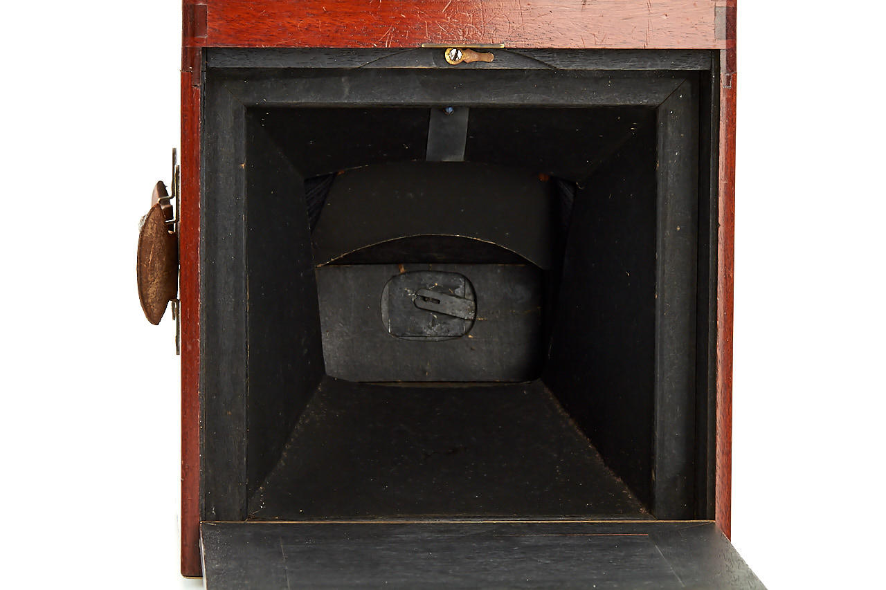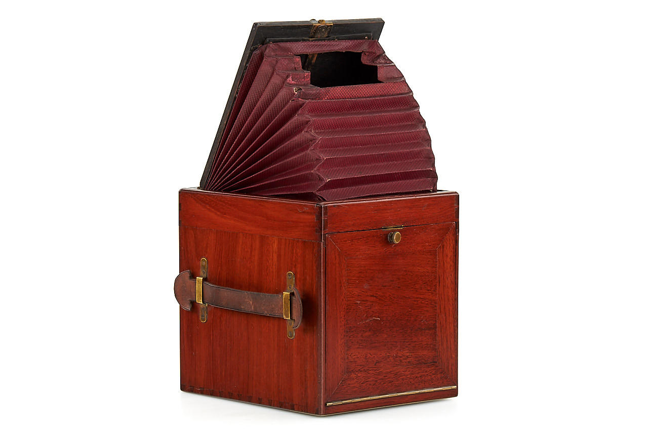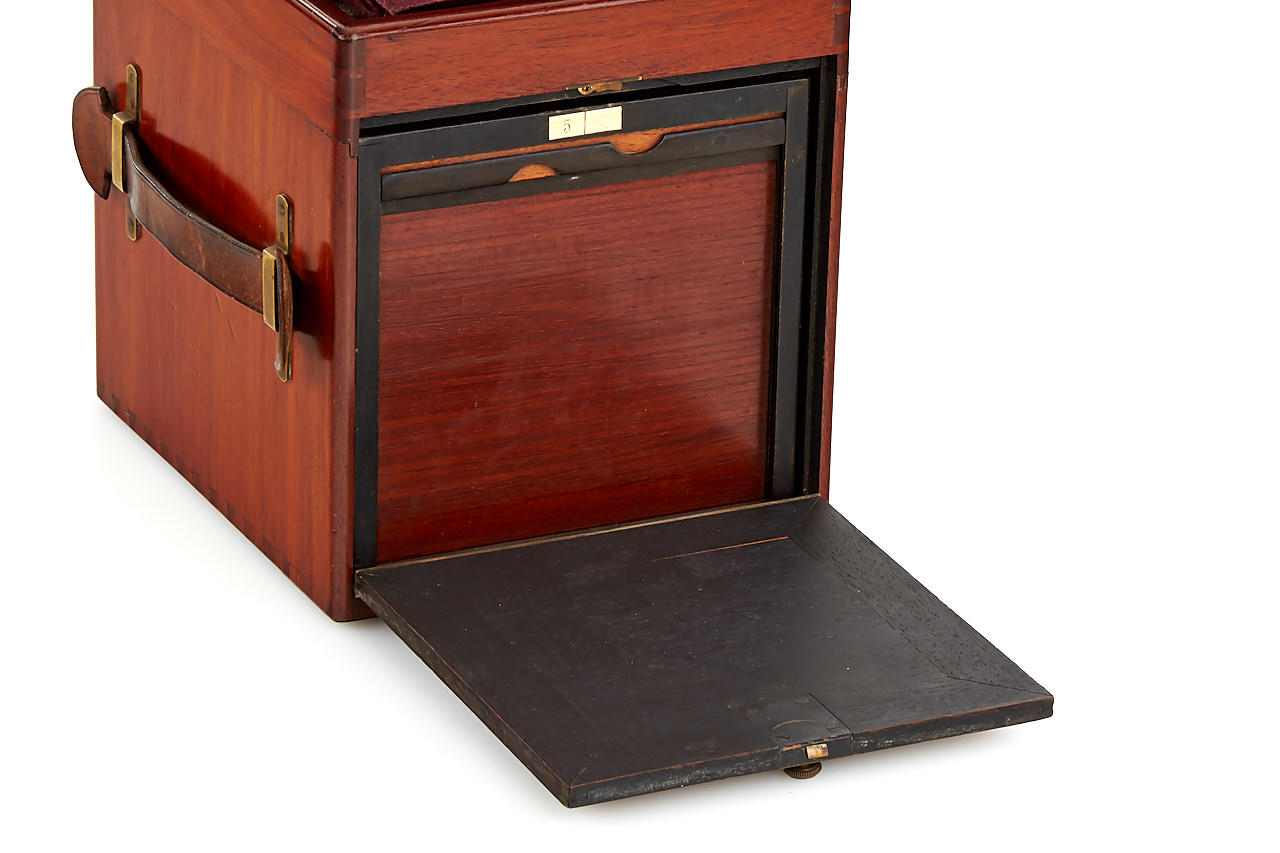 This extremely rare camera was the first French reflex camera, for plates 9x12cm, Darlot Planigraphe lens no.13116, Luxus model in vanished mahogany, red leather hood, brass engraved lens cap, inside stamped with serial number '4', in fantastic original condition, less than 5 of these beautifully designed cameras are known to exist