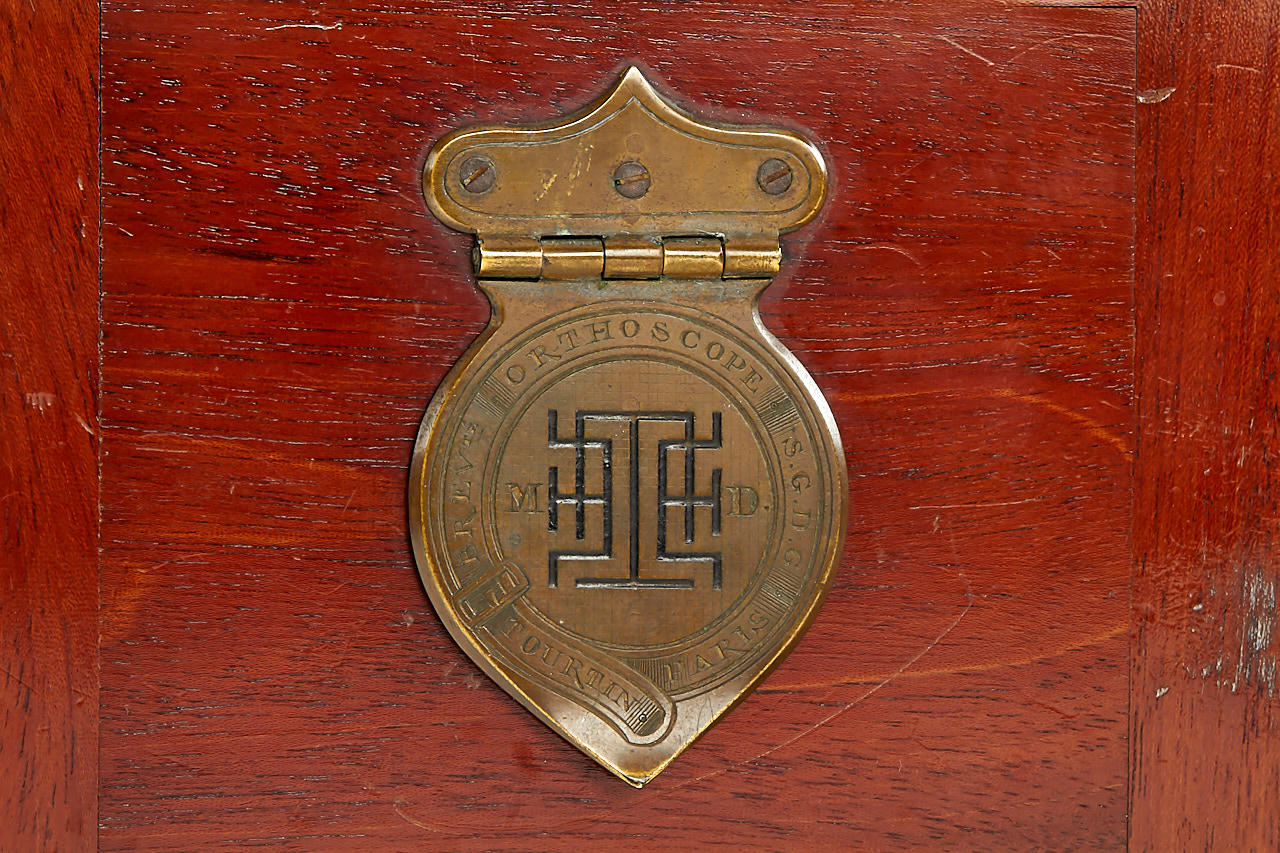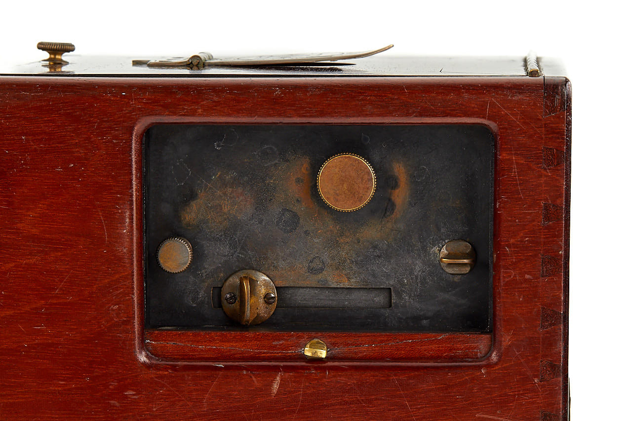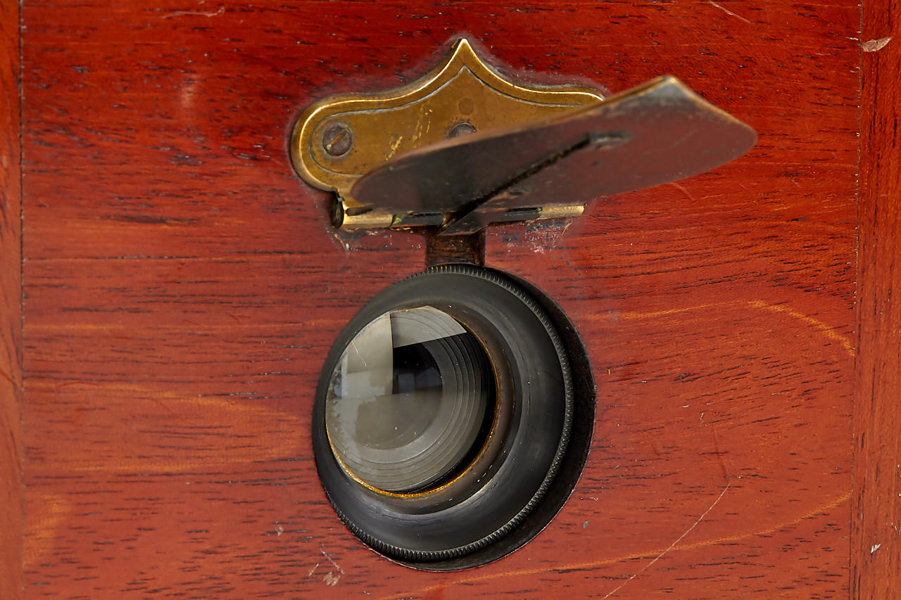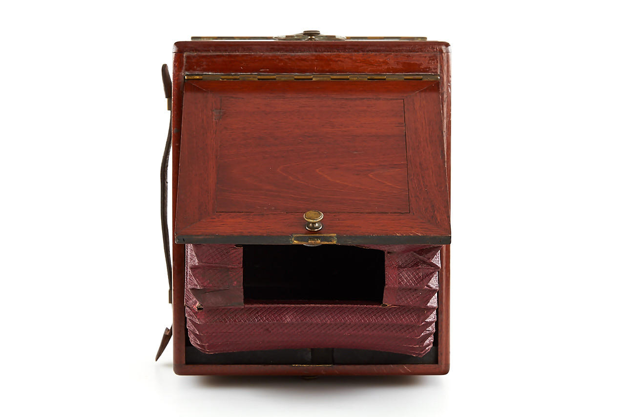 This extremely rare camera was the first French reflex camera, for plates 9x12cm, Darlot Planigraphe lens no.13116, Luxus model in vanished mahogany, red leather hood, brass engraved lens cap, inside stamped with serial number '4', in fantastic original condition, less than 5 of these beautifully designed cameras are known to exist