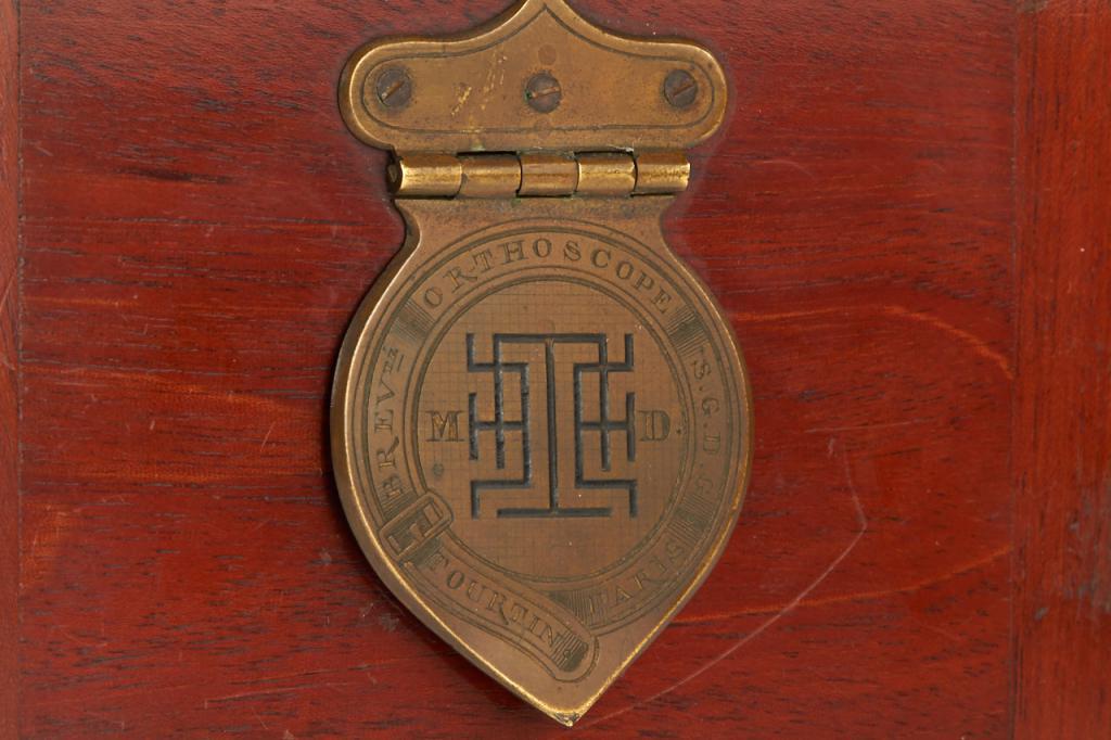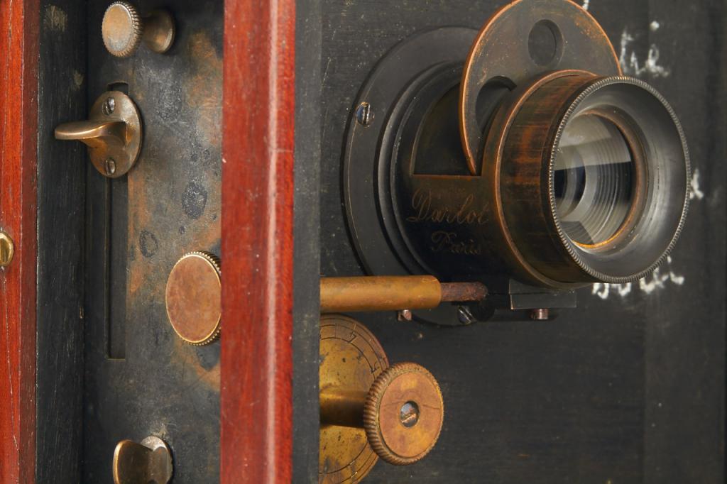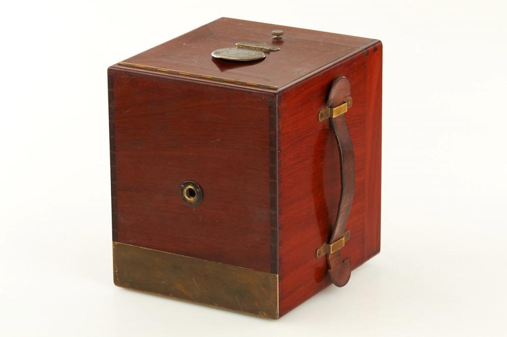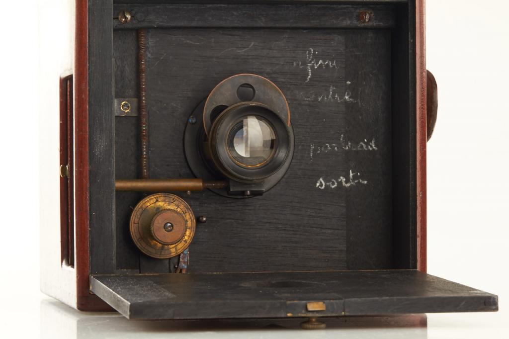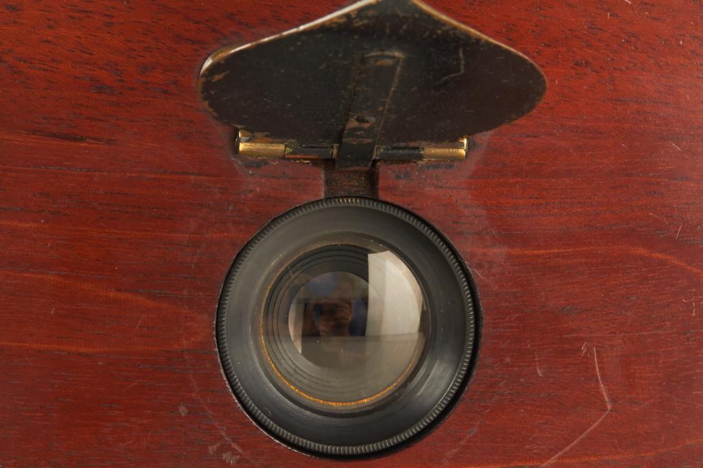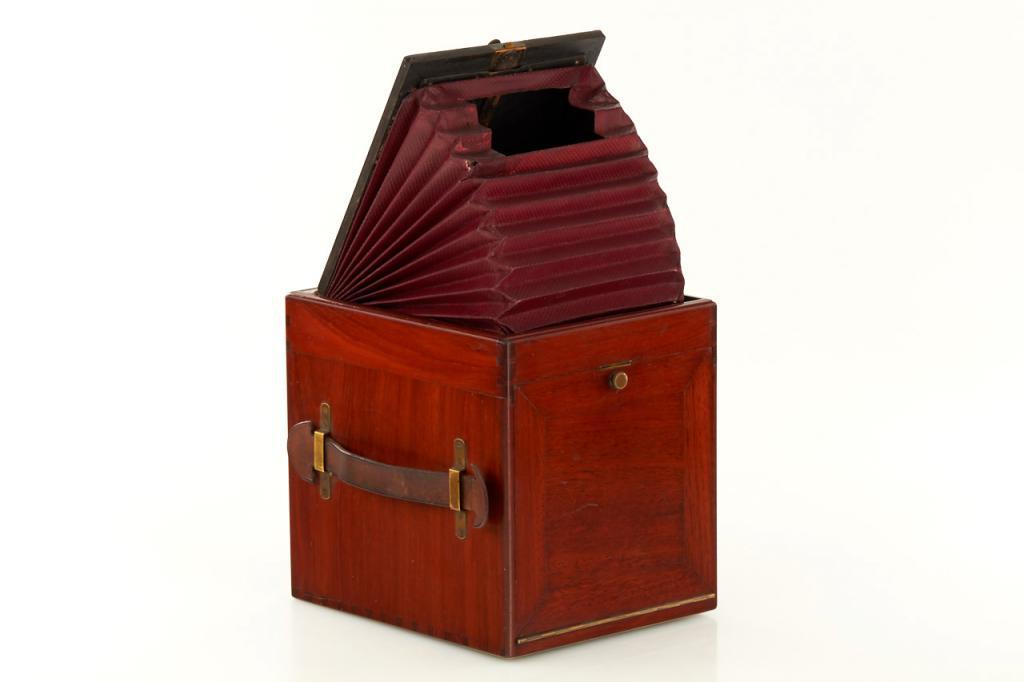 This extremely rare camera was the first French reflex camera, for plates 9x12cm, Darlot Planigraphe lens no.13115, luxus model in vanished mahogany, red leather hood, brass engraved lens cap, inside stamped with serial number '4', in fantastic original condition, less than 5 of these beautifully designed cameras are known to exist