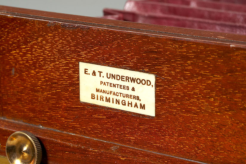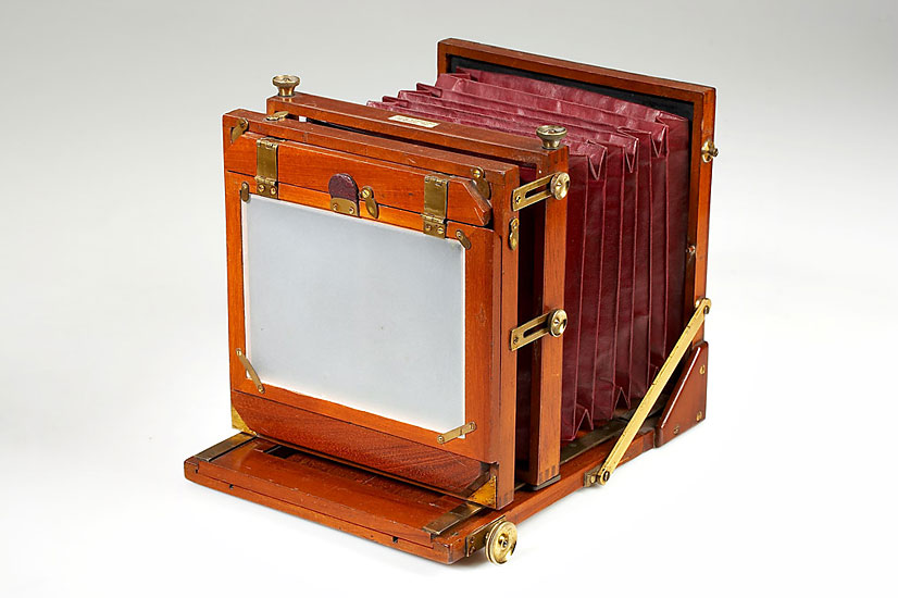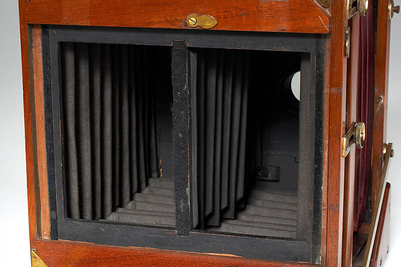 1/2 plate tailboard stereo camera, mahogany body, red leather bellows, a pair of brass T/H Cook Series 3 6.5x4 3/4 Inches lenses no. 8459/8460, camera in fine and original condition, also brass lens for mono exposures on lensboard, mahogany filmholder