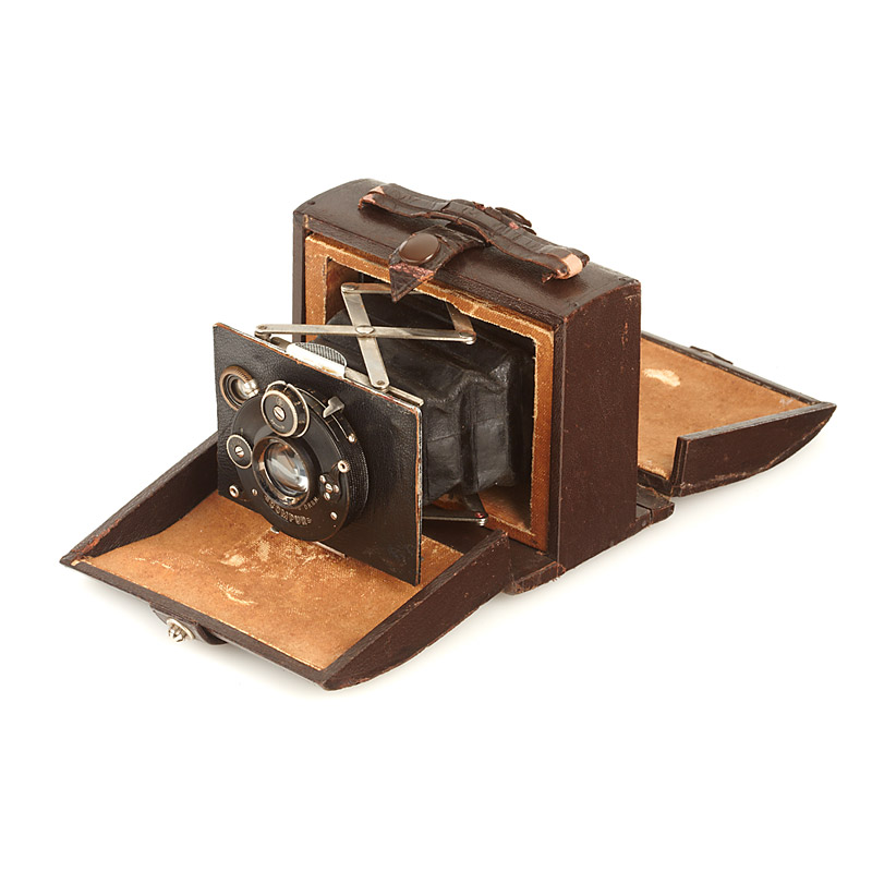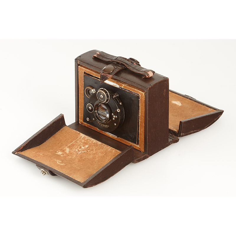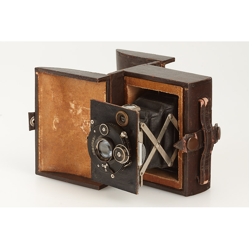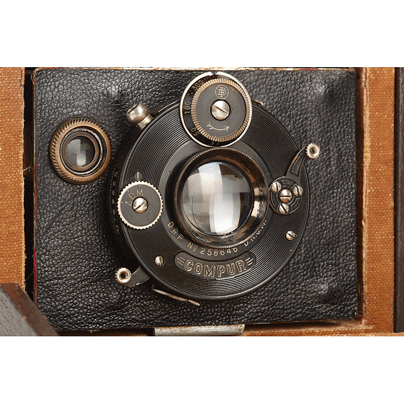 concealed strut-folding camera built into a leather pocket case for plates 4.5x6cm, lens in dial-set Compur shutter