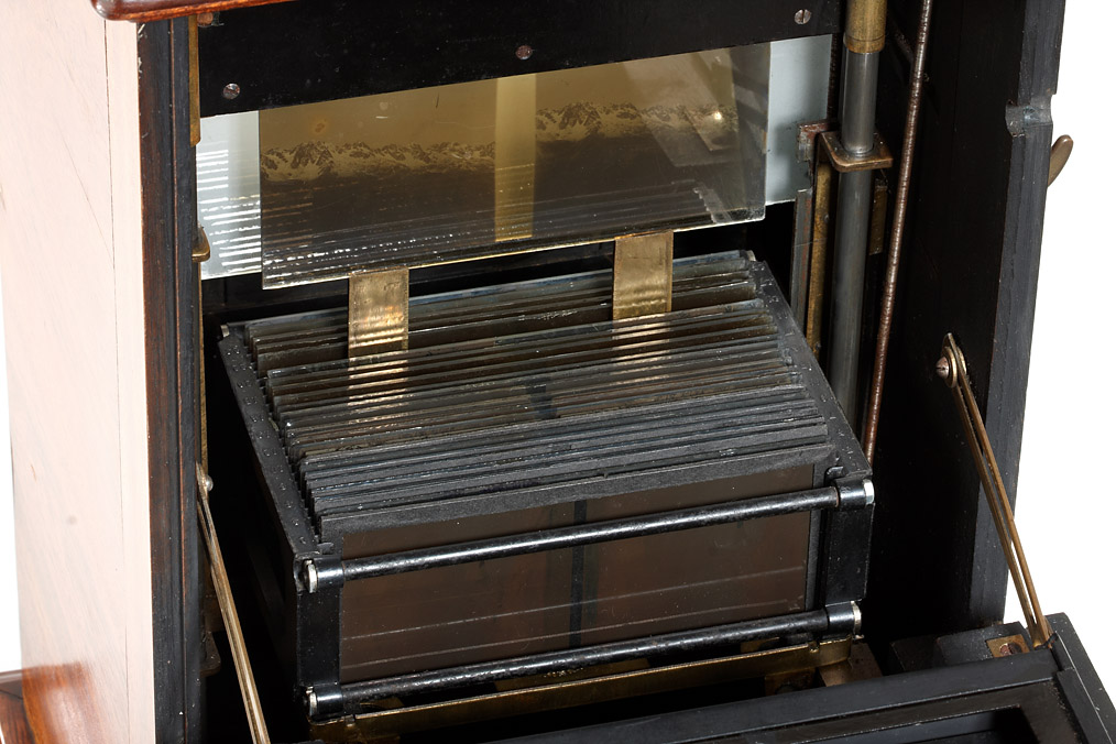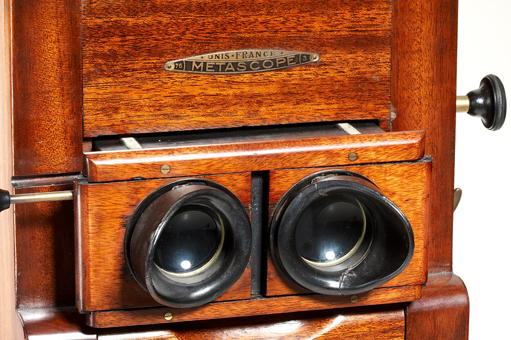 beautifully designed table-top viewer produced in the early 1920's by Mattey Paris, sold under the Unis label, the ‘Metascope’ replaced Mattey's earlier ‘Stereothéque’. A unique feature of the ‘Metascope’ is its ability to view either 45x107, or 6x13 format slides, this is done by using the appropriate size trays and inserting a metal mask behind the lenses (not included). Adjustable focus and eye base, image indicator, customized electrical illumination. A very interesting and decorative viewer.