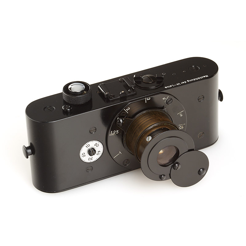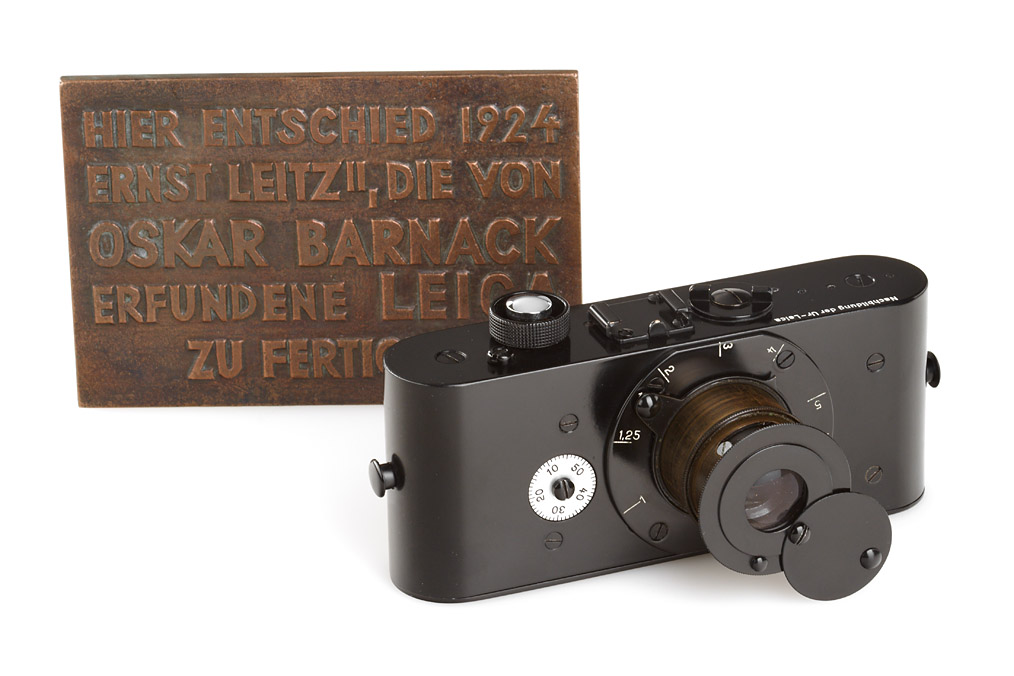 dummy camera of Ur-Leica, produced by Leitz Wetzlar in fine condition with metal plaque (8.2x12cm) 'Hier entschied 1924 Ernst Leitz II, die von Oskar Barnack erfundene Leica zu fertigen'
