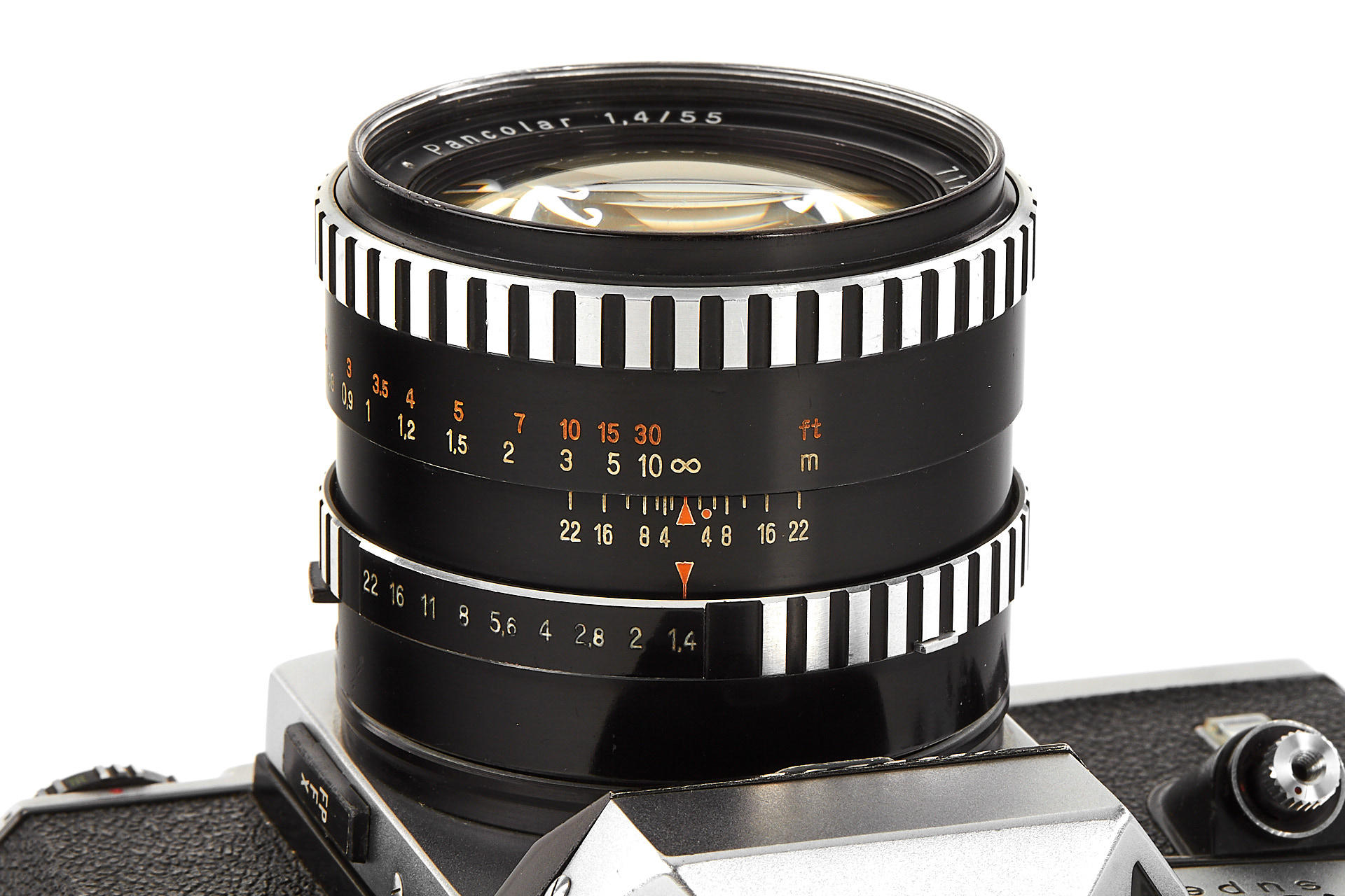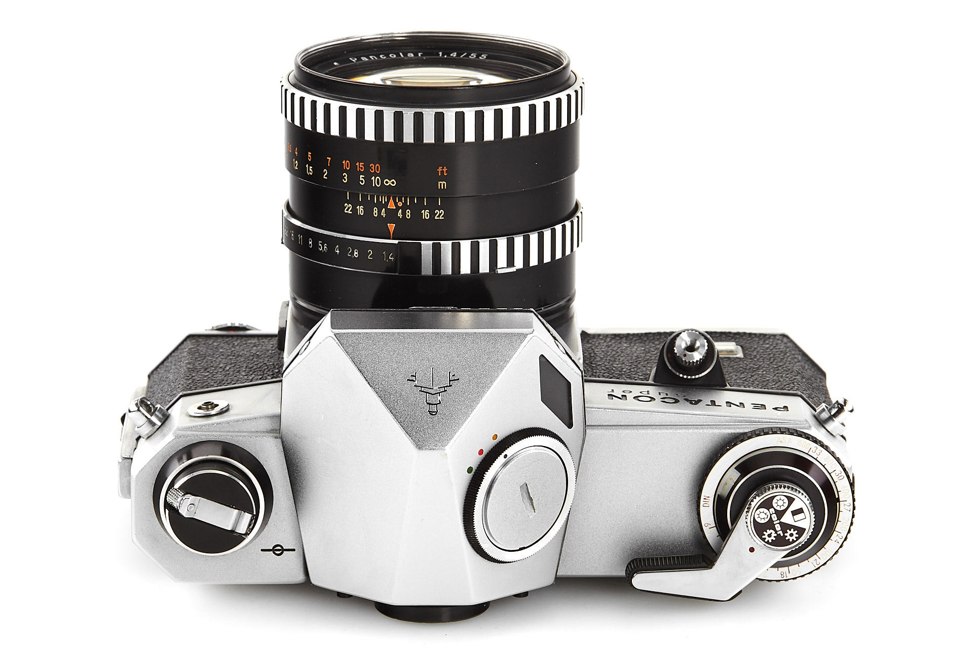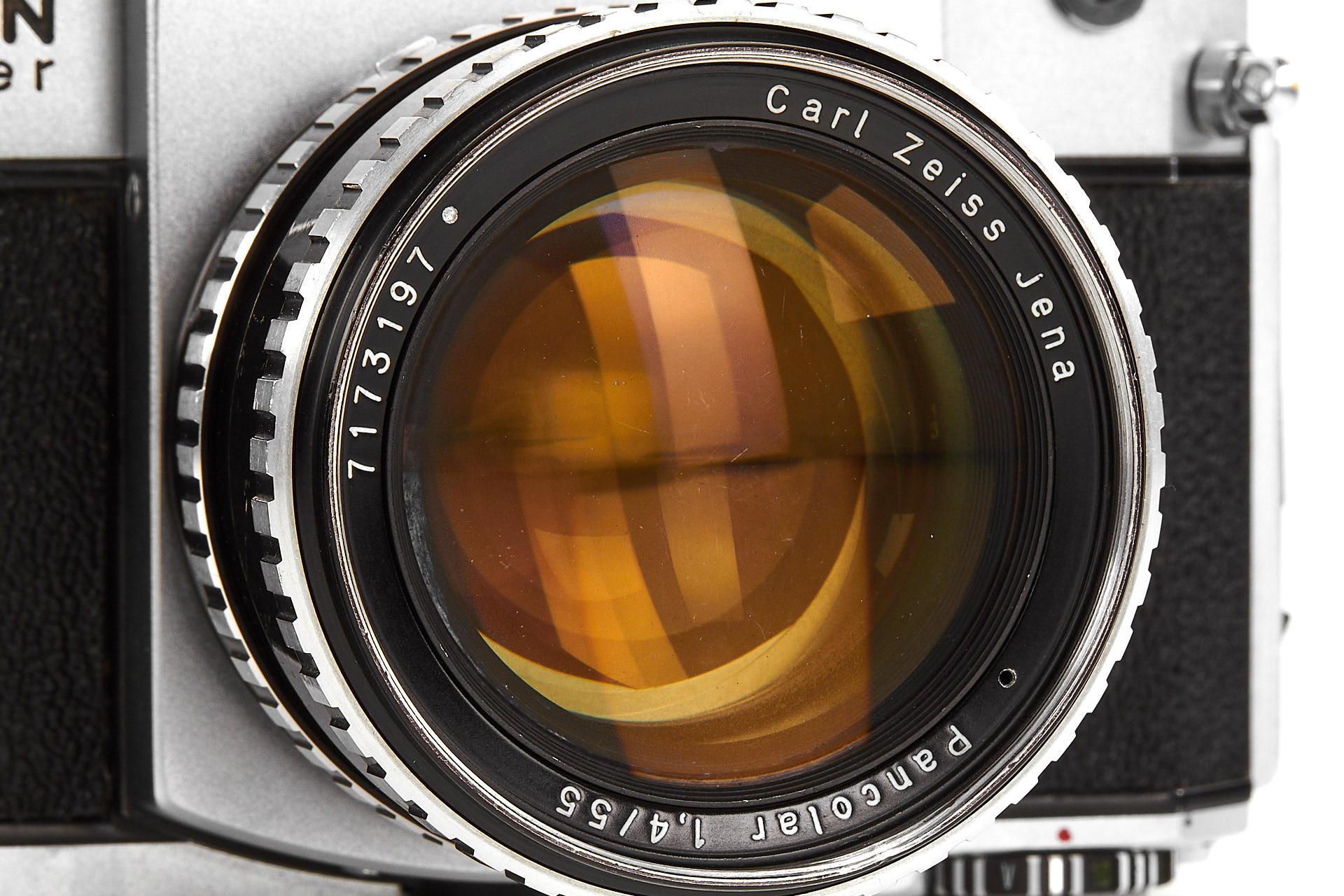 Only 4579 cameras were produced from this top of the line East German camera, this being one of the last body´s made, the most versatile camera within the Pentacon/Praktica production line, body in very good working condition, prism finder numbered '4869', light meter working, with matching and very rare M42 Pancolar 1.4/55mm no.7173197, from a batch of 1000 lenses from 1967, using glass containing Thorium hence its golden yellow colour (clear optics, some small scratches on front element), front cap.