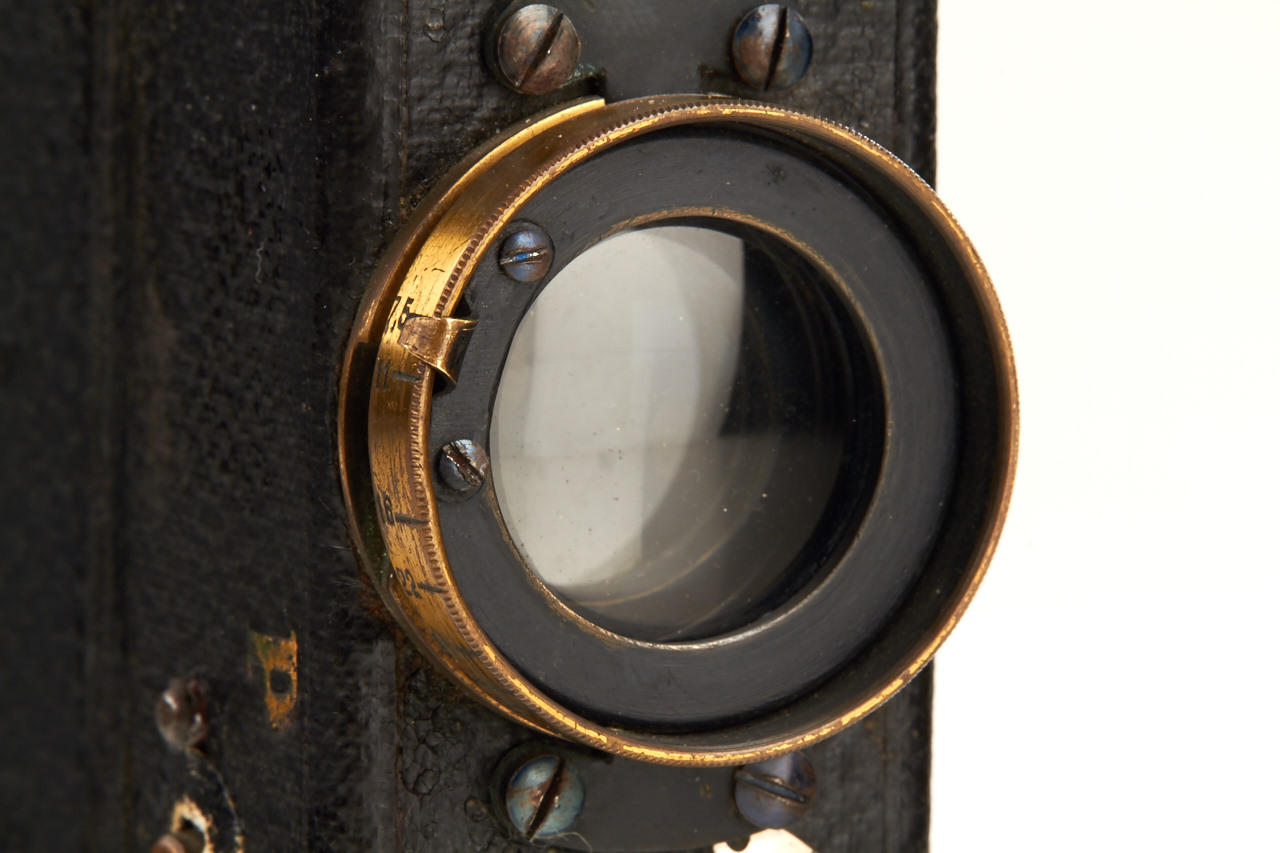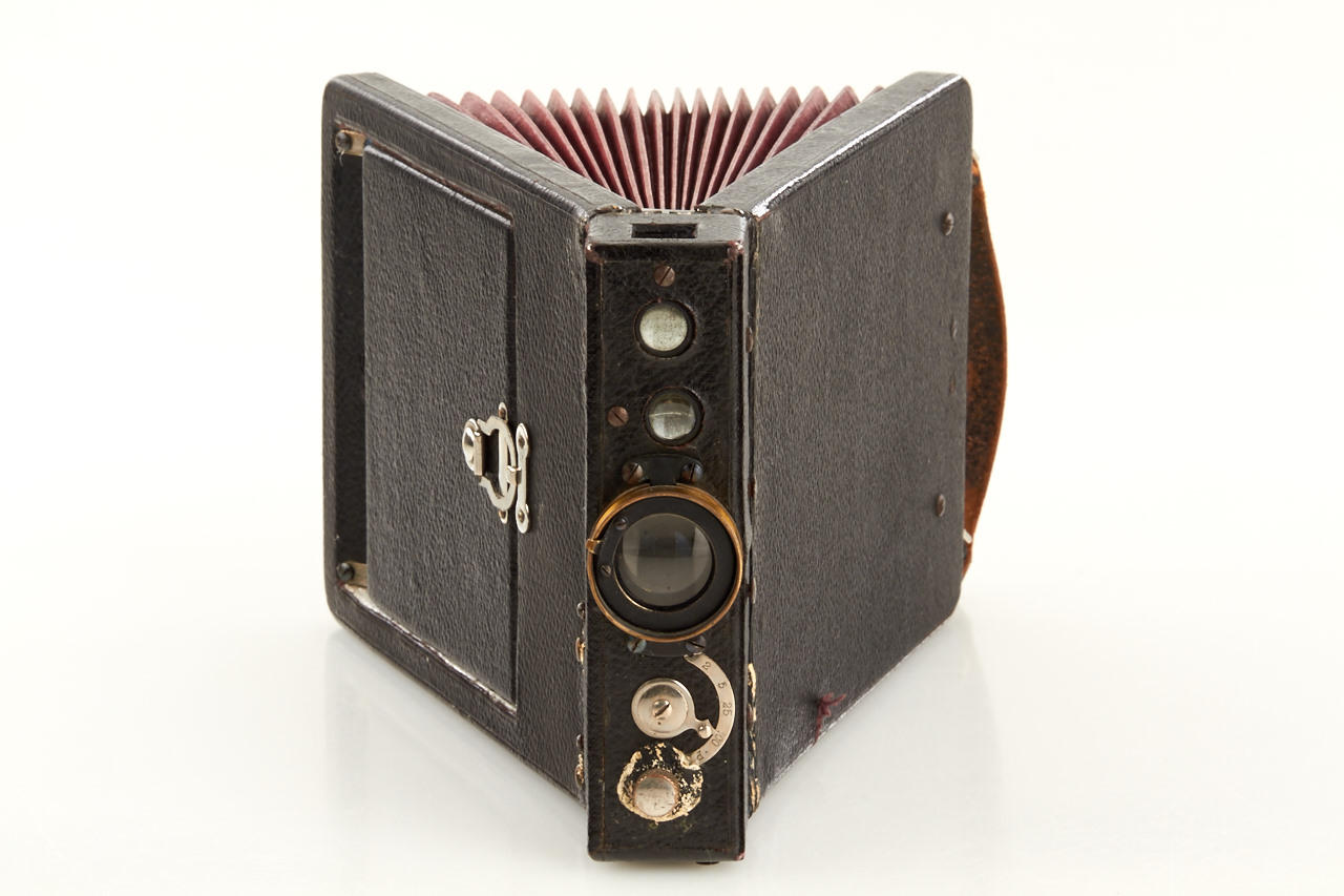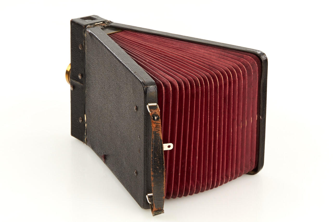 9x12cm, for plate film packs, red leather bellows, Aplanat lens, guillotine shutter 1/2-1/100, in working order, rare version of this book-type camera in good condition