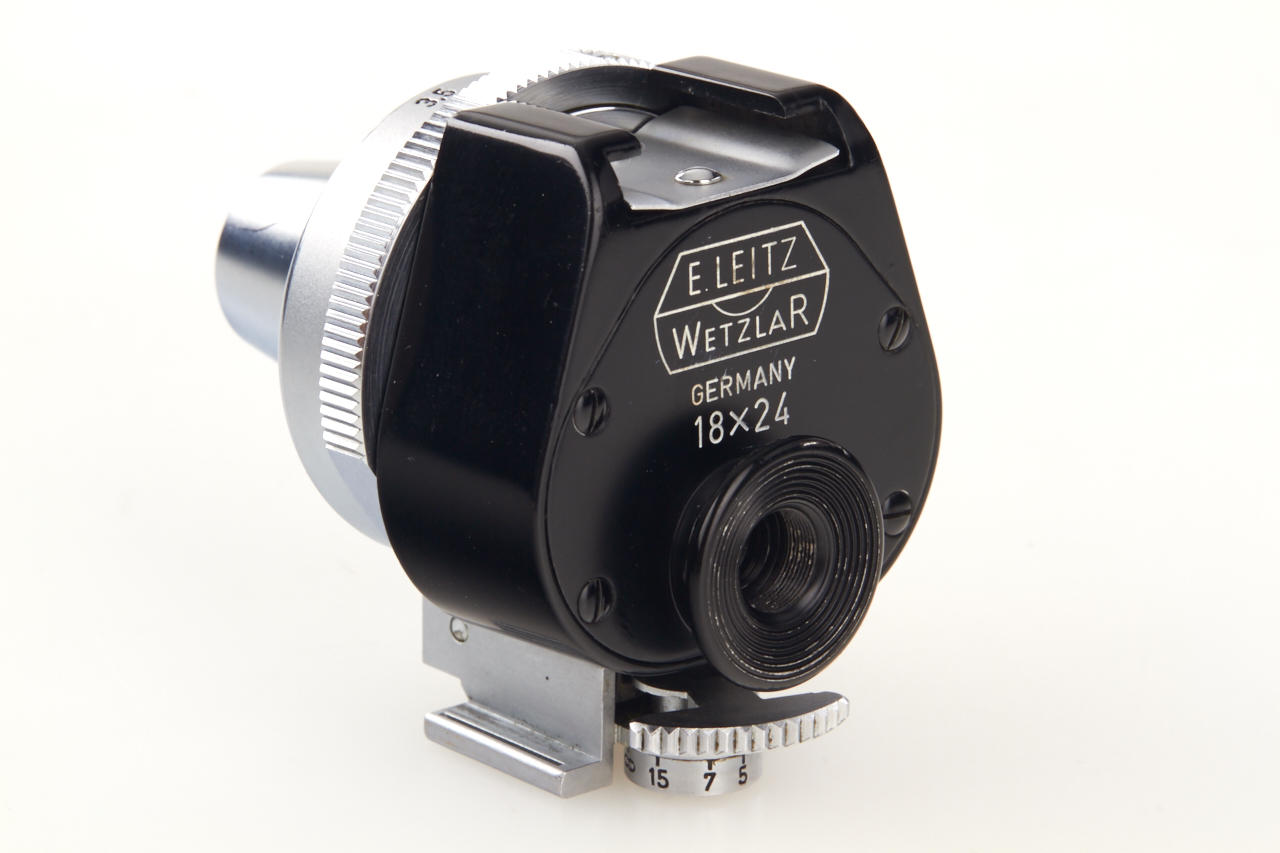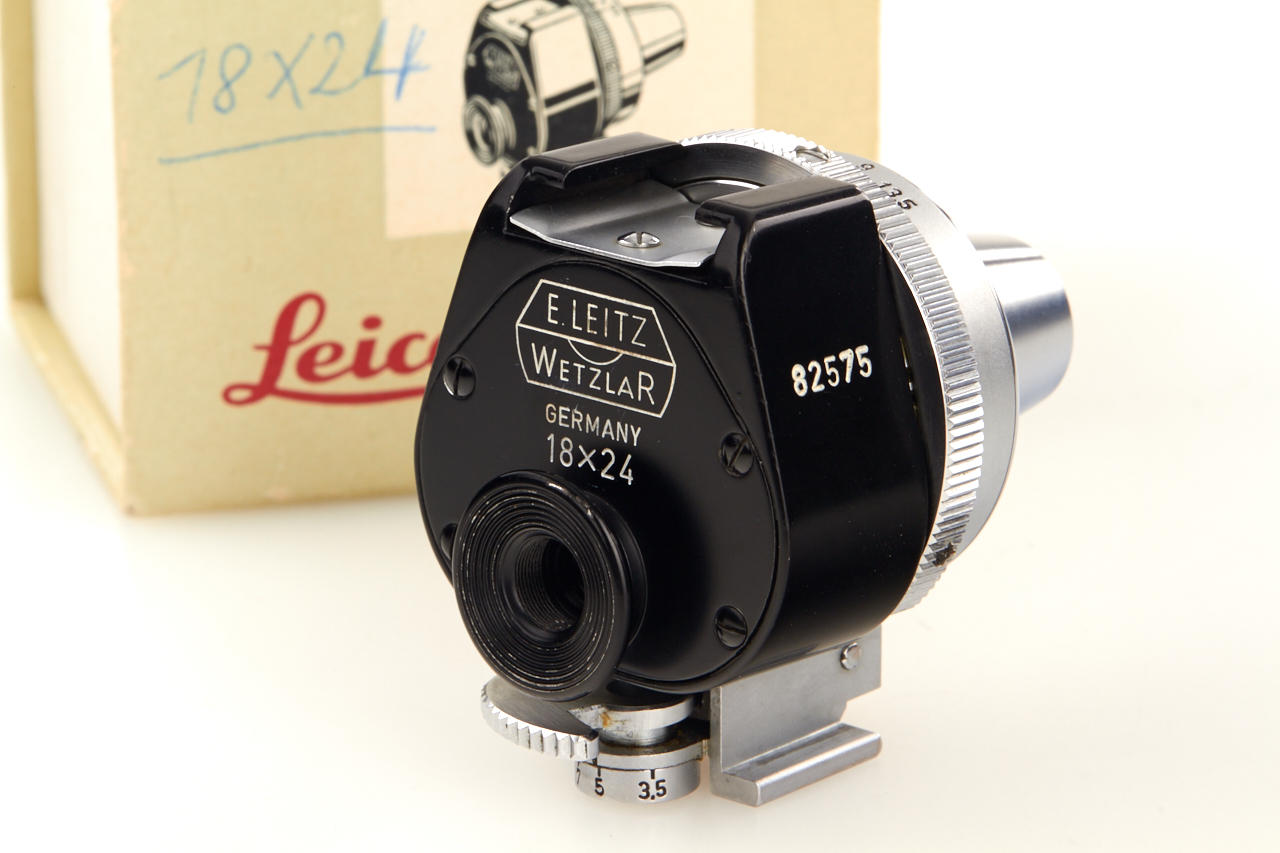 near mint and extremely rare VIOOH universal finder for 18x24 (Half Frame), engraved 'E.LEITZ WETZLAR GERMANY 18x24' on rear, this finder was developed to use 3.5cm - 13.5cm lenses with the Leica 72, including maker's box - one other specimen (no.87634) is illustrated in 'Lager Volume III' page 24 and came from the Leitz Museum - ex Dr. Günter Kisselbach collection