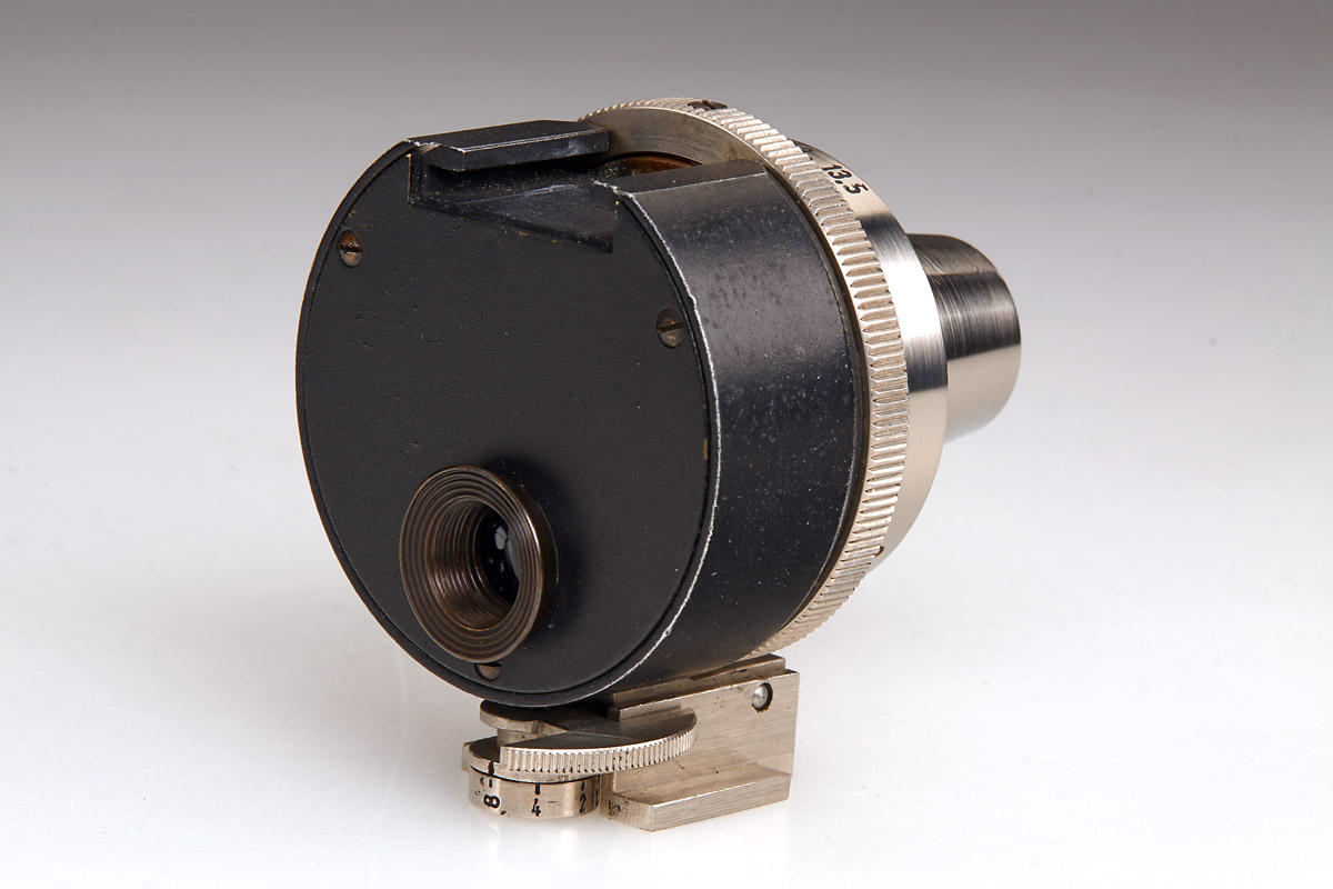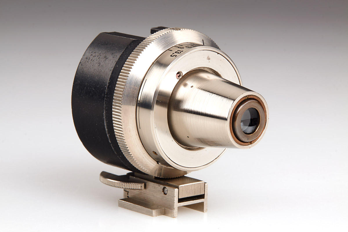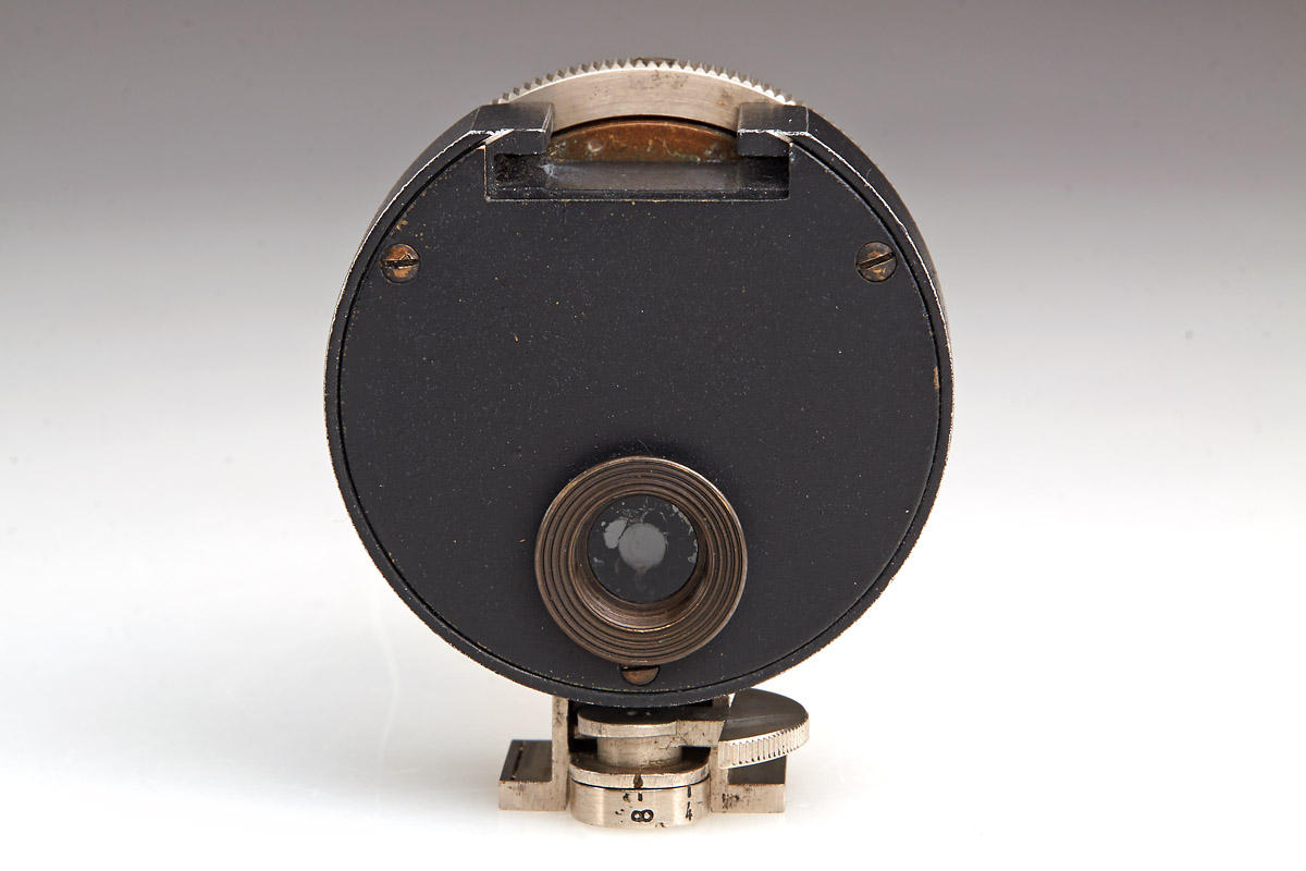Extremely rare round VIOOH, black/nickel, in perfect condition. Without engravings, in red maker’s box. LITERATURE James L. Lager (ed.), Leica Illustrated History, Vol. III, 1998, p. 24. Auxiliary viewfinders have always been a part of the Leica system since the first Leica camera with interchangeable lens mount appeared in 1930. There have been various models of Leica viewfinders since and their variations seem infinite. Leica viewfinders have become a collectors’ field of their own, and collections with more than 100 different finders are not unusual. Multifocal finders were first introduced as the so-called “torpedo” finders in 1931, equipped with a line-drawn glass plate showing fields of view for specific combinations of lenses. After that, the VIDOM universal finder with adjustable masking device was introduced in 1932. Like the torpedo finders, the VIDOM also still produced a reversed image. A substantial improvement was achieved with the introduction of the VIOOH universal finder with its laterally correct image in 1939. Quite a number of variations of the VIOOH itself have been reported, from which the round-bodied version seems to be the most mysterious: it was never announced in any Leitz publication and appears to be a prototype. Only a very few specimens are known to exist. Seit das erste Leica Modell mit auswechselbaren Objektiven im Jahr 1930 erschien, sind Zubehörsucher ein fester Bestandteil des Leica Systems. Es wurden zahlreiche verschiedene Modelle über die Jahrzehnte gefertigt und deren Bandbreite an Variationen scheint unendlich. Leica Sucher haben sich zu einem eigenständigen Sammelgebiet entwickelt und es ist nicht ungewöhnlich, mehr als 100 verschiedene Sucher in einer Sammlung zu finden. Universalsucher existieren seit der Einführung der sogenannten „Torpedo“-Sucher im Jahr 1931. Diese waren mit einer Strichplatte ausgestattet, die eine Kombination mehrerer Begrenzungsrahmen für den Bildausschnitt unterschiedlicher Brennweiten anzeigte. Der erste Universalsucher mit verstellbarer Bildmaske hieß VIDOM und wurde 1932 eingeführt. Der VIDOM zeigte – wie auch die Torpedo Sucher – ein noch seitenverkehrtes Bild an. Eine wesentliche Verbesserung wurde schließlich im Jahr 1939 mit der Einführung des VIOOH Universalsuchers erreicht, der ein seitenrichtiges Bild anzeigte. Eine Reihe an Varianten selbst des VIDOM Suchers alleine ist heute bekannt, von denen die Version mit dem runden Gehäuse wohl die rätselhafteste ist: Sie taucht in keiner Leitz Publikation auf und stellt wohl einen Prototypen dar. Es sind lediglich wenige einzelne Exemplare bekannt.