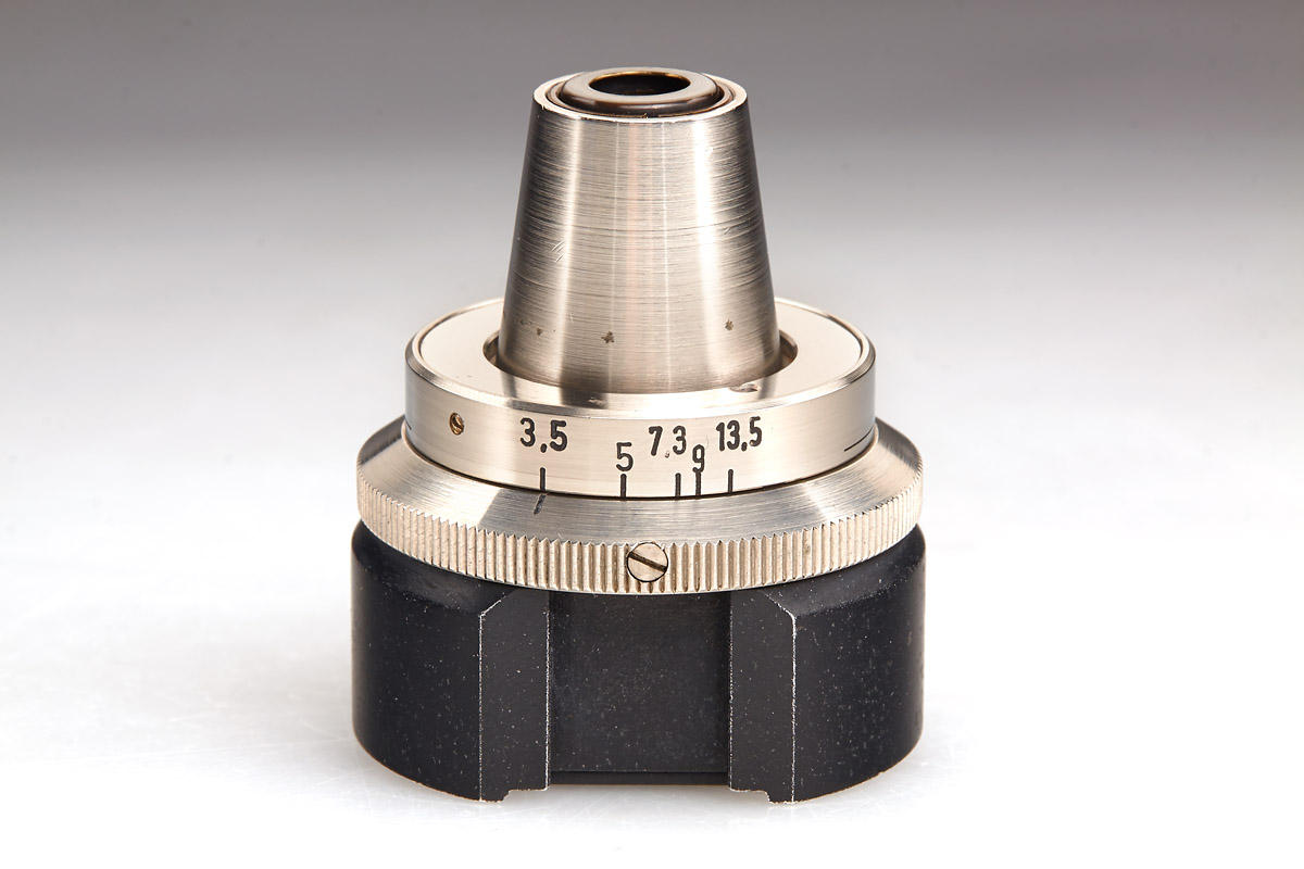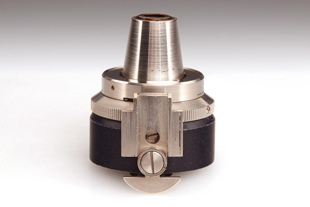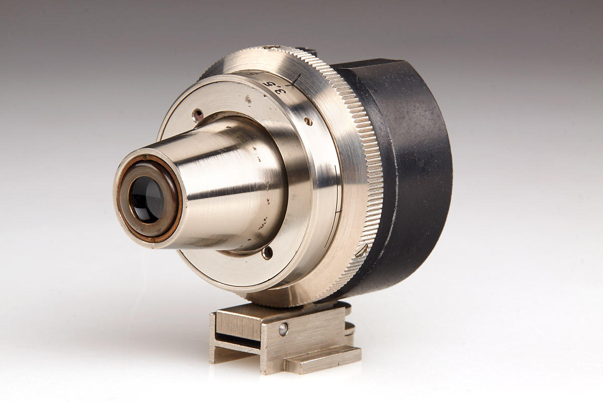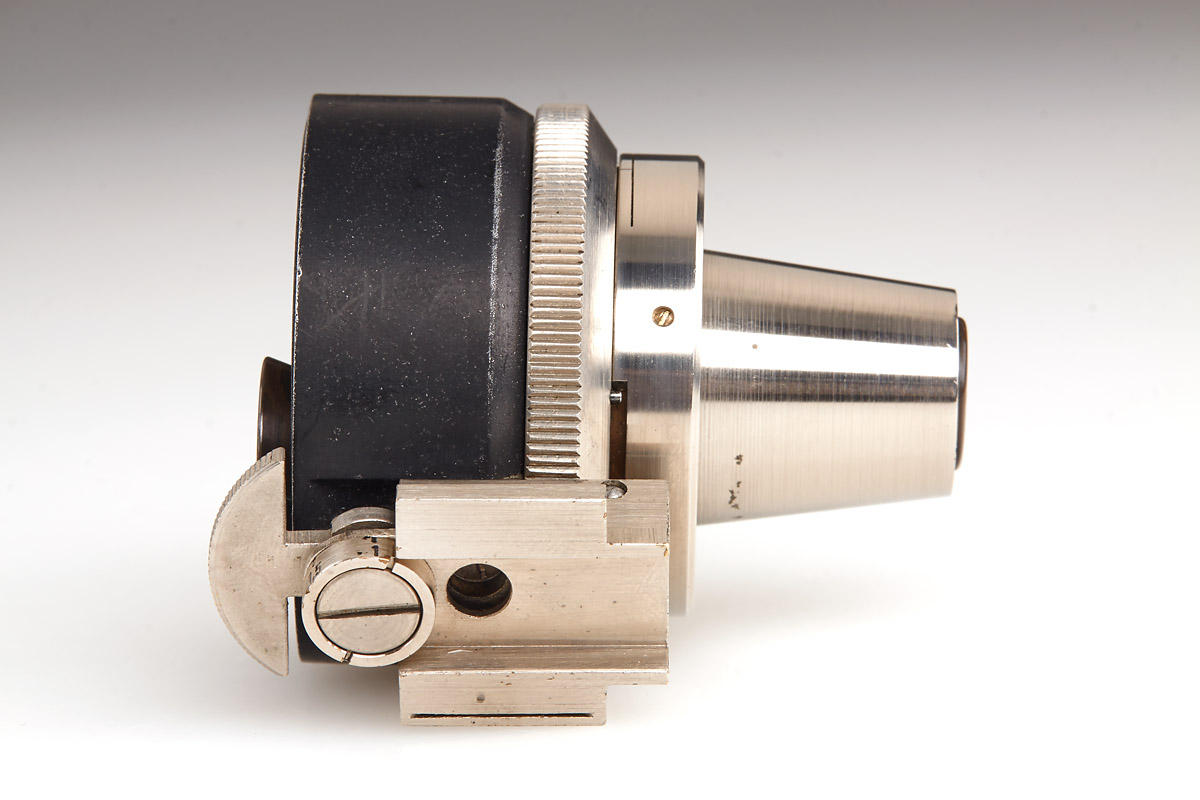 Extremely rare round VIOOH, black/nickel, in perfect condition. Without engravings, in red maker’s box. LITERATURE James L. Lager (ed.), Leica Illustrated History, Vol. III, 1998, p. 24. Auxiliary viewfinders have always been a part of the Leica system since the first Leica camera with interchangeable lens mount appeared in 1930. There have been various models of Leica viewfinders since and their variations seem infinite. Leica viewfinders have become a collectors’ field of their own, and collections with more than 100 different finders are not unusual. Multifocal finders were first introduced as the so-called “torpedo” finders in 1931, equipped with a line-drawn glass plate showing fields of view for specific combinations of lenses. After that, the VIDOM universal finder with adjustable masking device was introduced in 1932. Like the torpedo finders, the VIDOM also still produced a reversed image. A substantial improvement was achieved with the introduction of the VIOOH universal finder with its laterally correct image in 1939. Quite a number of variations of the VIOOH itself have been reported, from which the round-bodied version seems to be the most mysterious: it was never announced in any Leitz publication and appears to be a prototype. Only a very few specimens are known to exist. Seit das erste Leica Modell mit auswechselbaren Objektiven im Jahr 1930 erschien, sind Zubehörsucher ein fester Bestandteil des Leica Systems. Es wurden zahlreiche verschiedene Modelle über die Jahrzehnte gefertigt und deren Bandbreite an Variationen scheint unendlich. Leica Sucher haben sich zu einem eigenständigen Sammelgebiet entwickelt und es ist nicht ungewöhnlich, mehr als 100 verschiedene Sucher in einer Sammlung zu finden. Universalsucher existieren seit der Einführung der sogenannten „Torpedo“-Sucher im Jahr 1931. Diese waren mit einer Strichplatte ausgestattet, die eine Kombination mehrerer Begrenzungsrahmen für den Bildausschnitt unterschiedlicher Brennweiten anzeigte. Der erste Universalsucher mit verstellbarer Bildmaske hieß VIDOM und wurde 1932 eingeführt. Der VIDOM zeigte – wie auch die Torpedo Sucher – ein noch seitenverkehrtes Bild an. Eine wesentliche Verbesserung wurde schließlich im Jahr 1939 mit der Einführung des VIOOH Universalsuchers erreicht, der ein seitenrichtiges Bild anzeigte. Eine Reihe an Varianten selbst des VIDOM Suchers alleine ist heute bekannt, von denen die Version mit dem runden Gehäuse wohl die rätselhafteste ist: Sie taucht in keiner Leitz Publikation auf und stellt wohl einen Prototypen dar. Es sind lediglich wenige einzelne Exemplare bekannt.