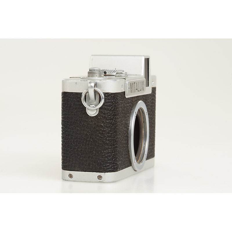Leitz prototype of a 18x24mm half-frame camera with large built in bright line viewfinder and metal focal plane shutter, film winding system similar to Meopta Mikroma with a sliding rail on the back under the top plate, still all parts by Leitz, 32mm lens thread mount, chrome painted top and base plate, this is the only known Leitz VITALUX half frame prototype - it never went into production (as the famous Leica BOX and the Leica-H) - ex Paul-Henry van Hasbroeck collection