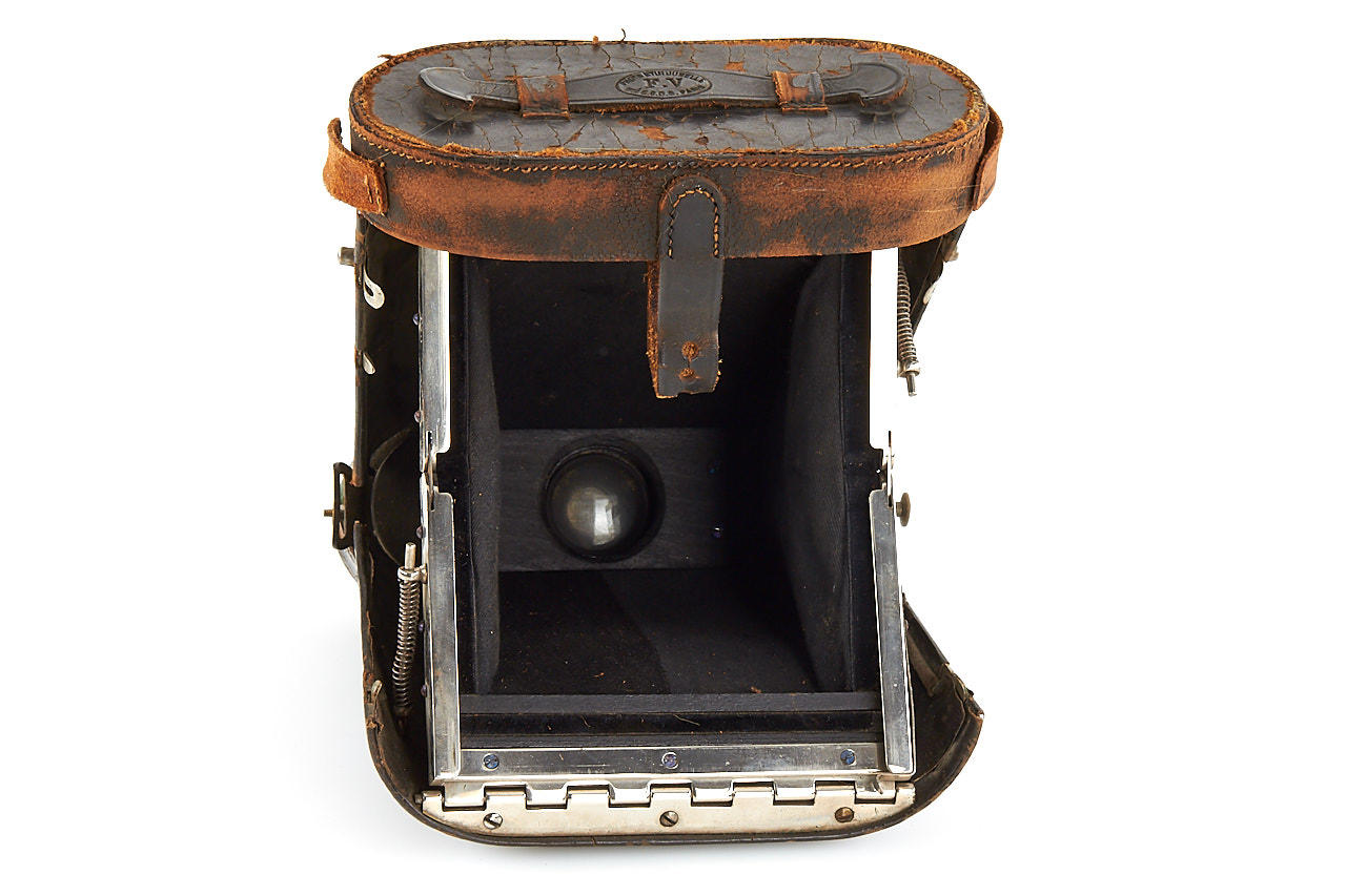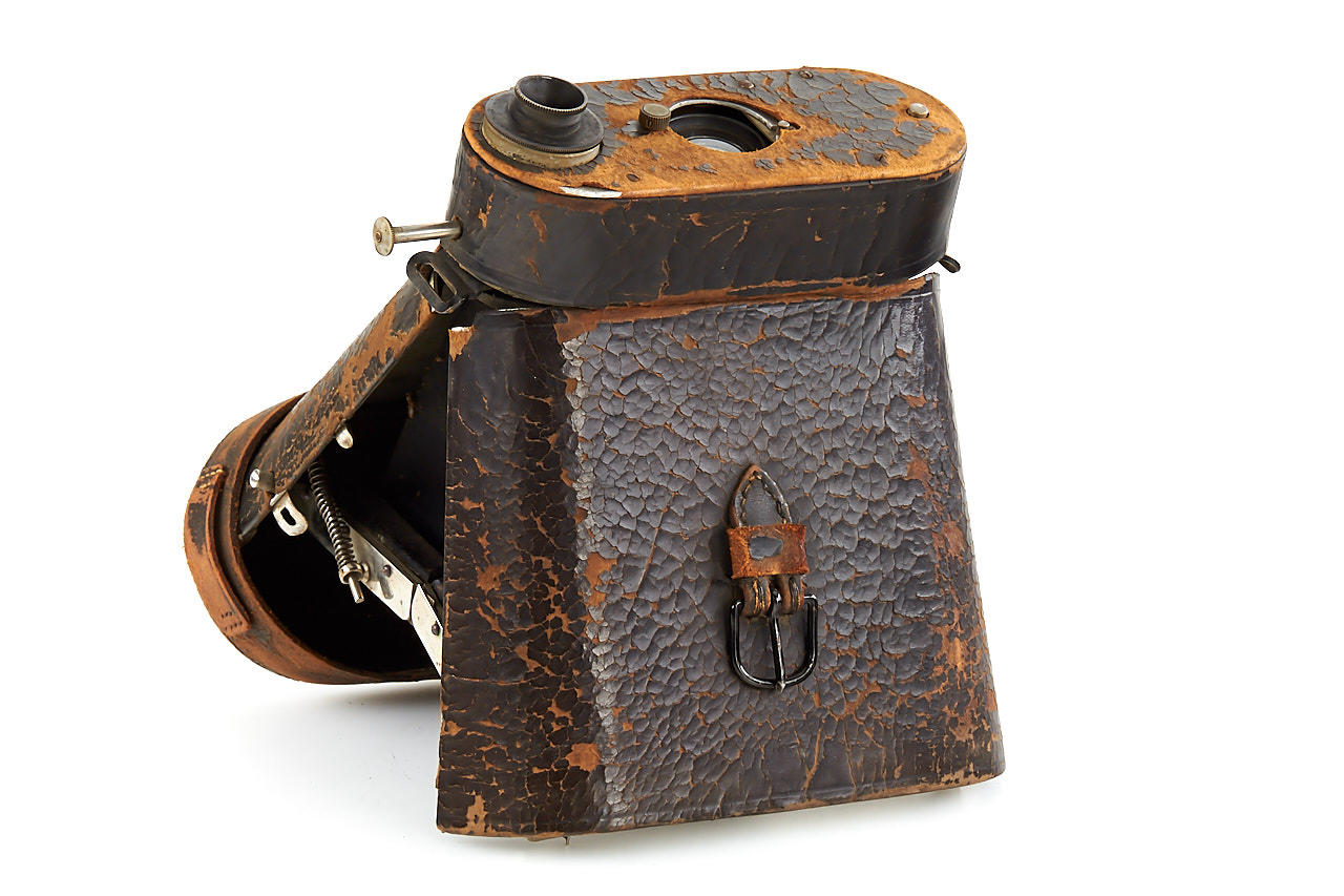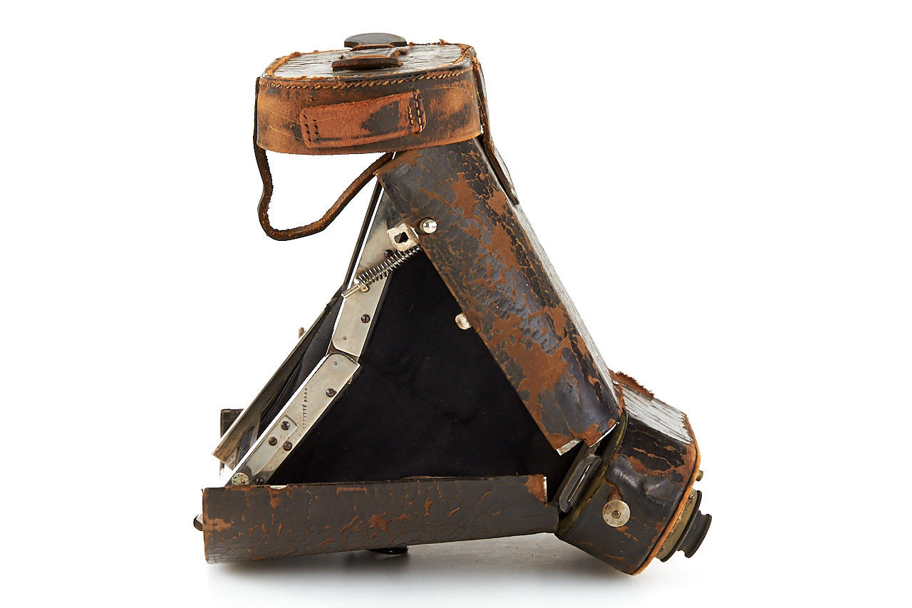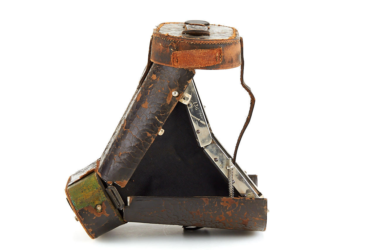 Detective camera disguised as a binocular case. Patented in 1891 by Franck Valéry. The metal body is covered with leather. To use the camera, you open the cover of the 'binocular case' and spread the two sides apart. Two struts hold the back open and accept a film holder. These cameras were made for only a short time, with limited sale success. Very few examples have survived. The leather covering is worn with few parts missing and the shutter needs maintenance, still it is one of the rarest of the disguised cameras and a rare collector's opportunity.