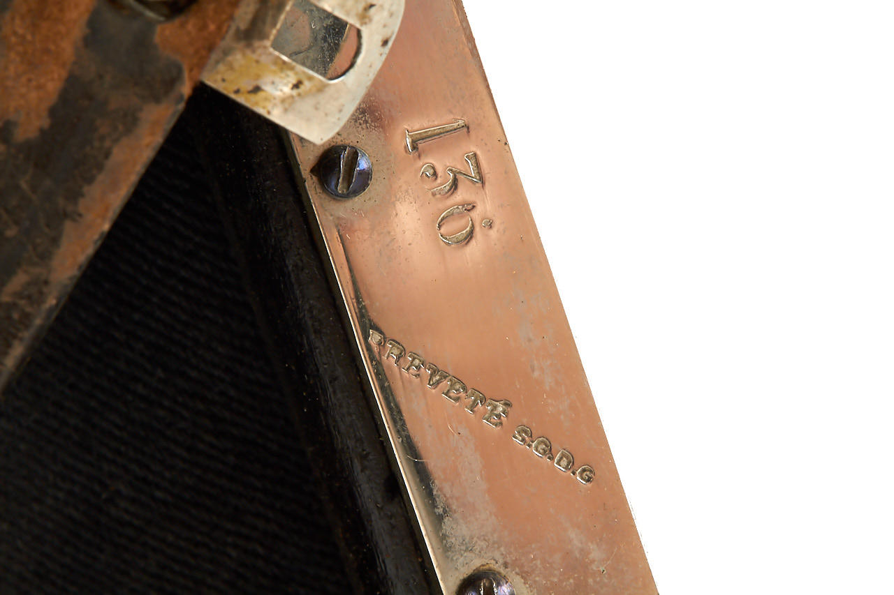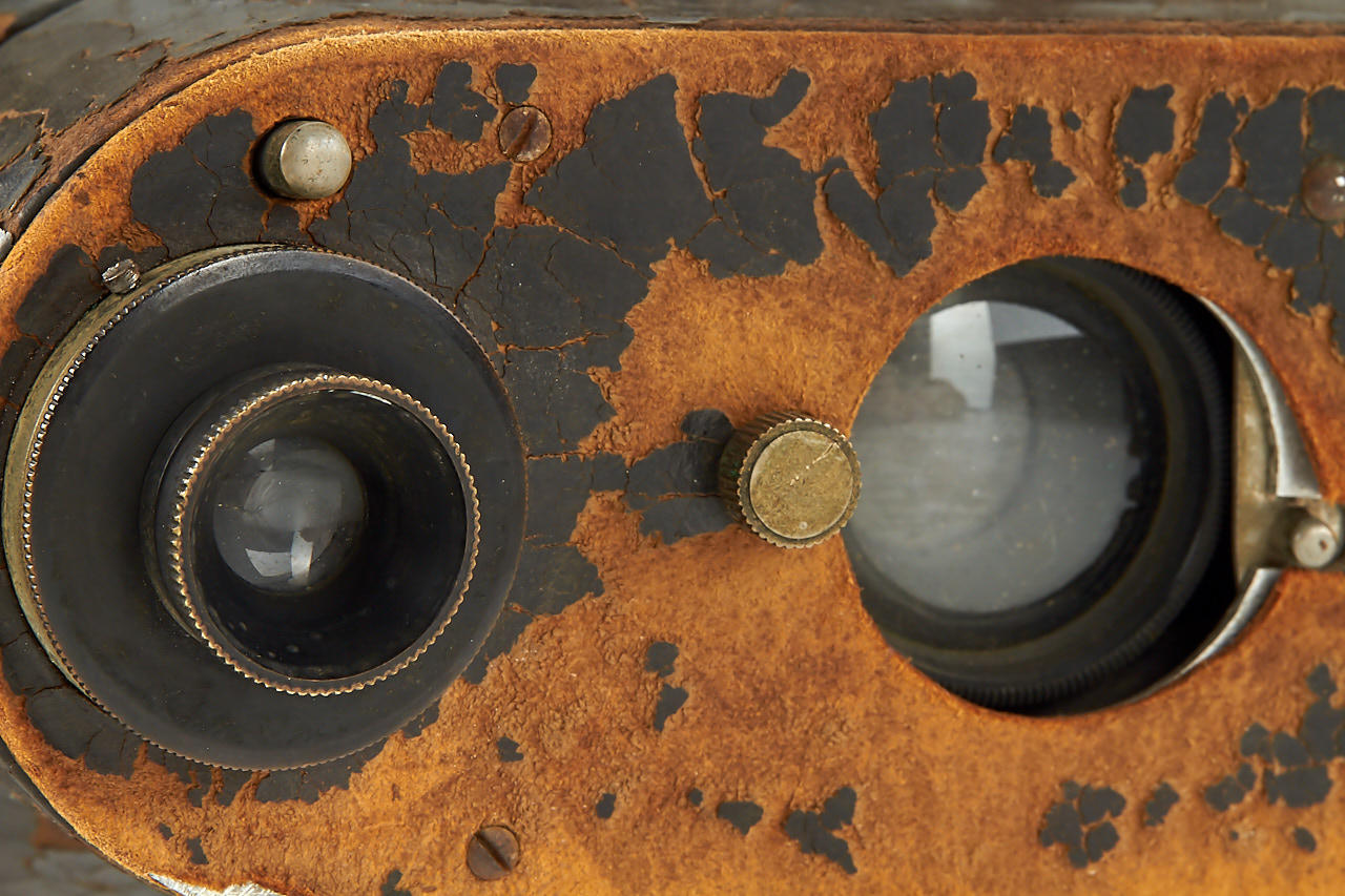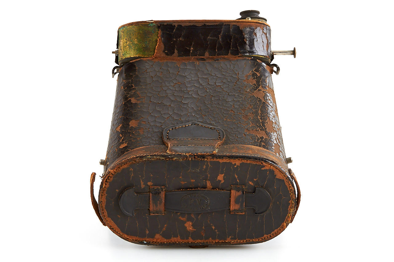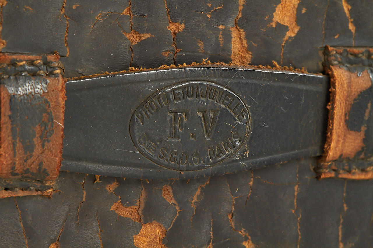 Detective camera disguised as a binocular case. Patented in 1891 by Franck Valéry. The metal body is covered with leather. To use the camera, you open the cover of the 'binocular case' and spread the two sides apart. Two struts hold the back open and accept a film holder. These cameras were made for only a short time, with limited sale success. Very few examples have survived. The leather covering is worn with few parts missing and the shutter needs maintenance, still it is one of the rarest of the disguised cameras and a rare collector's opportunity.