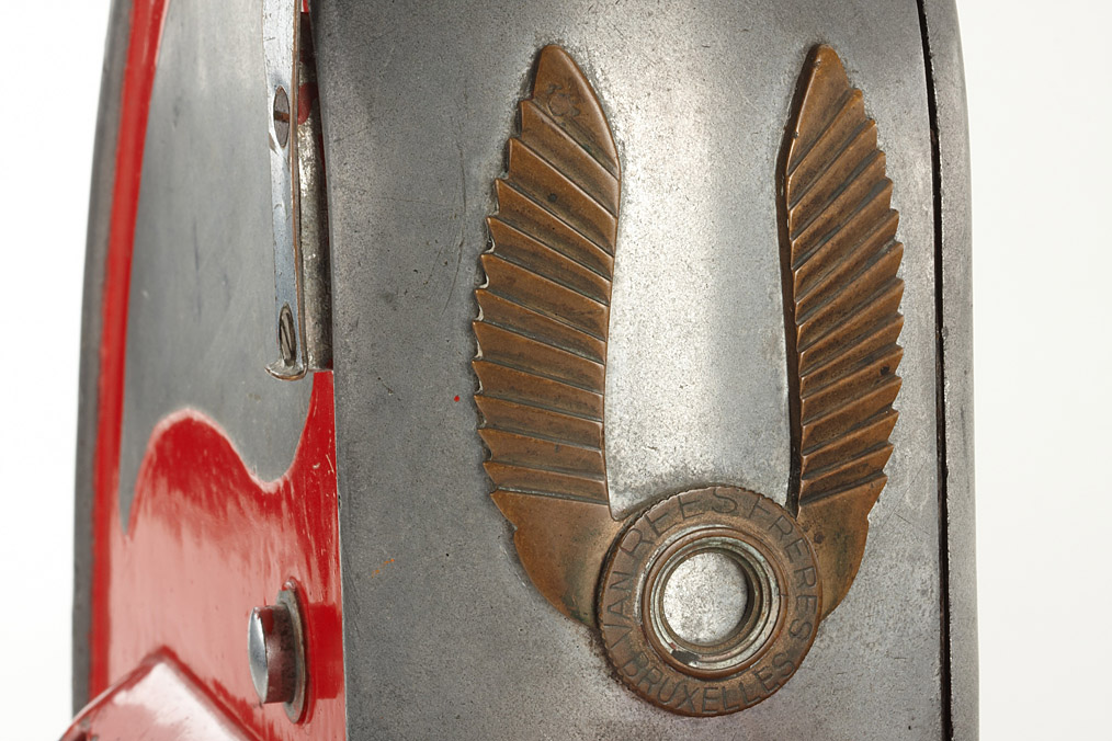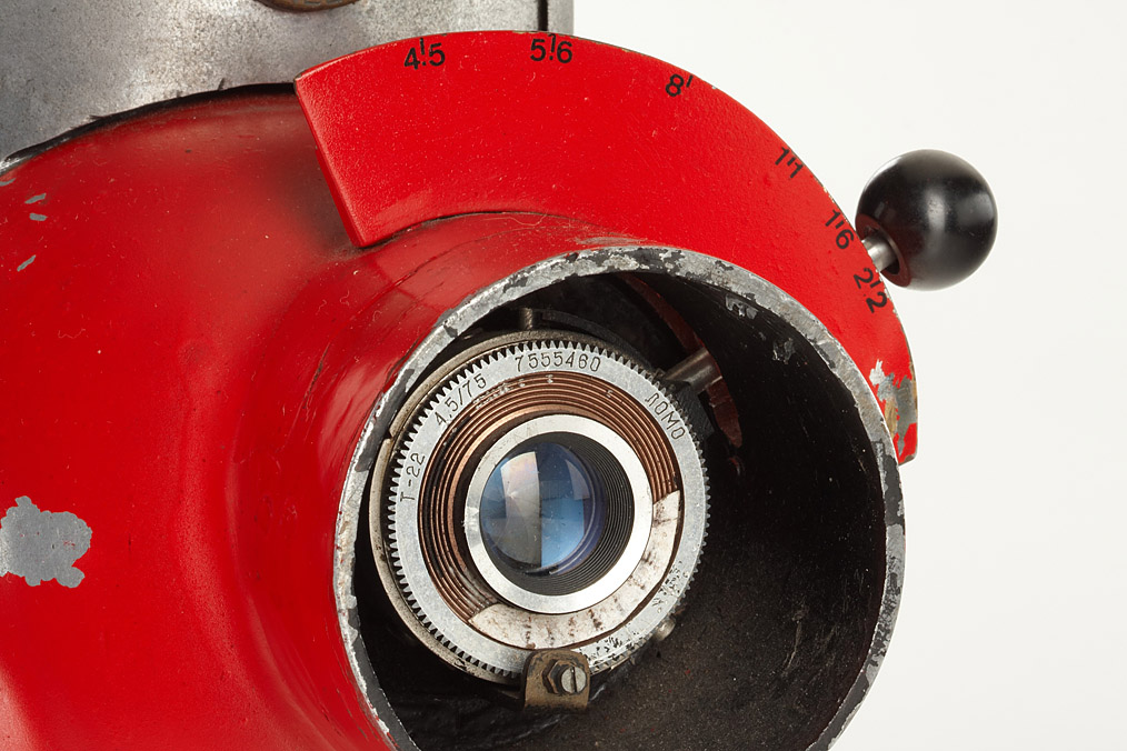 the first of the extremely rare Belgian 35mm movie camera with an extraordinary streamlined design, the camera’s body is made of polished and fire-engine red painted cast aluminium, prominently mounted on the front the winged makers label. Very little is known about the Van Rees Brothers, their company or their cameras. Only two different models are documented. Some records state that five, others that seven cameras were produced. It seems quite evident that all of them were from a small handcrafted series.