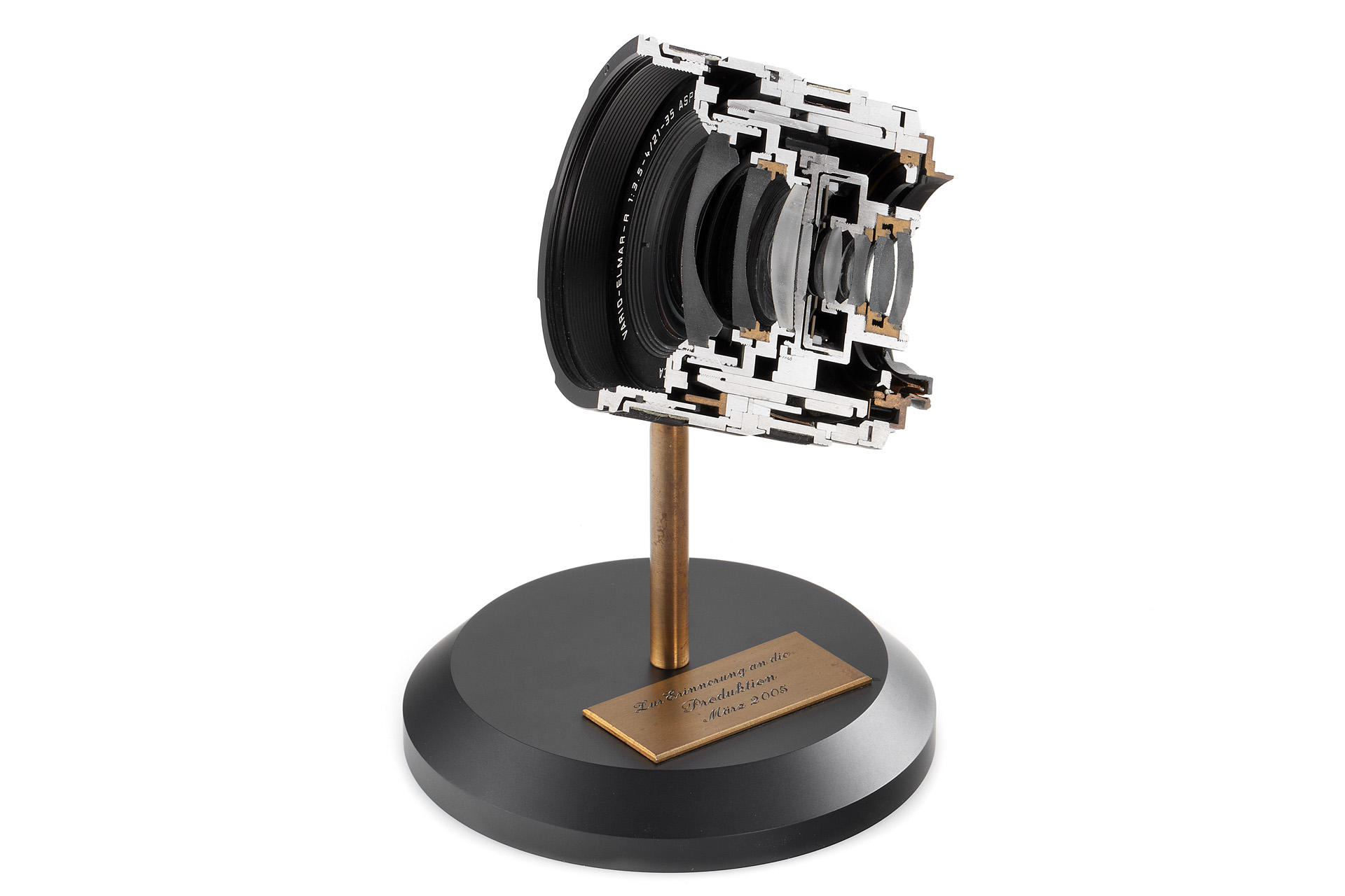 a very rare original cut-away model of the Vario-Elmar-R 3.5-4/21-35mm ASPH. lens, in mint condition, with metal stand engraved 'Zur Erinnerung an die Produktion März 2005' (to commemorate the March 2005 production)