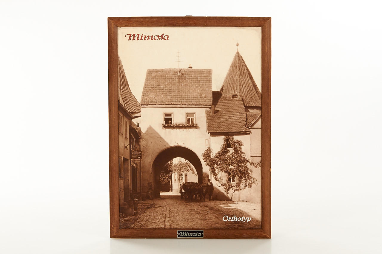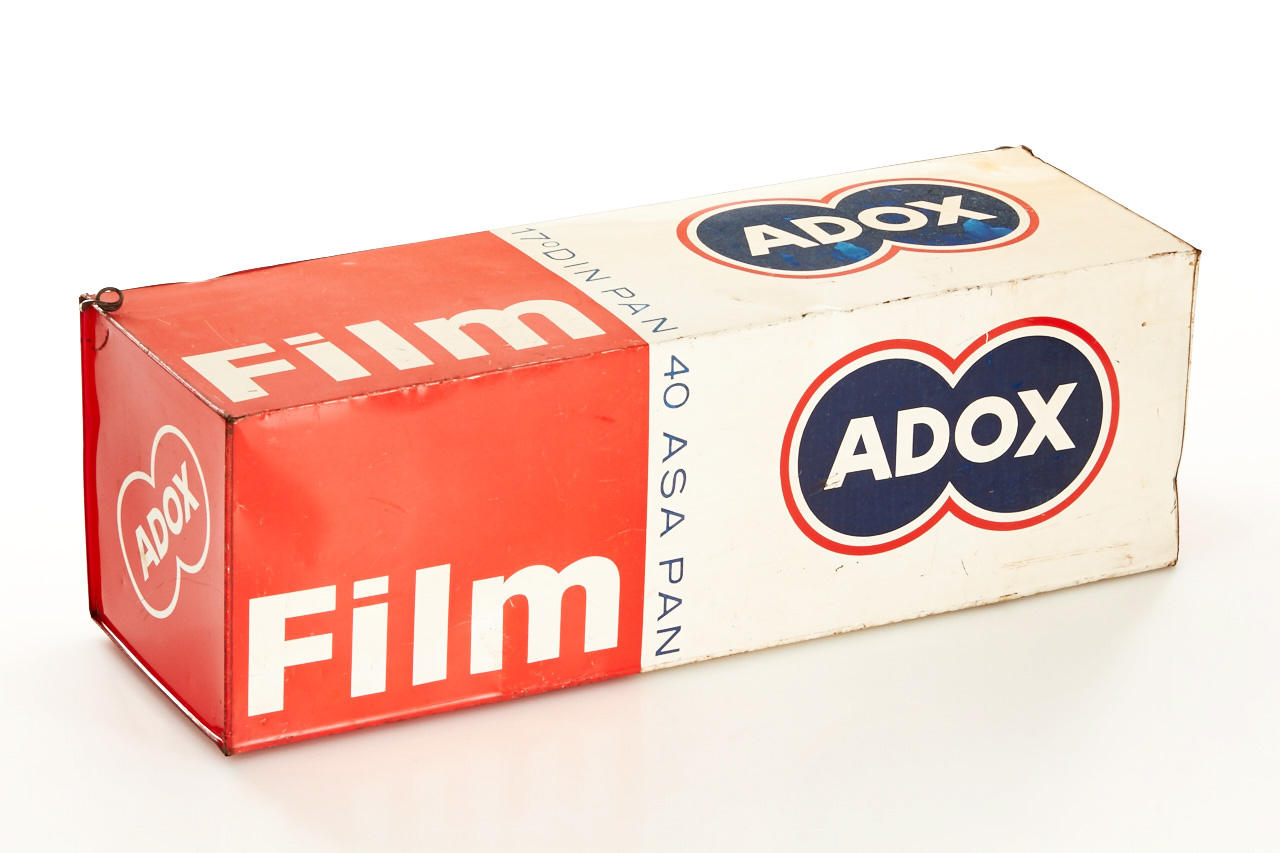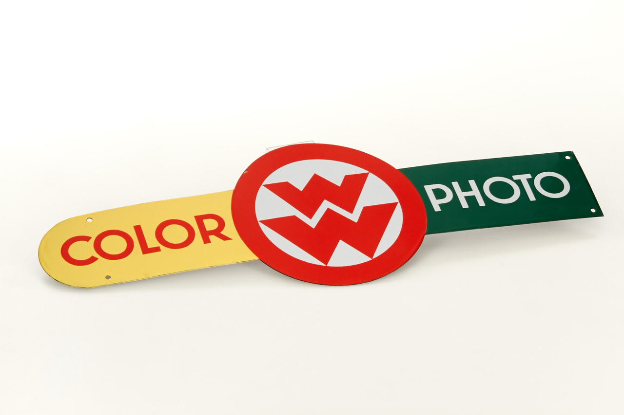 one enamel sign in very good condition 'WW color photo' (c.86x29cm), oversized metal Adox film box (condition C, c.74x24x24cm), and Mimosa Orthotyp advertising picture in original wooden frame (c.45x33cm)